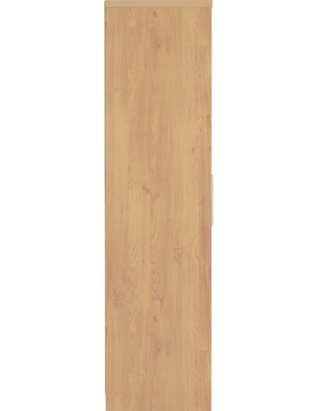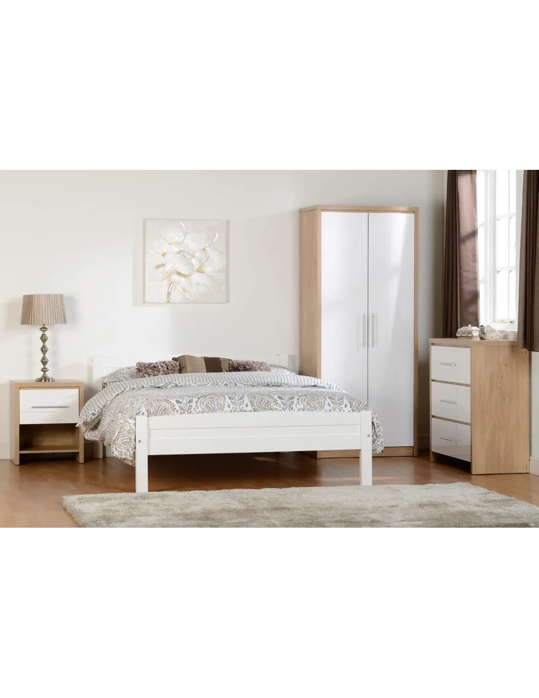 Reference: 100-101-045The Seville bedroom range is superb value for money. This Seville wardrobe has an attractive oak effect veneer frame while the door fronts are good quality high gloss white veneer. The handles are brushed steel and the fittings are metal. Inside is a hanging rail with a shelf over it. There is also space at the bottom for footwear.