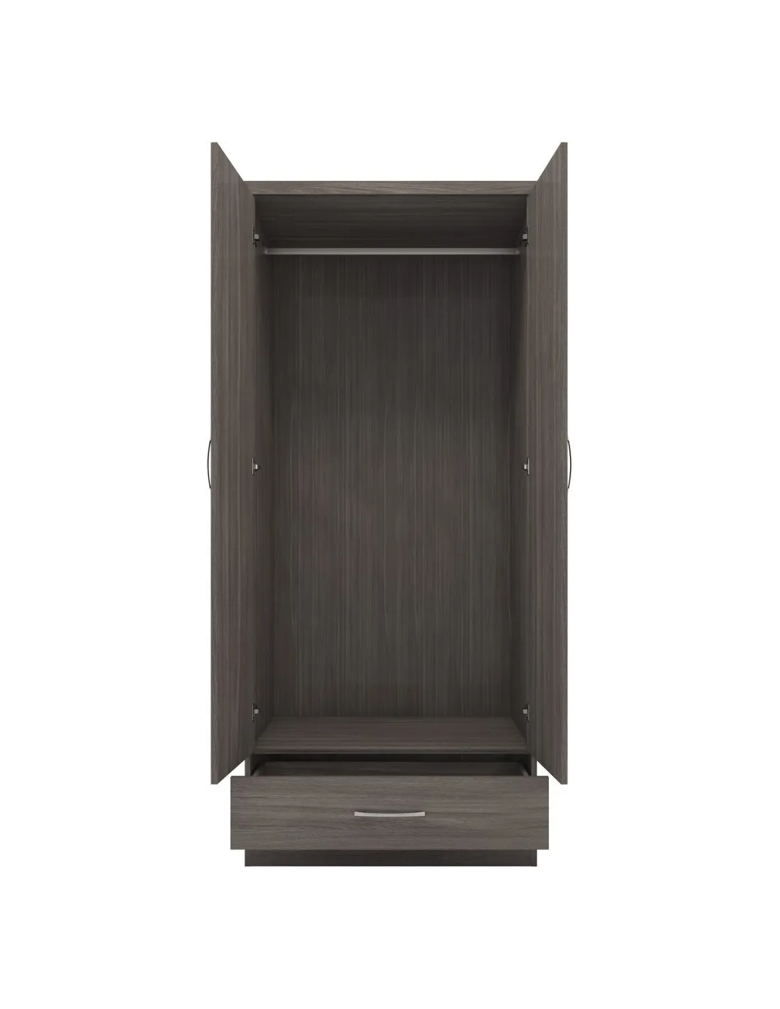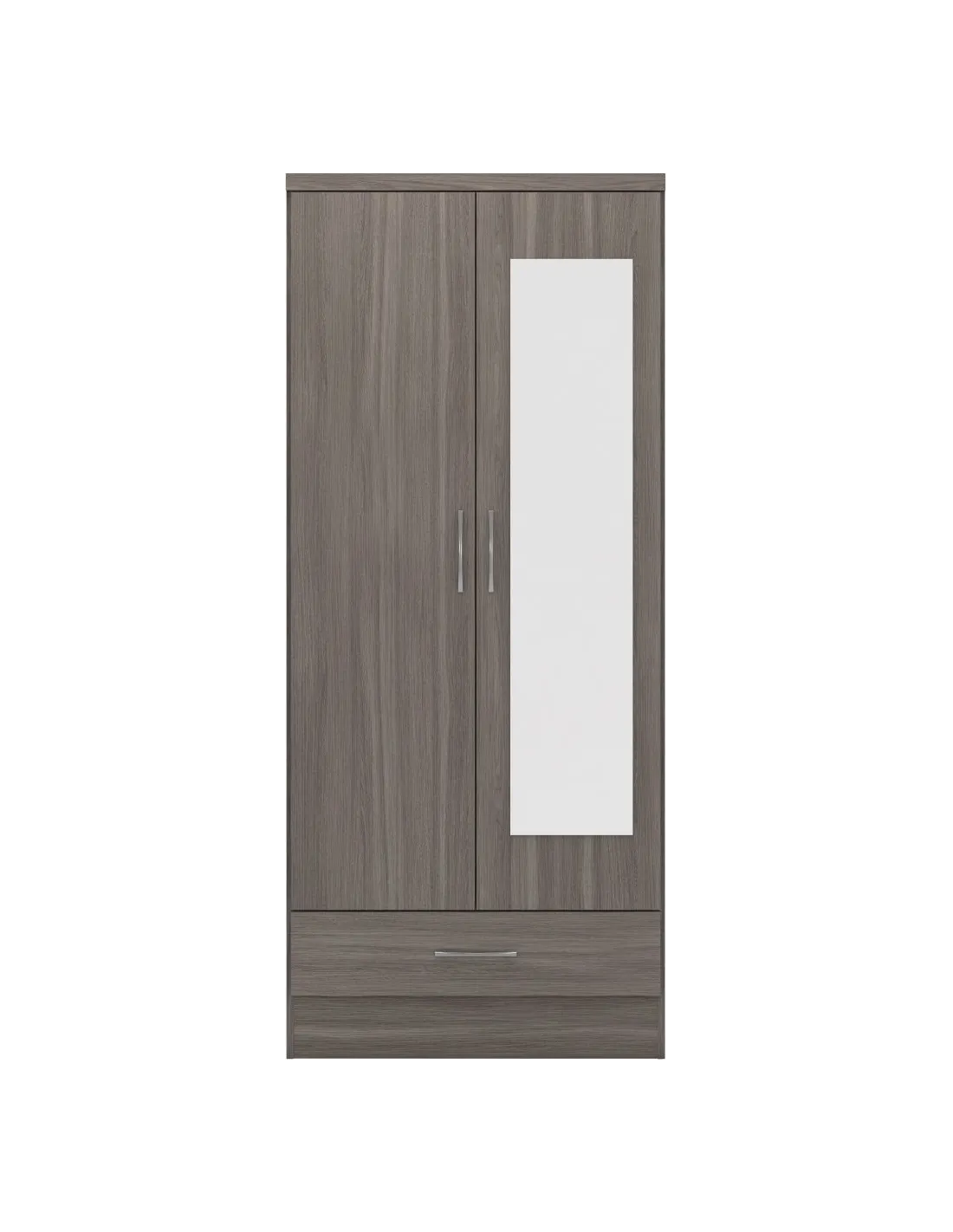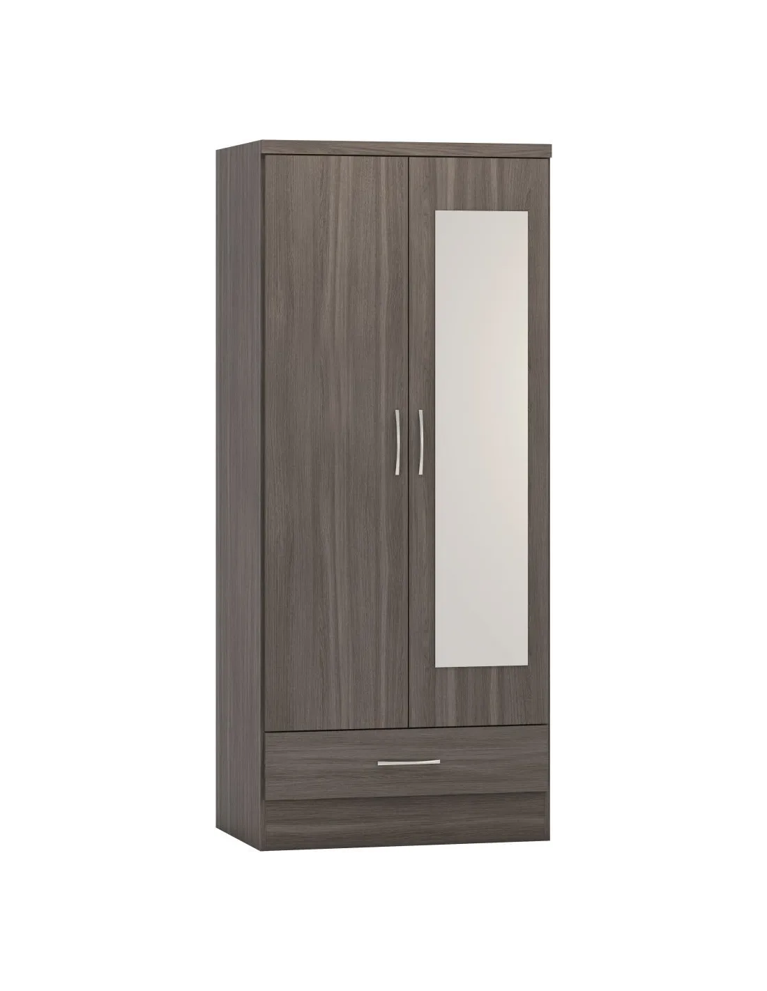 Reference: 100-101-131This Nevada 2 door wardrobe has a black wood grain finish. One of the doors is fitted with a mirror. Behind the doors is a hanging rail with space at the bottom for footwear. An external drawer provides additional storage. Silver handles finish off this wardrobe beautifully.