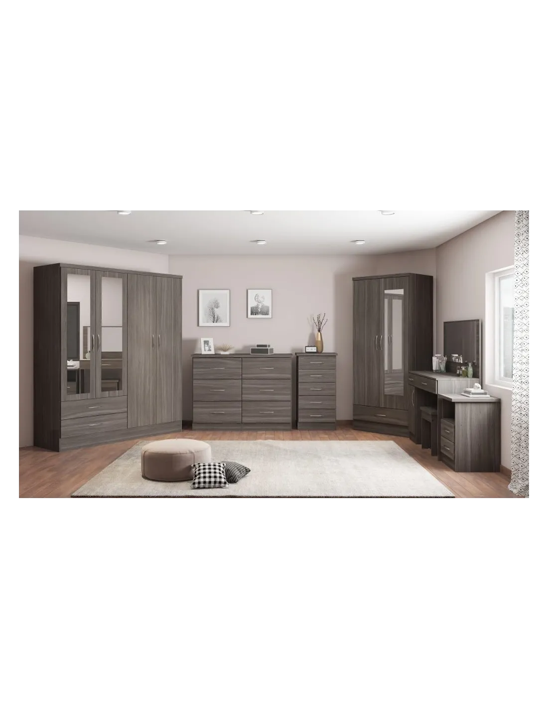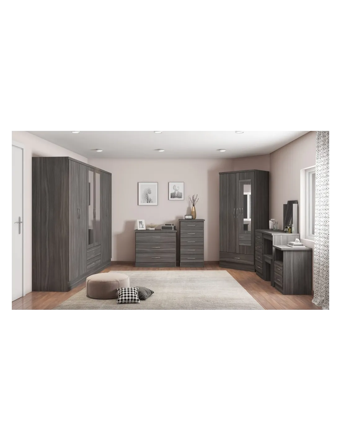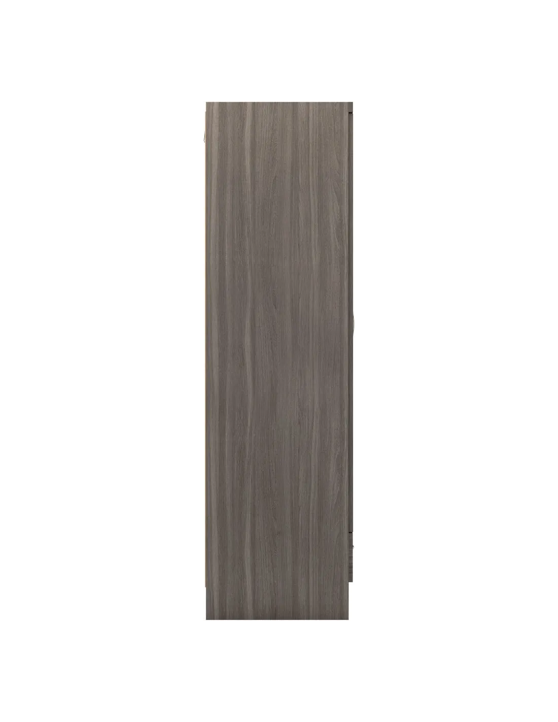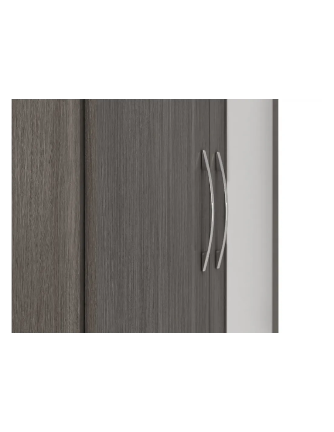 Reference: 100-101-131This Nevada 2 door wardrobe has a black wood grain finish. One of the doors is fitted with a mirror. Behind the doors is a hanging rail with space at the bottom for footwear. An external drawer provides additional storage. Silver handles finish off this wardrobe beautifully.