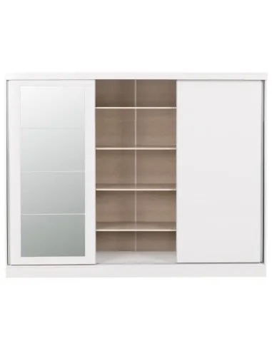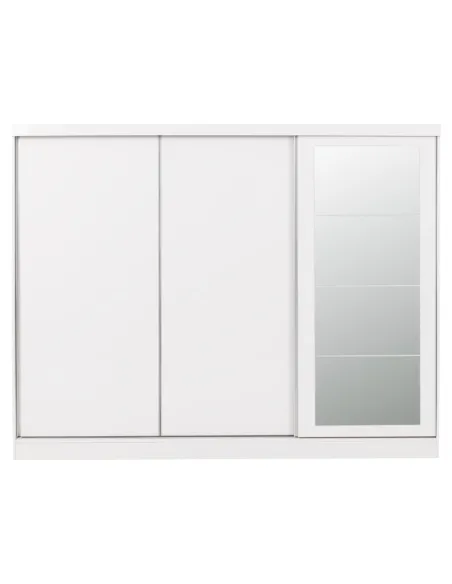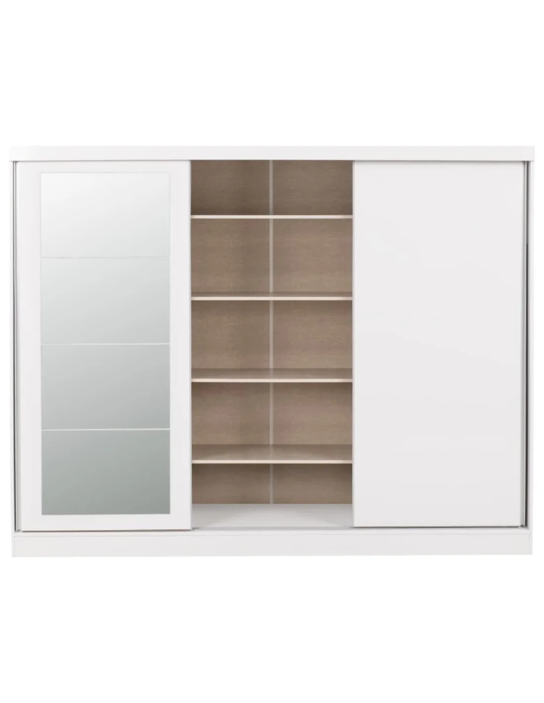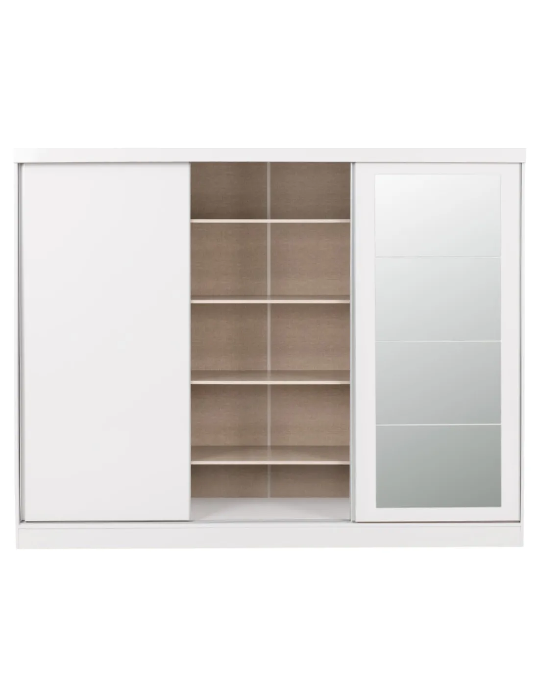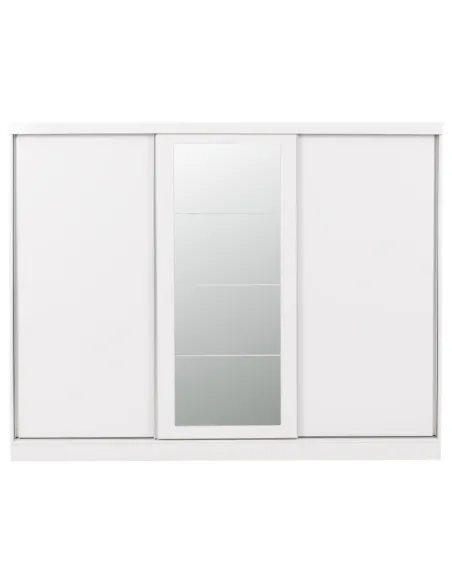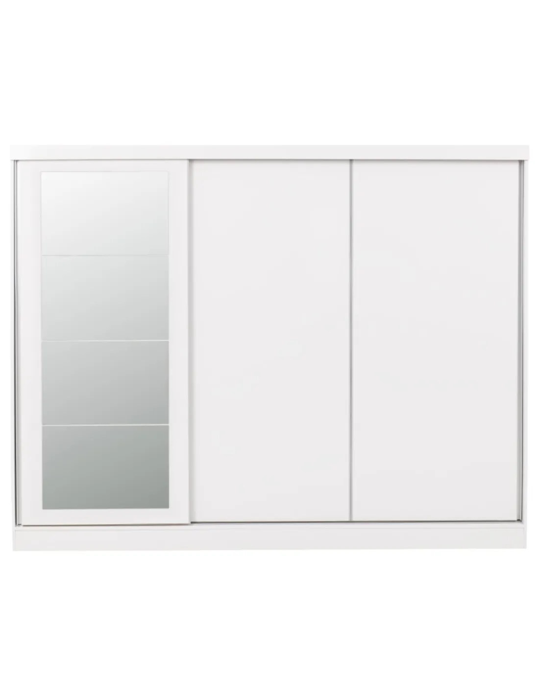 The stylish Nevada mirrored wardrobe features three sliding doors in a sleek white gloss finish. Designed for both practicality and elegance, it includes a large shelf on each side, along with a spacious hanging area for clothing. The center section offers additional shelving space, making it an excellent storage solution for any bedroom. Whether placed in a modern or traditional setting, this wardrobe adds a clean and fresh aesthetic to your interior.