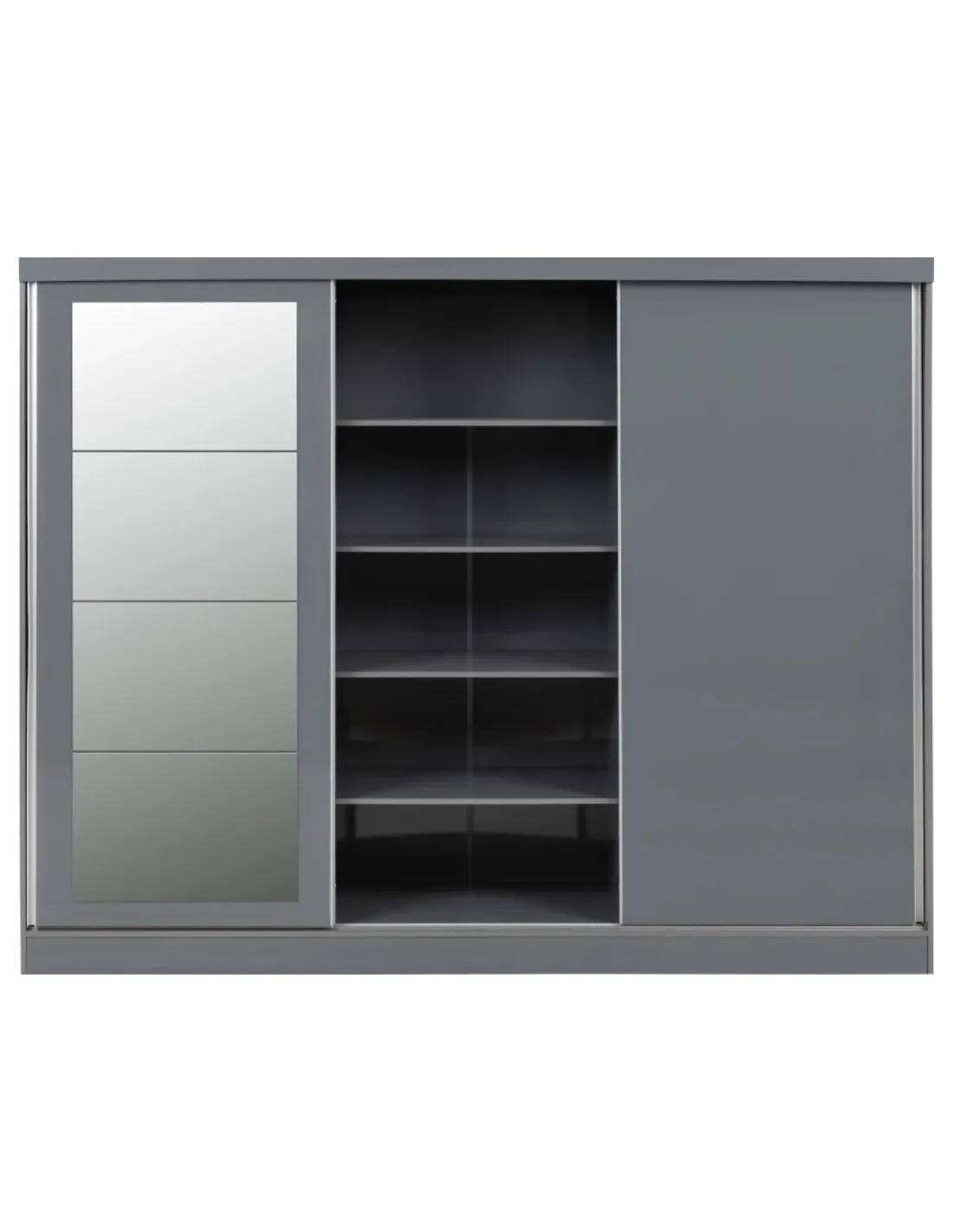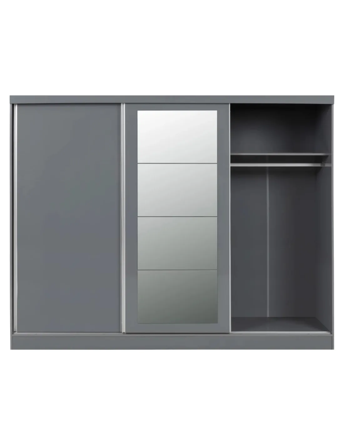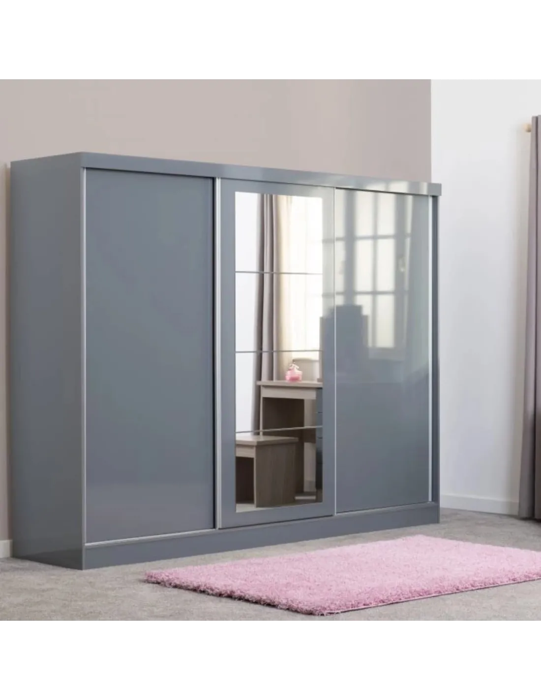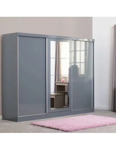 Reference: 100-101-165The Nevada Mirrored Wardrobe features a smart grey gloss finish with three sliding doors, adding a modern touch to any bedroom. Designed for both style and functionality, it includes spacious storage solutions with a combination of shelving and hanging space. Two large shelves on either side provide ample room for folded clothes or accessories, while the central section offers additional shelving for extra storage. The wardrobe's contemporary design complements both modern and traditional interiors, making it a versatile choice for any home.