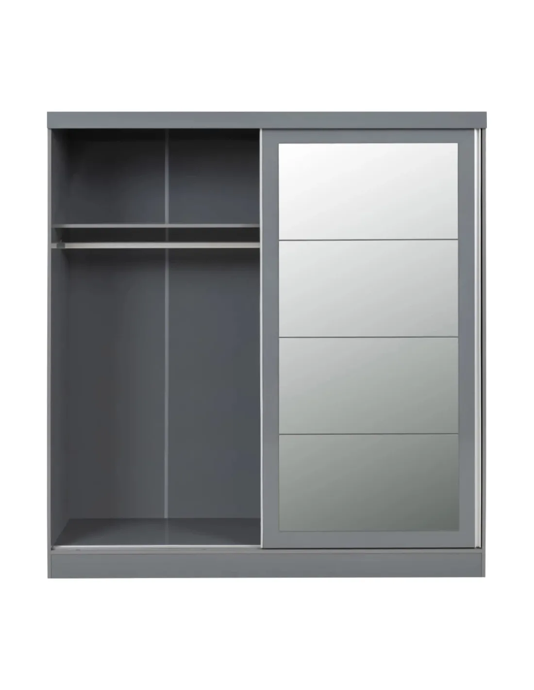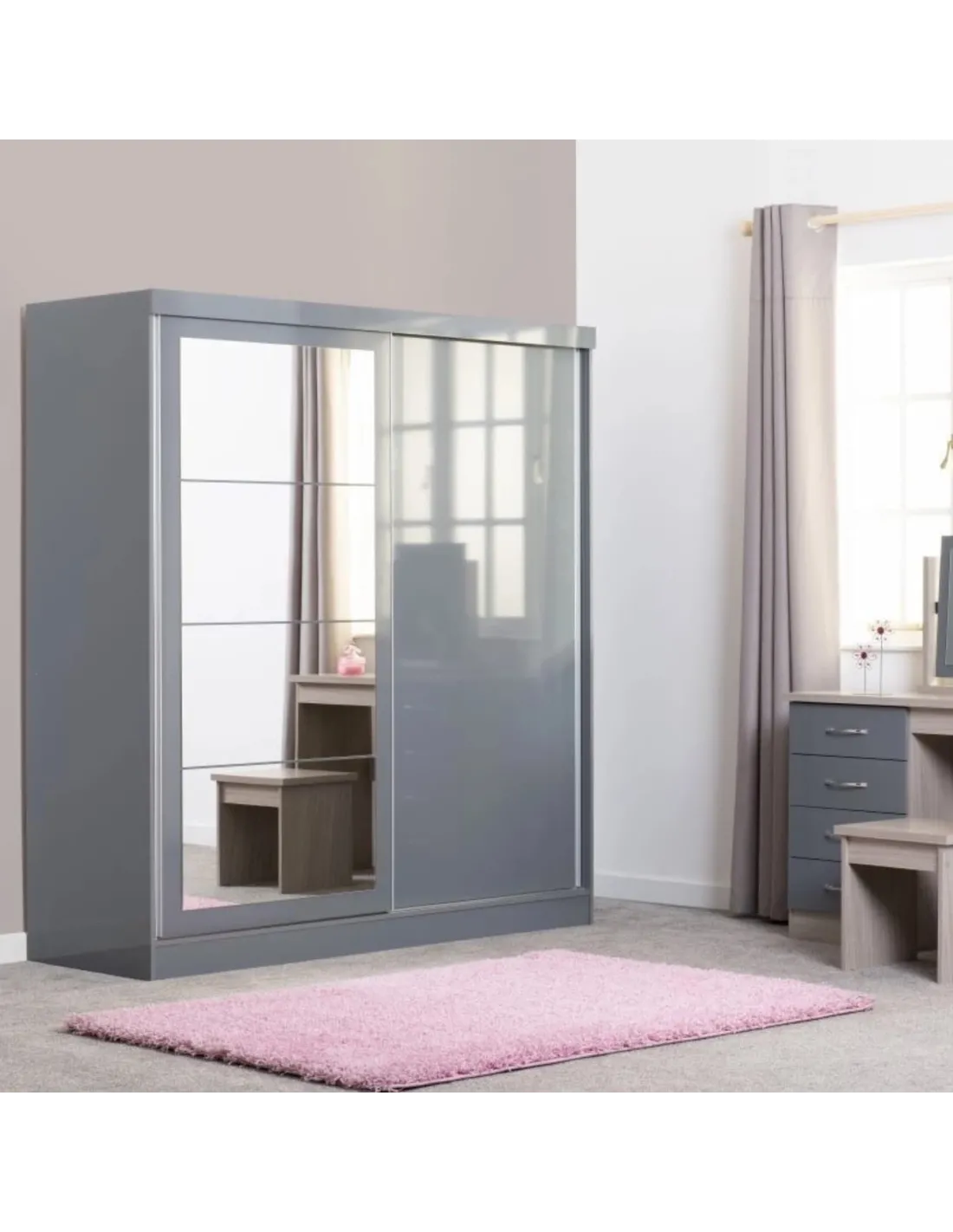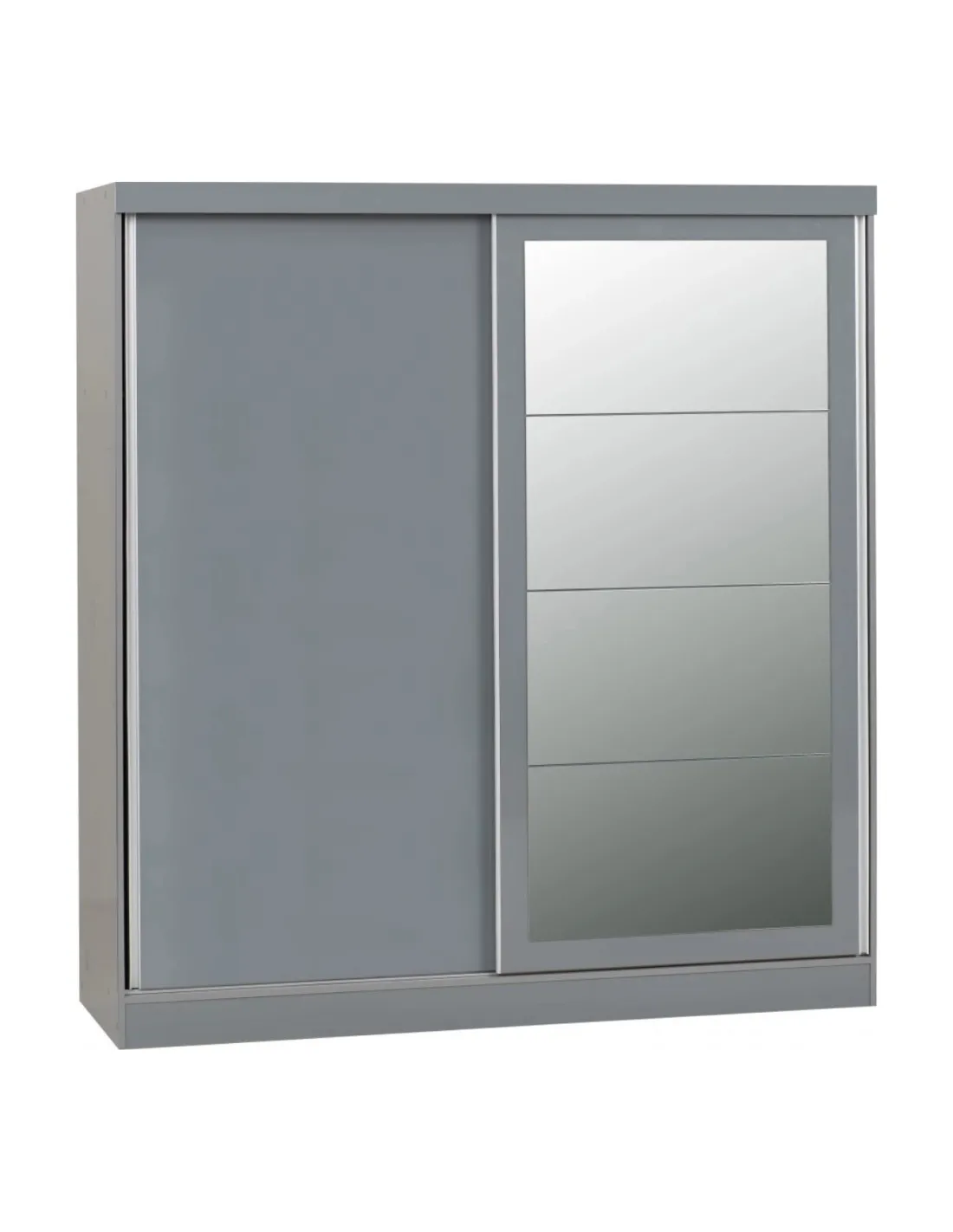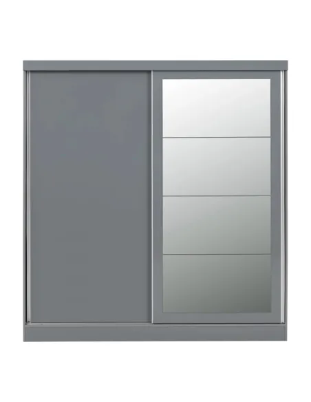 Reference: 100-101-167The Nevada Mirrored Wardrobe is a stylish and practical storage solution for your bedroom. Featuring two sliding doors in a stylish grey gloss finish, this wardrobe combines modern aesthetics with functionality. It offers a large shelf on each side and spacious hanging areas, providing ample room for all your clothing and accessories.