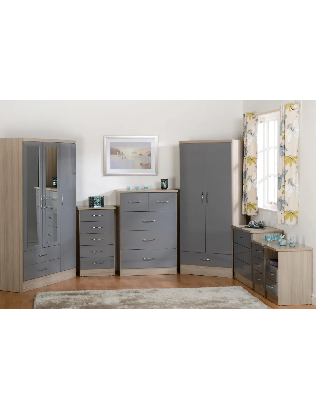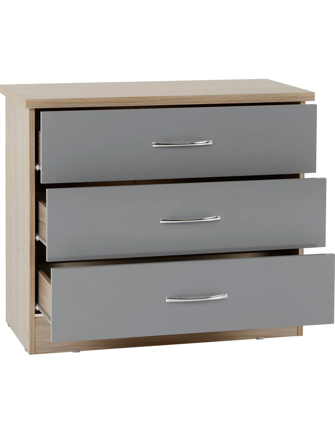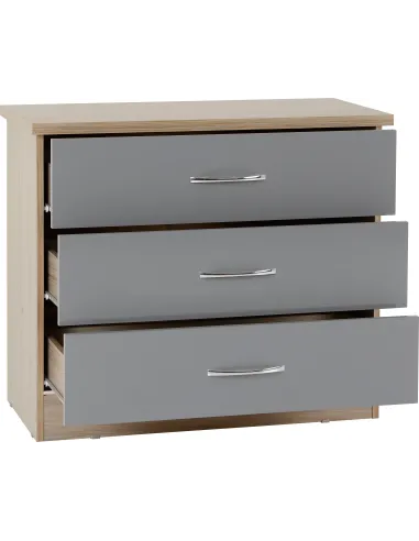 Reference: 100-102-091This Nevada chest has high gloss grey drawer fronts with a light oak colour 3D effect wood grain on the sides and tops. 3 wide drawers provide plenty of storage for your folded clothing. Its spacious top surface is the ideal spot for anything from your house plants to your treasured picture frames. Brushed steel handles add to the modern look of this chest.