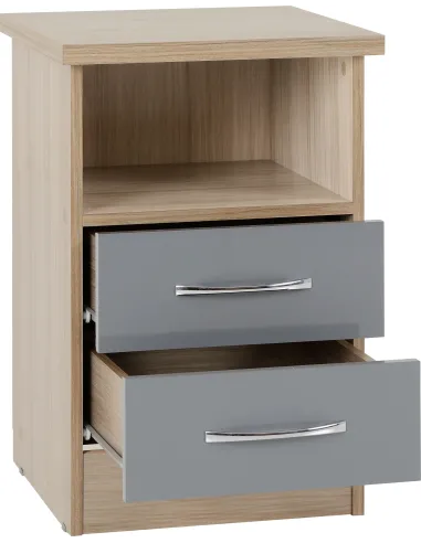 Reference: 100-103-053This Nevada bedside locker has grey high gloss drawer fronts with a light oak colour 3D effect wood grain on the sides and tops. 2 spacious drawers and an open shelf will allow you to keep all your bedside essentials close to hand. Brushed steel handles add to the modern look of this chest. The top of the cabinet is big enough to hold a bedside lamp, alarm clock or anything else you might need by your bed.