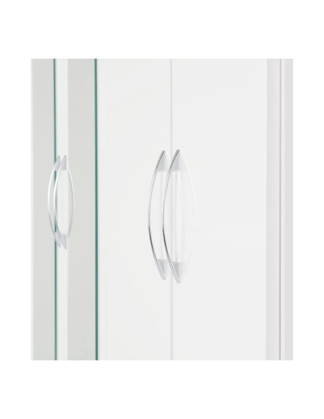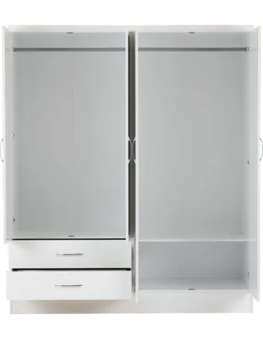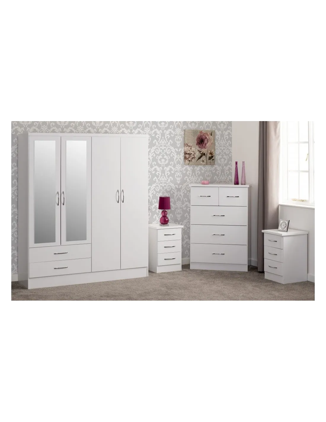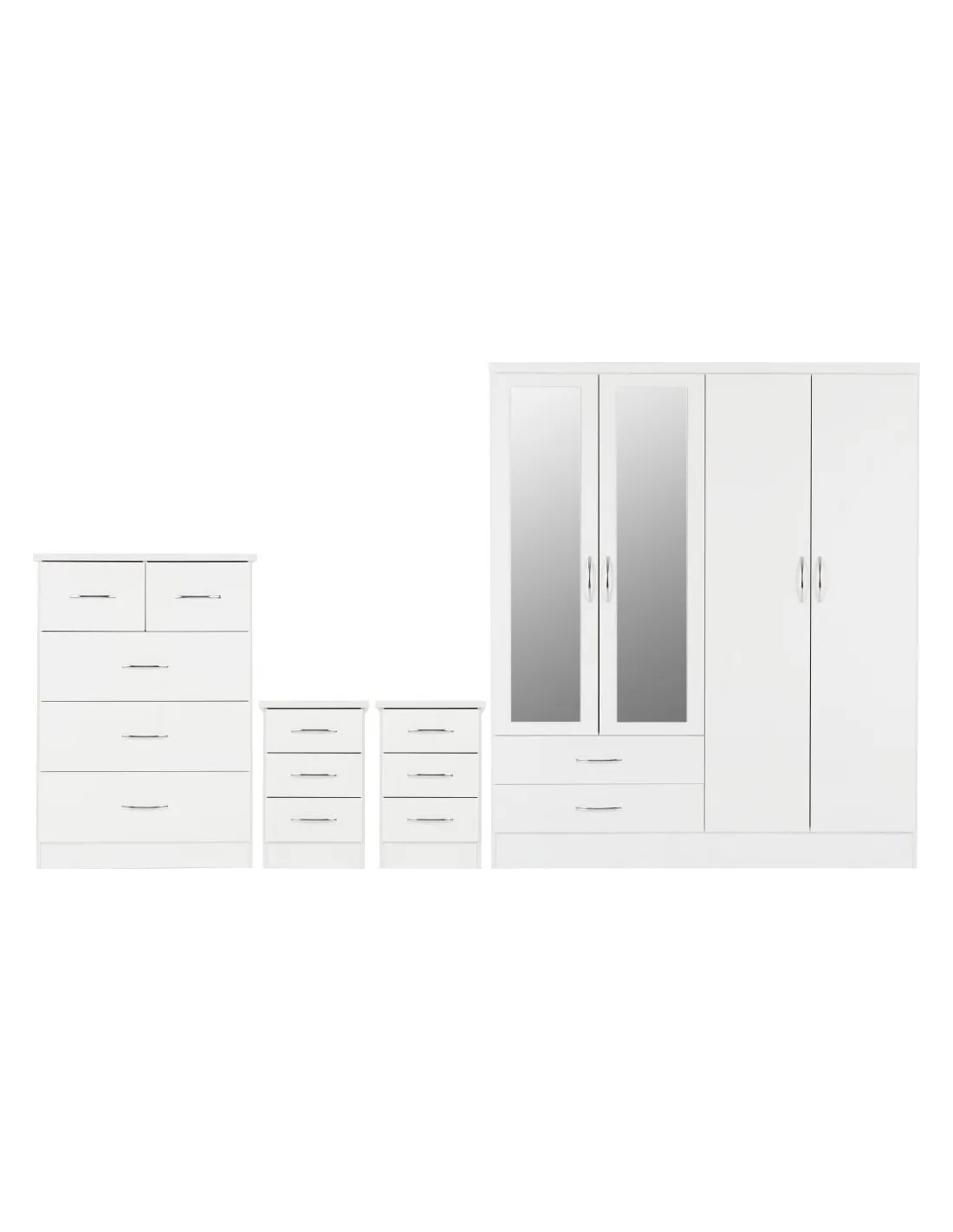 Reference: 100-108-040This Nevada bedroom set has an attractive white gloss finish. The set comprises of a mirrored 4 door, 2 drawer wardrobe, 2 bedside tables and a chest of drawers. Inside are 2 hanging areas with 2 drawers underneath it while the other is accompanied by an open storage area, perfect for all your folded clothing needs. Silver handles finish off this wardrobe beautifully.