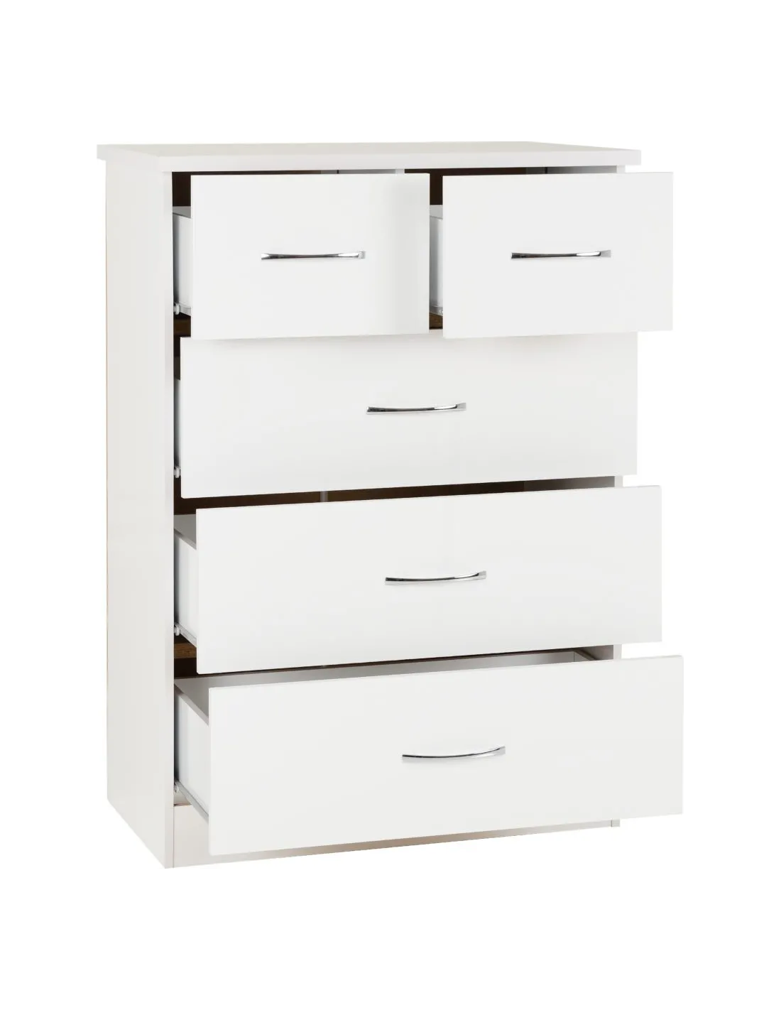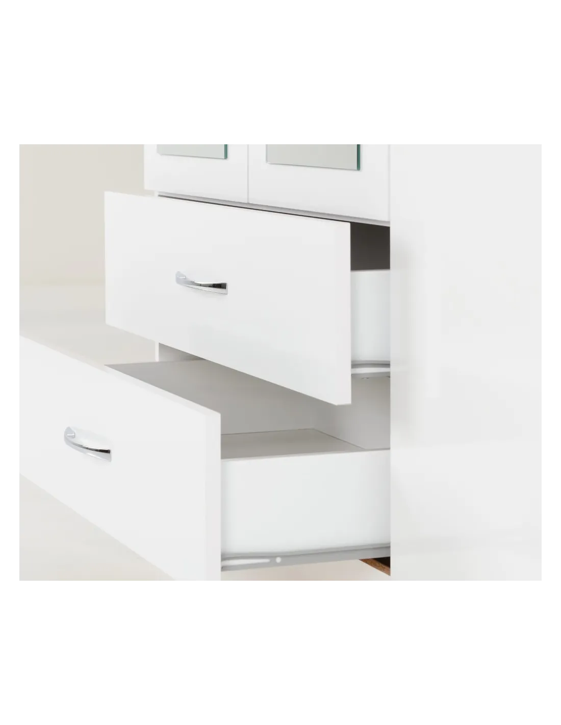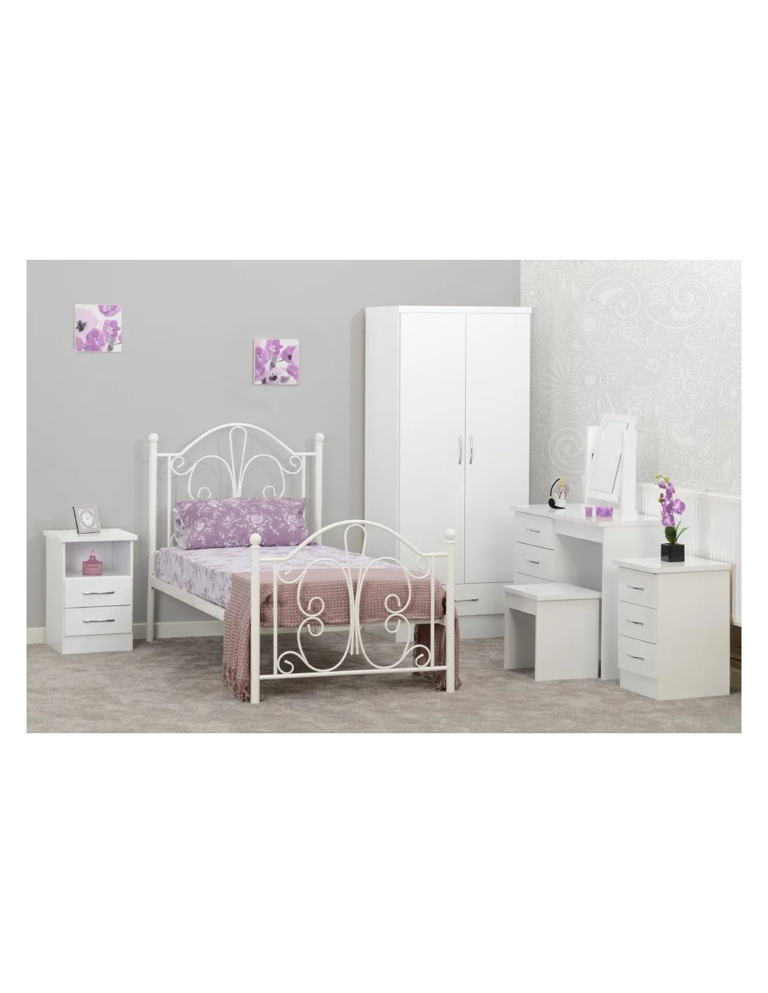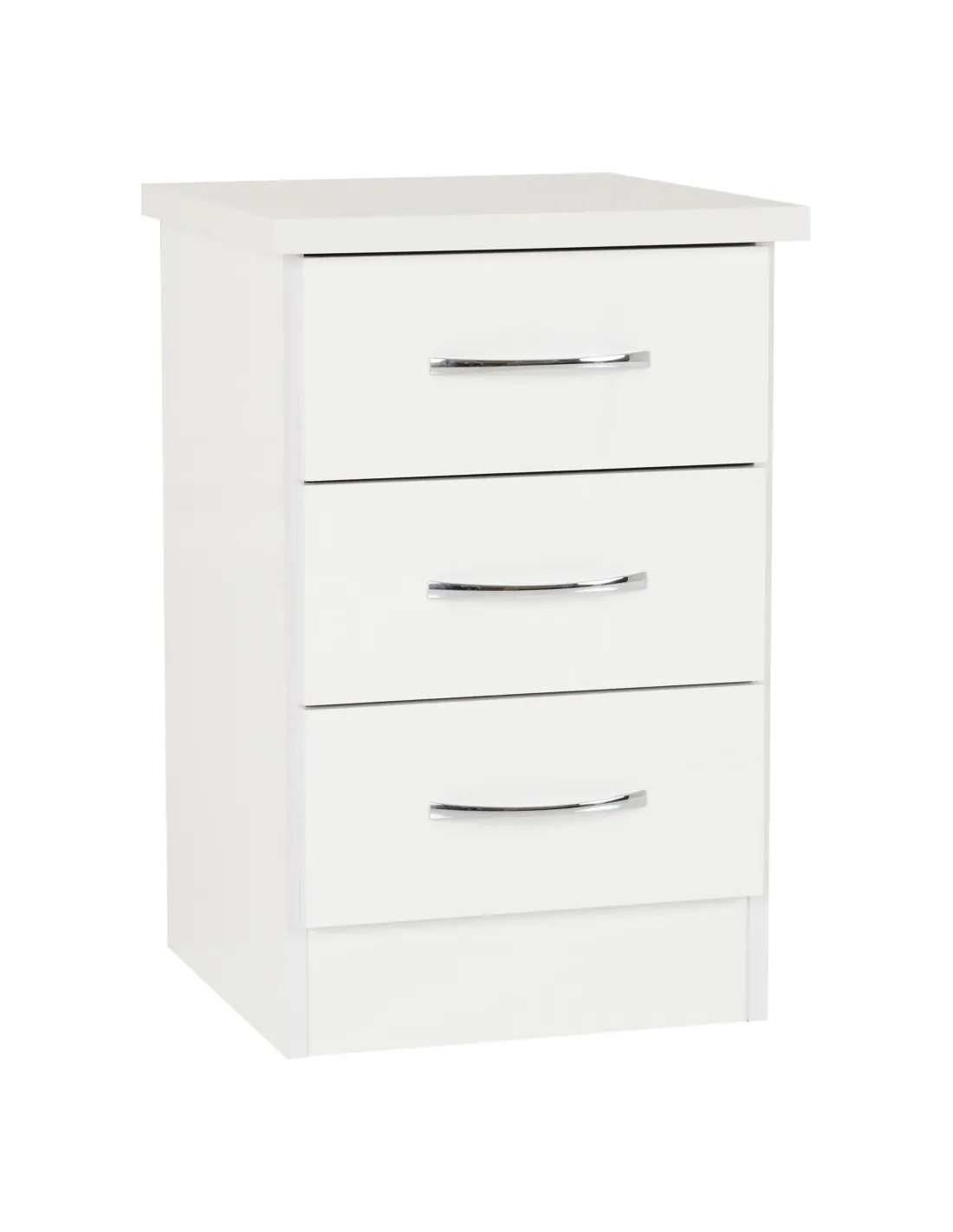 Reference: 100-108-040This Nevada bedroom set has an attractive white gloss finish. The set comprises of a mirrored 4 door, 2 drawer wardrobe, 2 bedside tables and a chest of drawers. Inside are 2 hanging areas with 2 drawers underneath it while the other is accompanied by an open storage area, perfect for all your folded clothing needs. Silver handles finish off this wardrobe beautifully.
