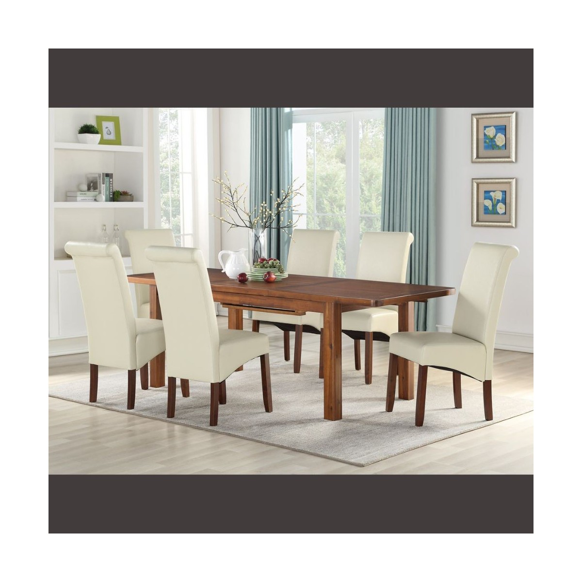 Reference: 12888Revamp your home with a stunning dining and occasional collection. Our Andorra is a rich, elegant contemporary collection using traditional dark acacia wood. 120cm and 165cm butterfly extension dining sets are matched beautifully with a full occasional collection that will add a touch of luxury to both the living and dining spaces within the home. The contemporary curved tops of all pieces, the dark rich wood and the classic design elevate the Andorra to a must have range. This set consists of a 120cm extending dining table and 4 Sophie dining chairs. The table will provide plenty of space to sit down for evening meals with all the family or entertaining guests. It extends by 30cm to 150cm. The chairs are upholstered in leather air and come in a cream colourway.