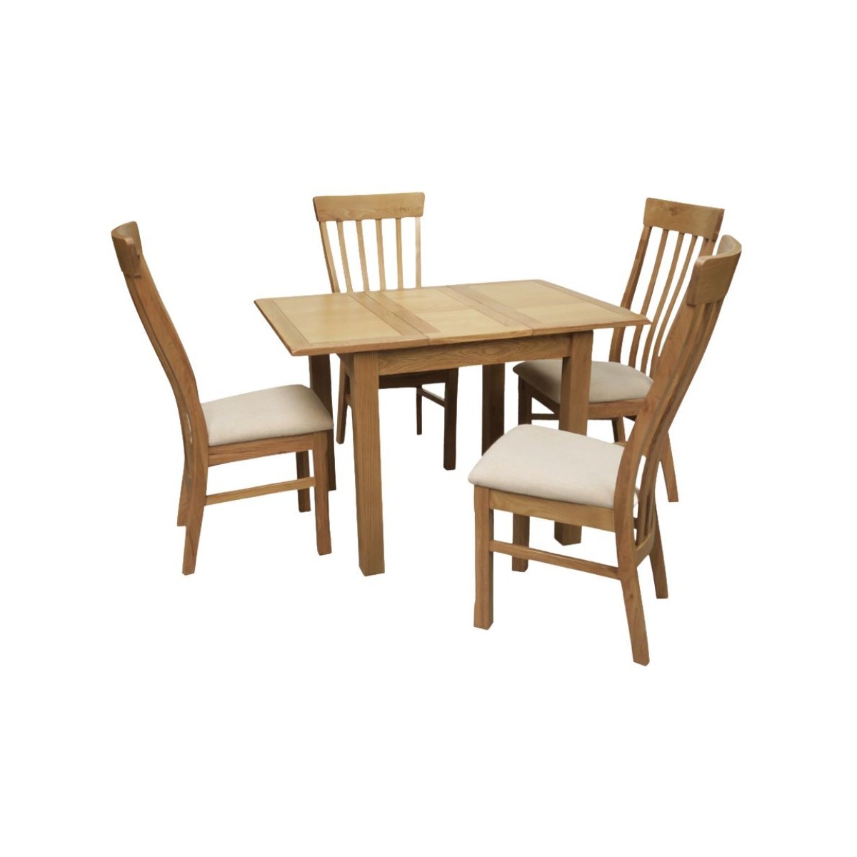 Reference: 13474The Kilmore Oak range combines exceptional value with superior craftsmanship, bringing a warm and timeless charm to your dining and living spaces. Crafted from solid oak and selected oak veneers, each piece is finished with a natural oil that enhances the rustic grain and texture of the wood. This dining table set includes a sturdy table and four matching chairs, perfect for family meals or entertaining guests. The table conveniently extends by 32 cm, offering extra space when needed while maintaining its classic, elegant style.