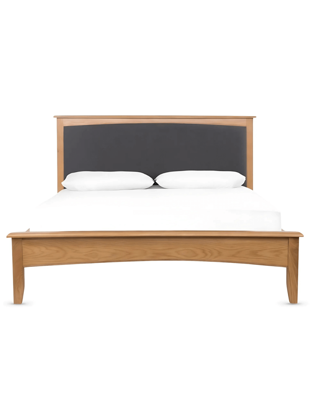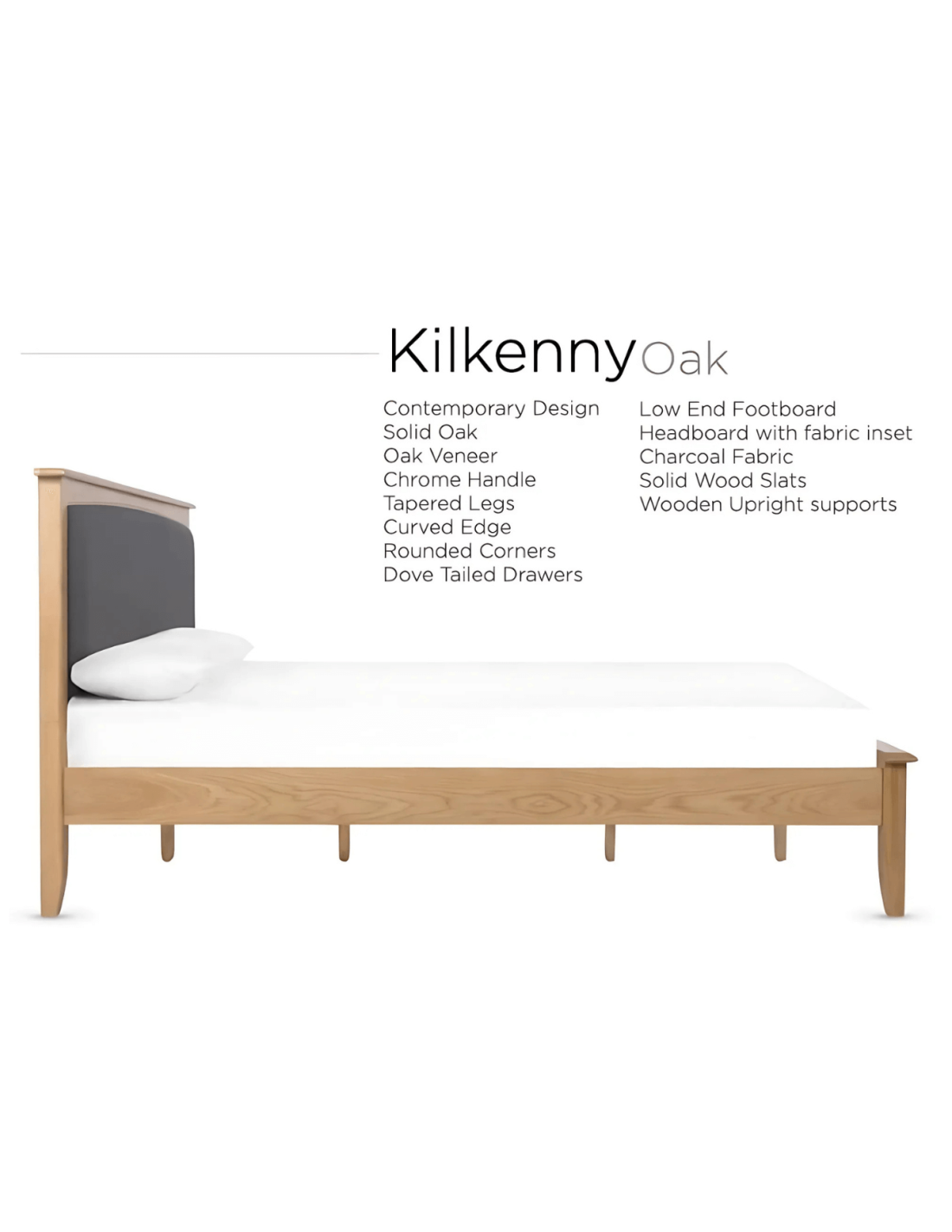 Reference: 13795The Kilkenny bedframe in oak brings together the strength of solid oak and the refinement of oak veneer in a clean, modern design. With a low-end footboard featuring gently rounded corners and a headboard inset with soft charcoal fabric, this 5ft bedframe blends comfort with style. The sturdy base is fitted with solid wood slats and upright wooden supports for enhanced durability. Part of the wider Kilkenny collection, this bed is a perfect centrepiece for a stylish and functional bedroom.