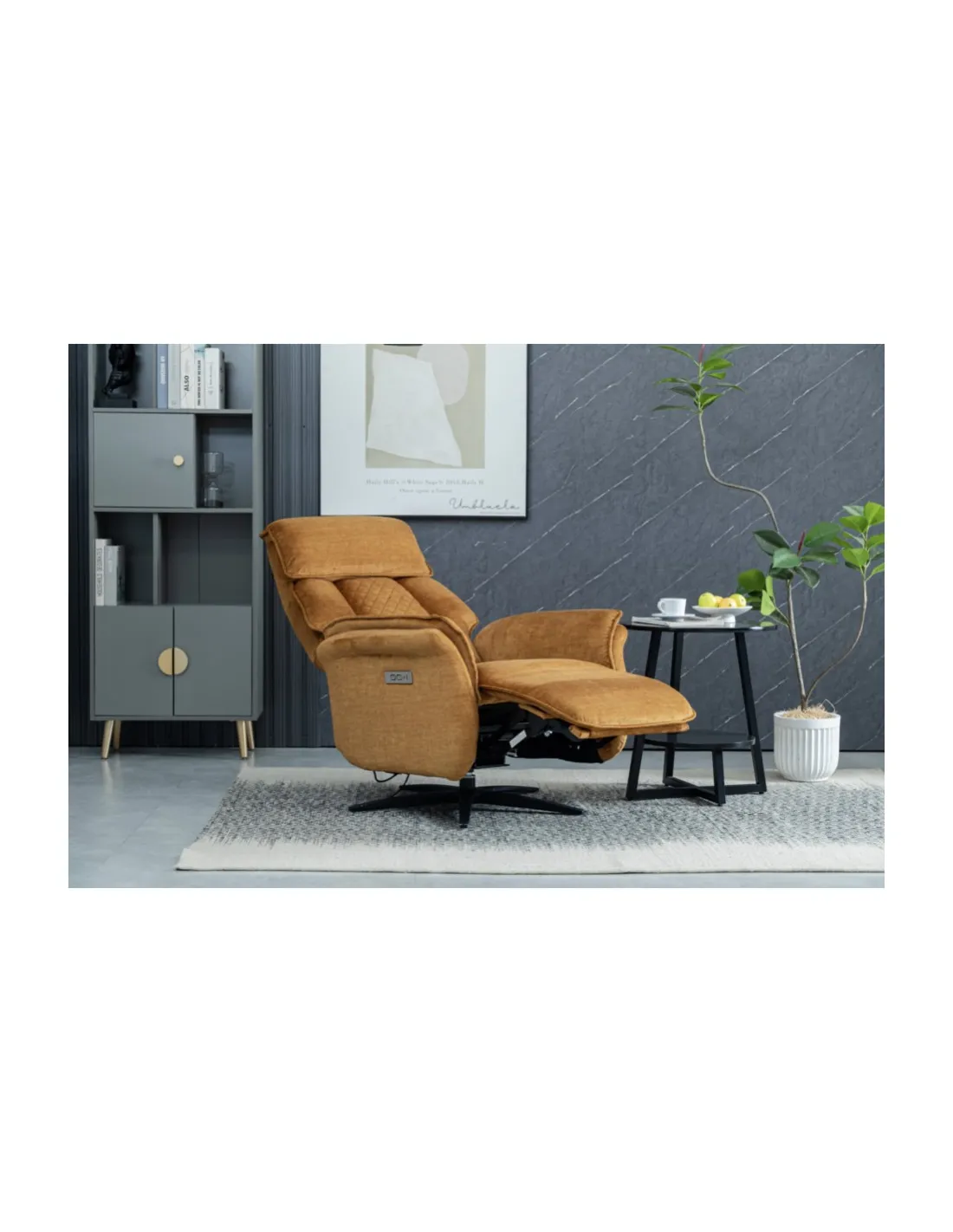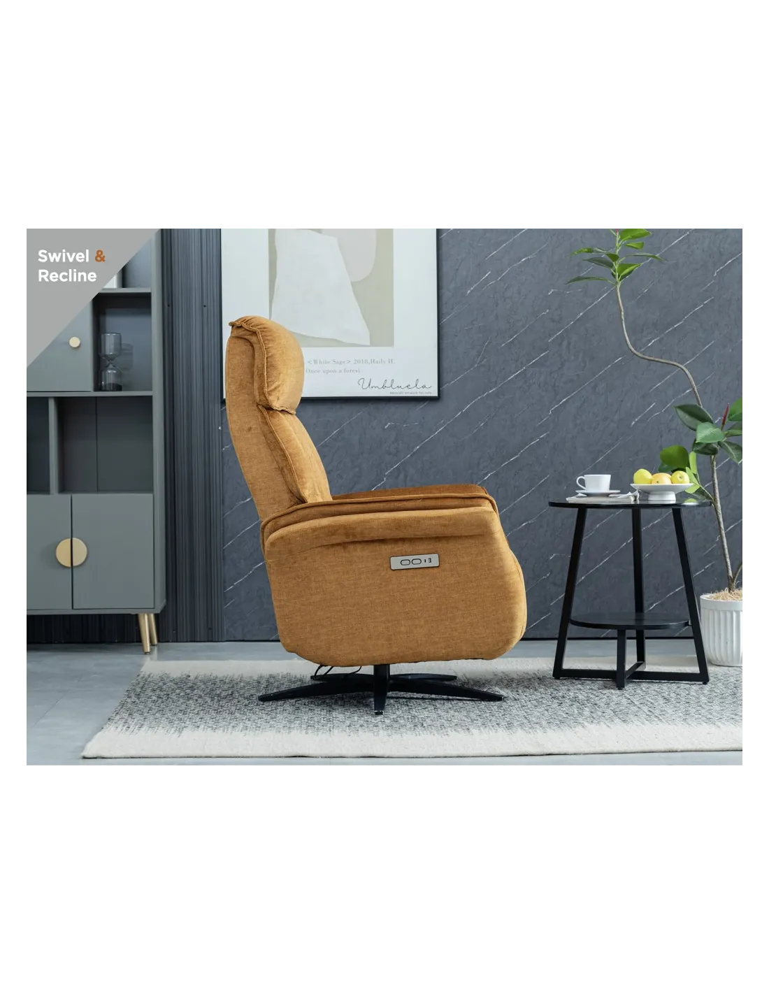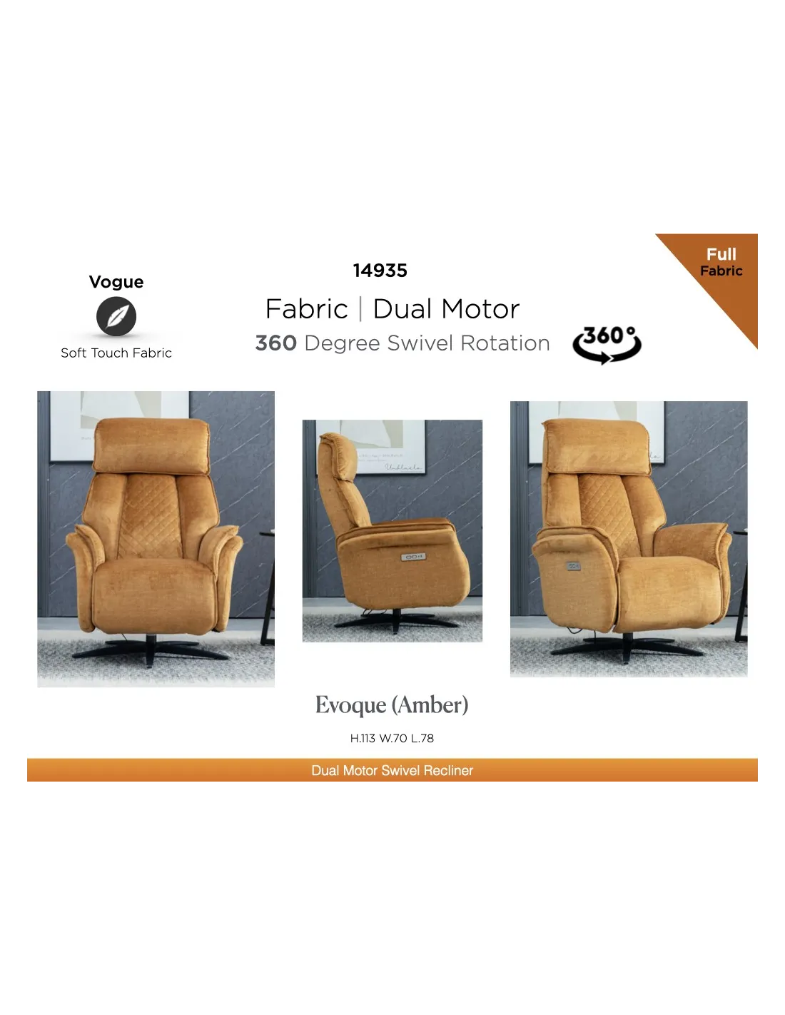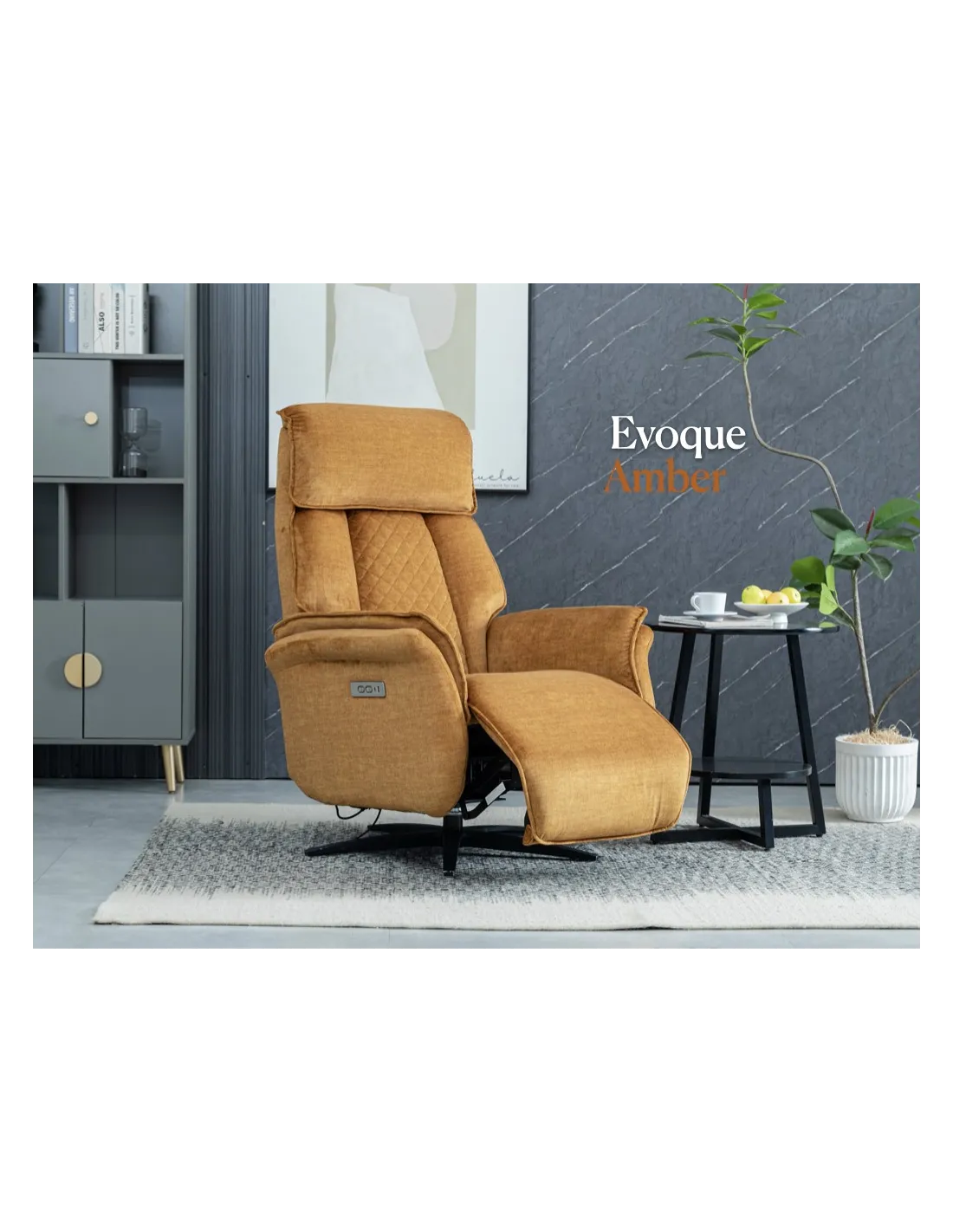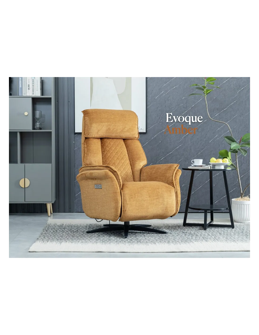 Introducing the epitome of relaxation and style: Evoque Swivel Lounge Chairs with Dual Motor offer the ultimate in comfort. With independent controls for both the backrest and footrest, you have complete control over your seating arrangement. Crafted with meticulous attention to detail, these lounge chairs exude luxury and sophistication. The plush cushioning provides exceptional support, while the premium upholstery adds a touch of elegance to any room. Available in three on-trend colours, Amber, Ocean Blue and Grey, with a 360 degree rotation.