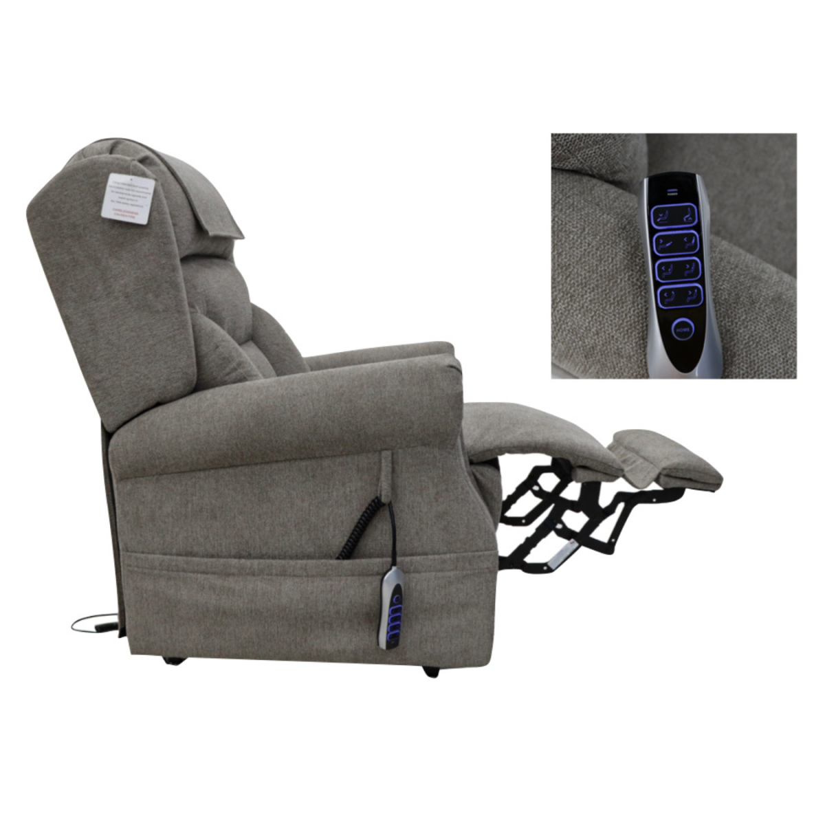 Reference: 16107The Berkshire Quad Motor Lift & Tilt Armchair delivers the ultimate in luxury, comfort, and control. Upholstered in a stunning fabric Stone fabric – it blends seamlessly into any living space. The advanced quad motor design allows for independent control of the backrest, leg rest, lumbar support, and headrest, providing a fully customised seating experience. Whether reclining or transitioning to a standing position, the easy-to-use hand-held remote puts effortless control at your fingertips. Designed with both style and functionality in mind, this chair is perfect for relaxation and mobility assistance alike.