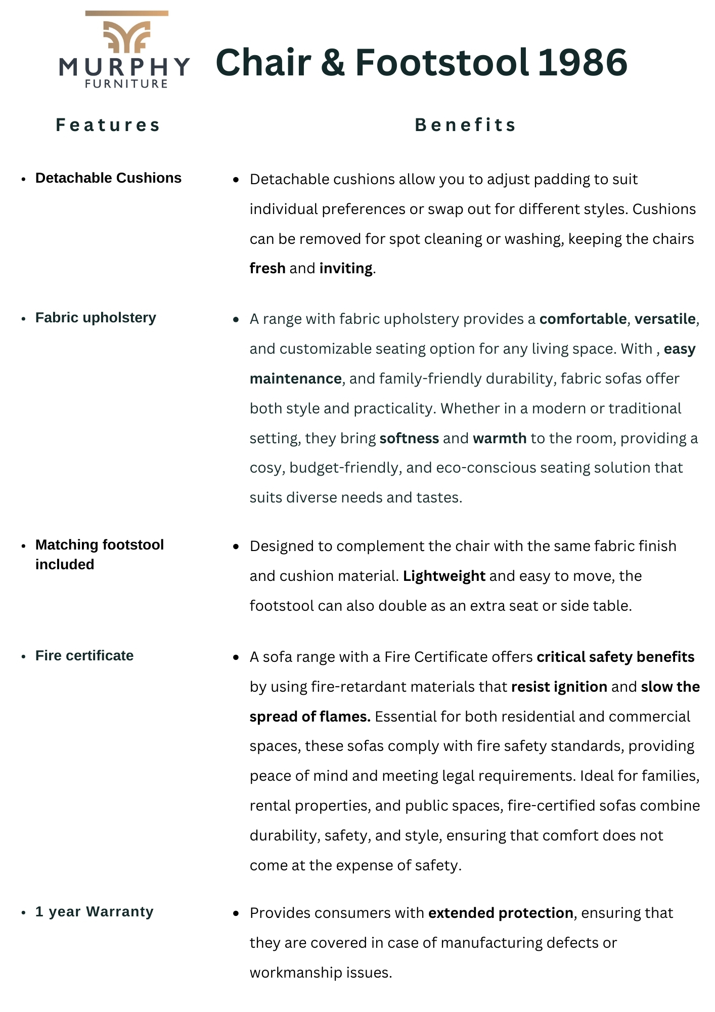 Reference: Chair+Footstool1986LightGreyFeatures & Benefits: Click here
