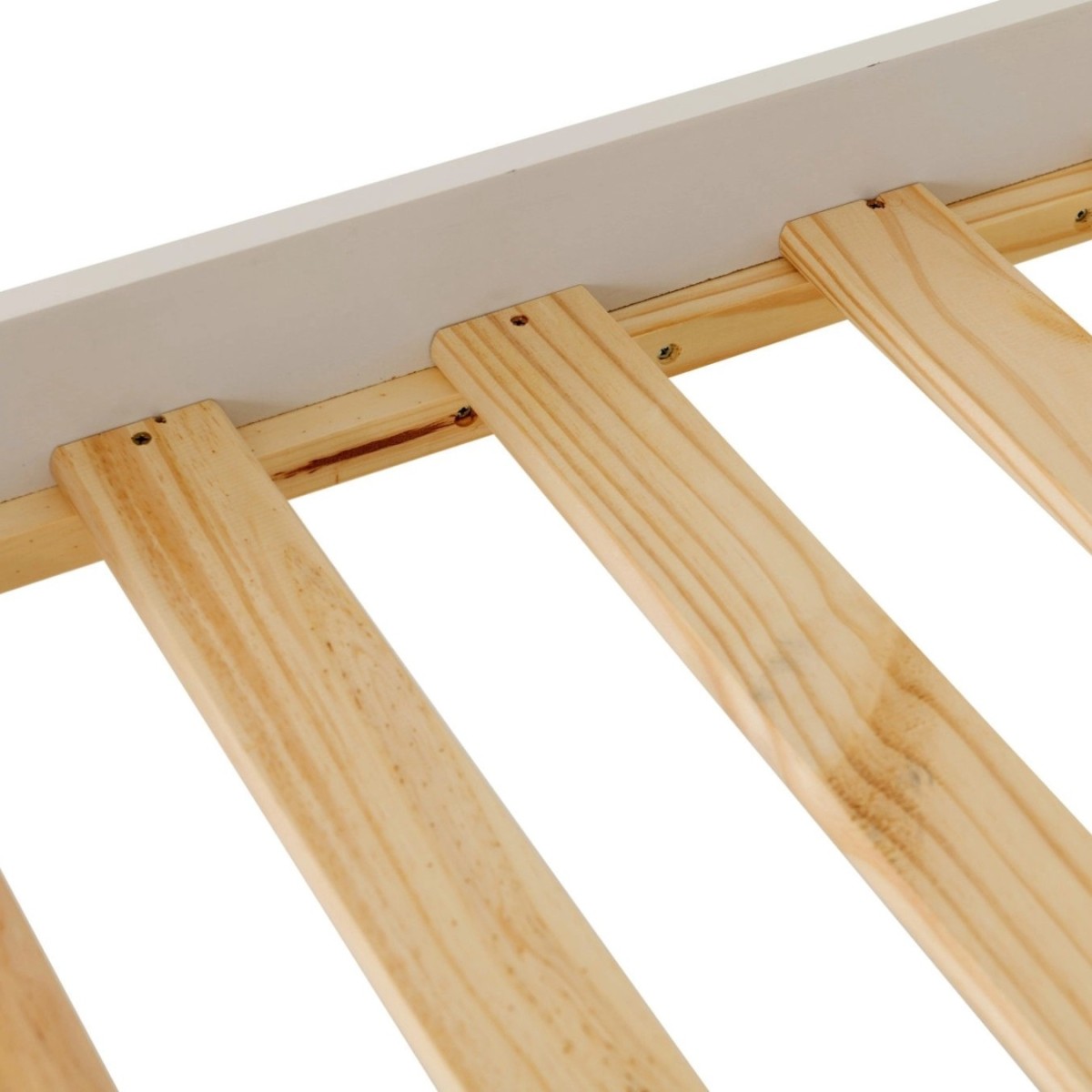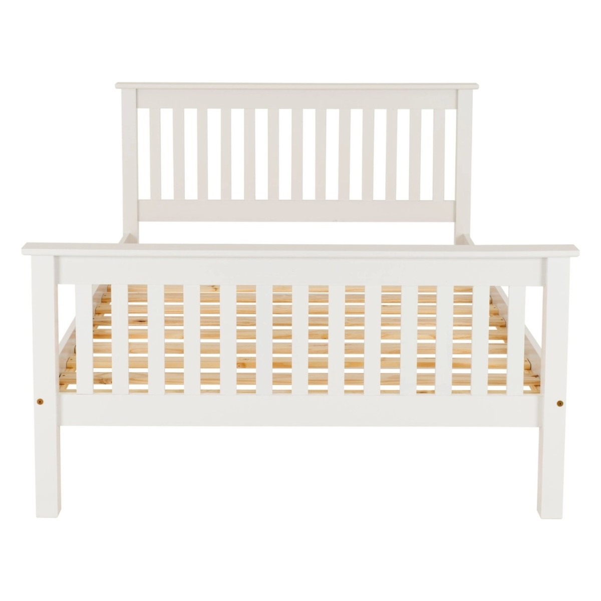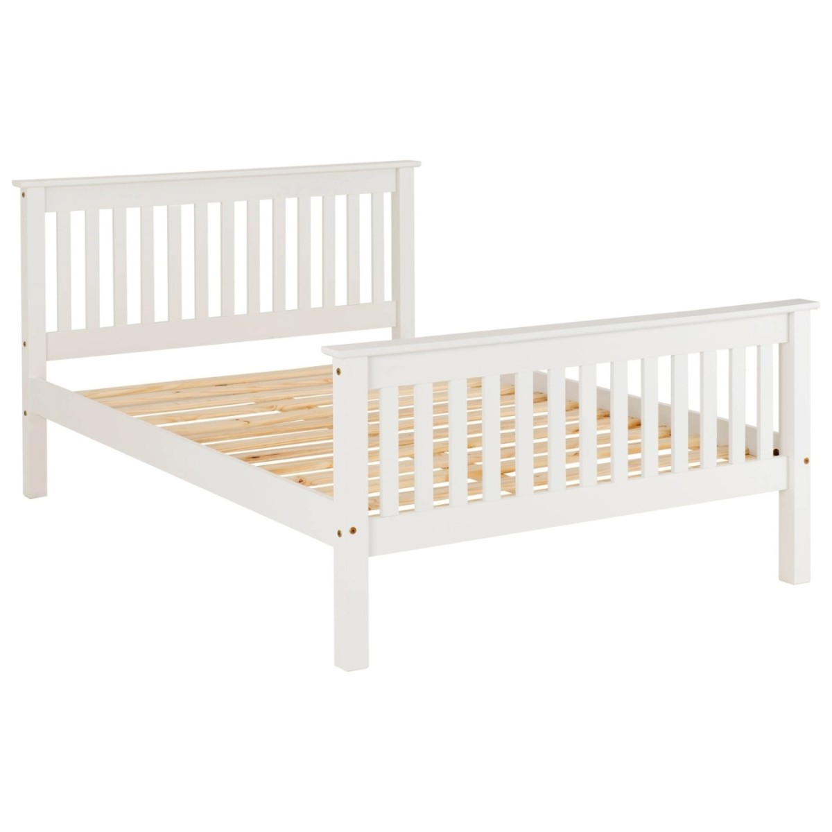 Reference: 200-202-011Built to last from solid pine timbers, the Monaco High Foot End Bedframe is an affordable and stylish centrepiece for any bedroom. Finished in a sleek, clean white, it features matching headboard and footboard panels with vertical slats and oversized oak plinths for a refined, timeless look. The strong pine slatted base offers excellent mattress support while allowing air to circulate for a cool and comfortable night’s sleep. Combining durability, elegance, and unbeatable value, the Monaco bedframe is a standout choice for style-conscious shoppers.