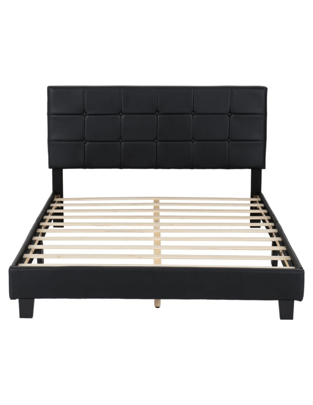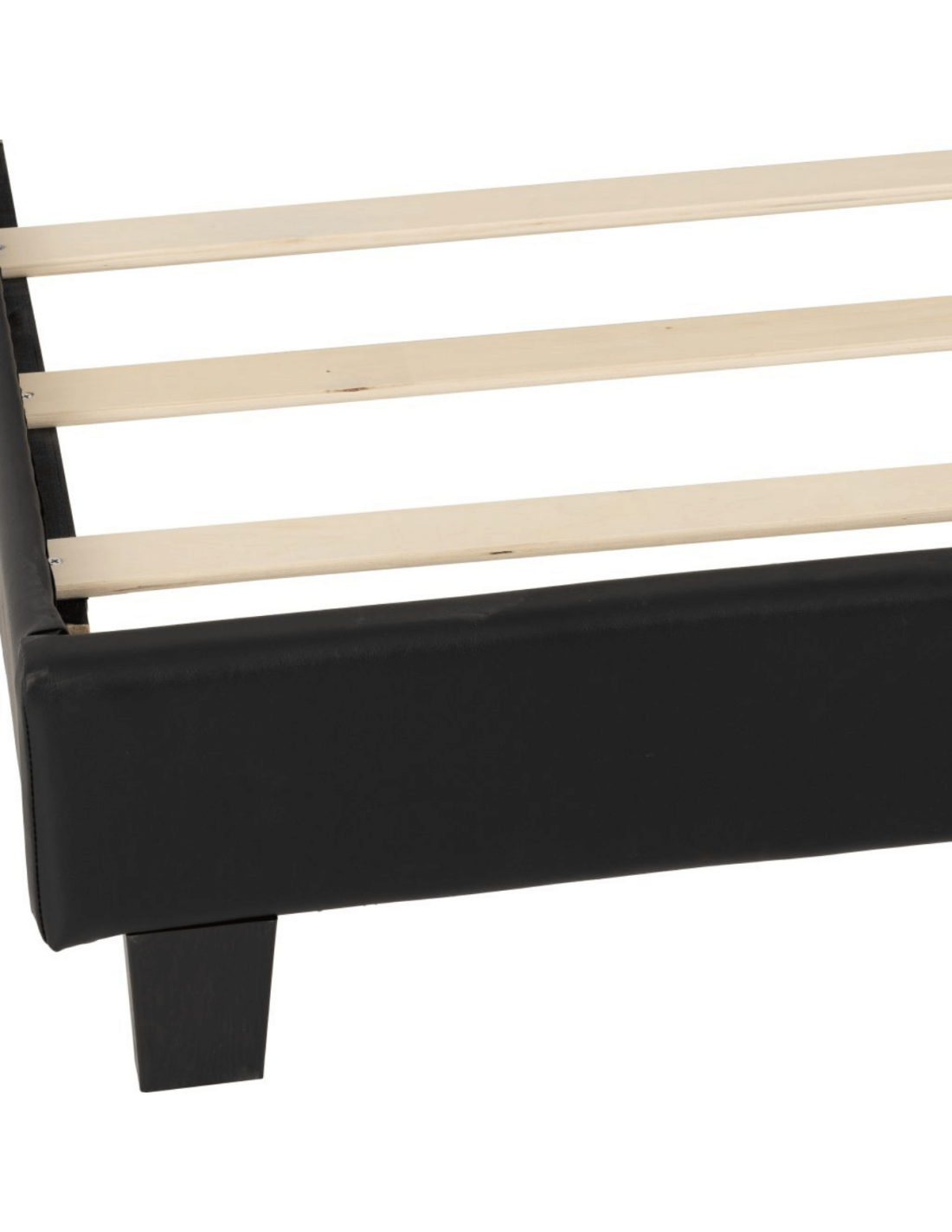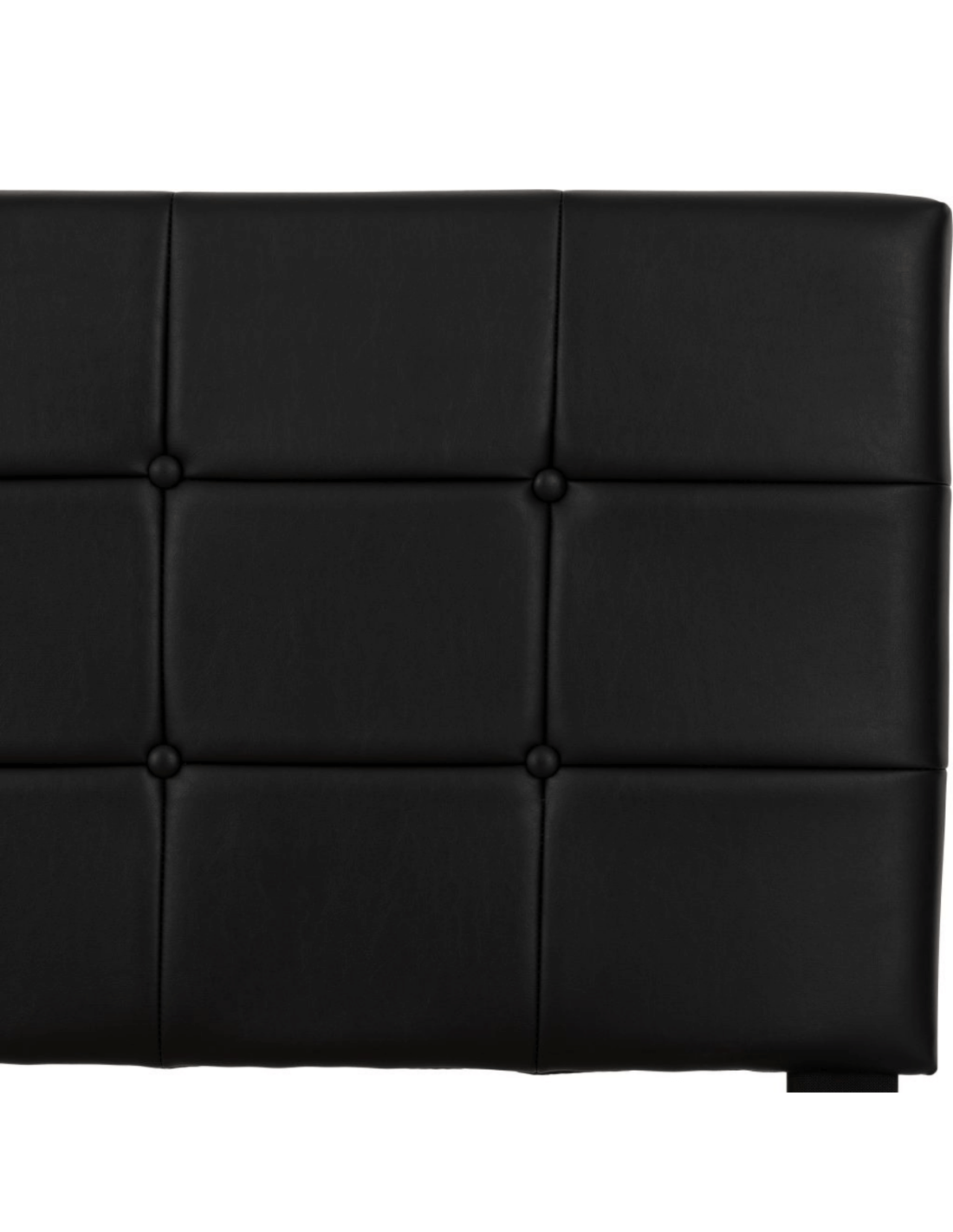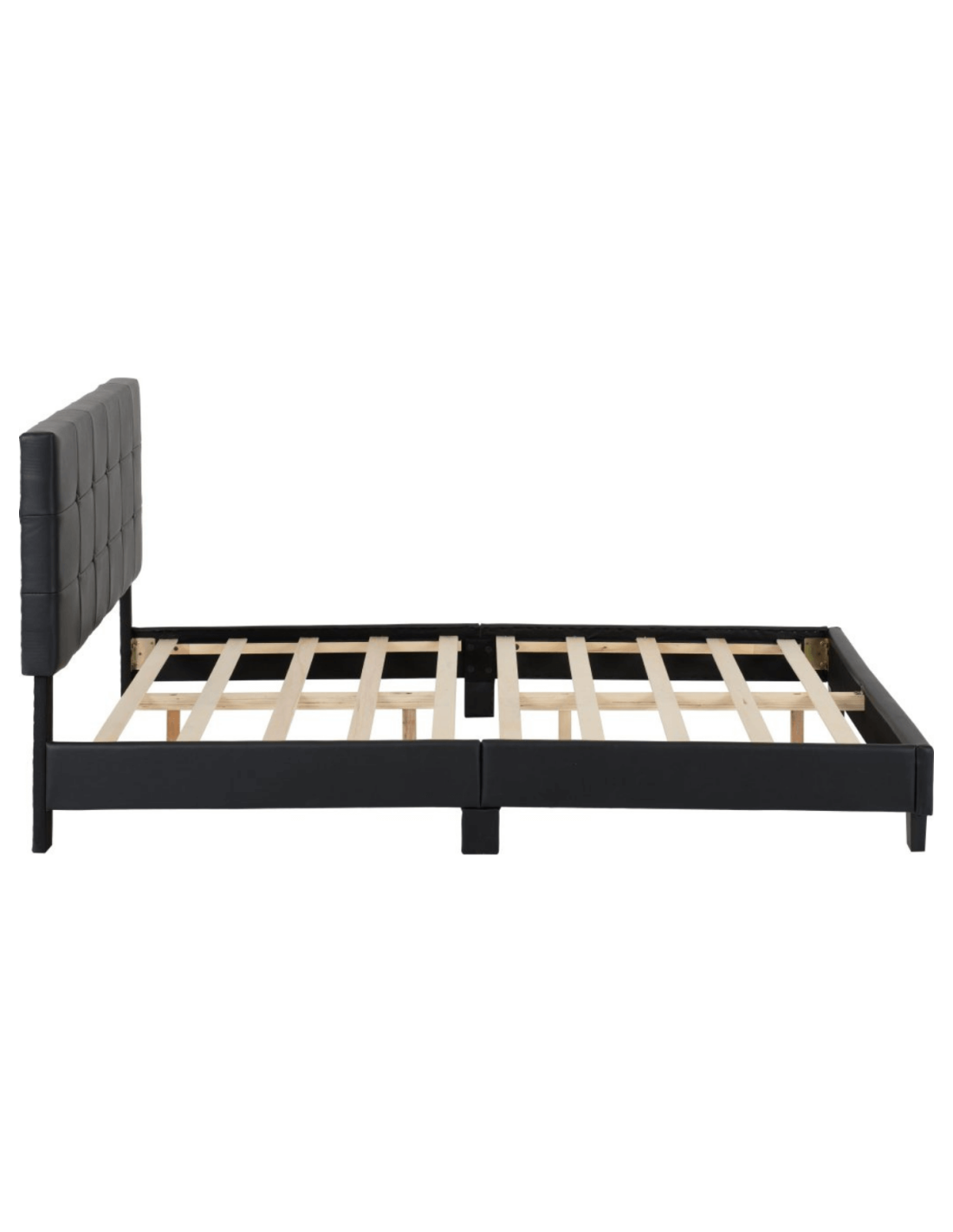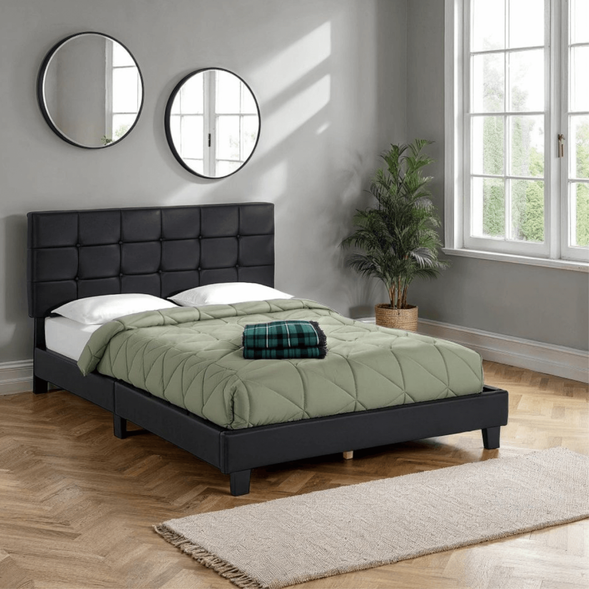 Reference: 200-203-134The Arran Bedframe brings a refined and contemporary style to your bedroom with its clean, squared upholstery and classic button detailing. Fully upholstered in a classy black PU fabric, the headboard and bed base offer a cohesive, tailored look. The bed base is wrapped in matching fabric all the way around, enhancing its polished design. Supported by sturdy wooden legs, this bedframe balances aesthetics with durability, making it a stylish and practical addition to any bedroom.