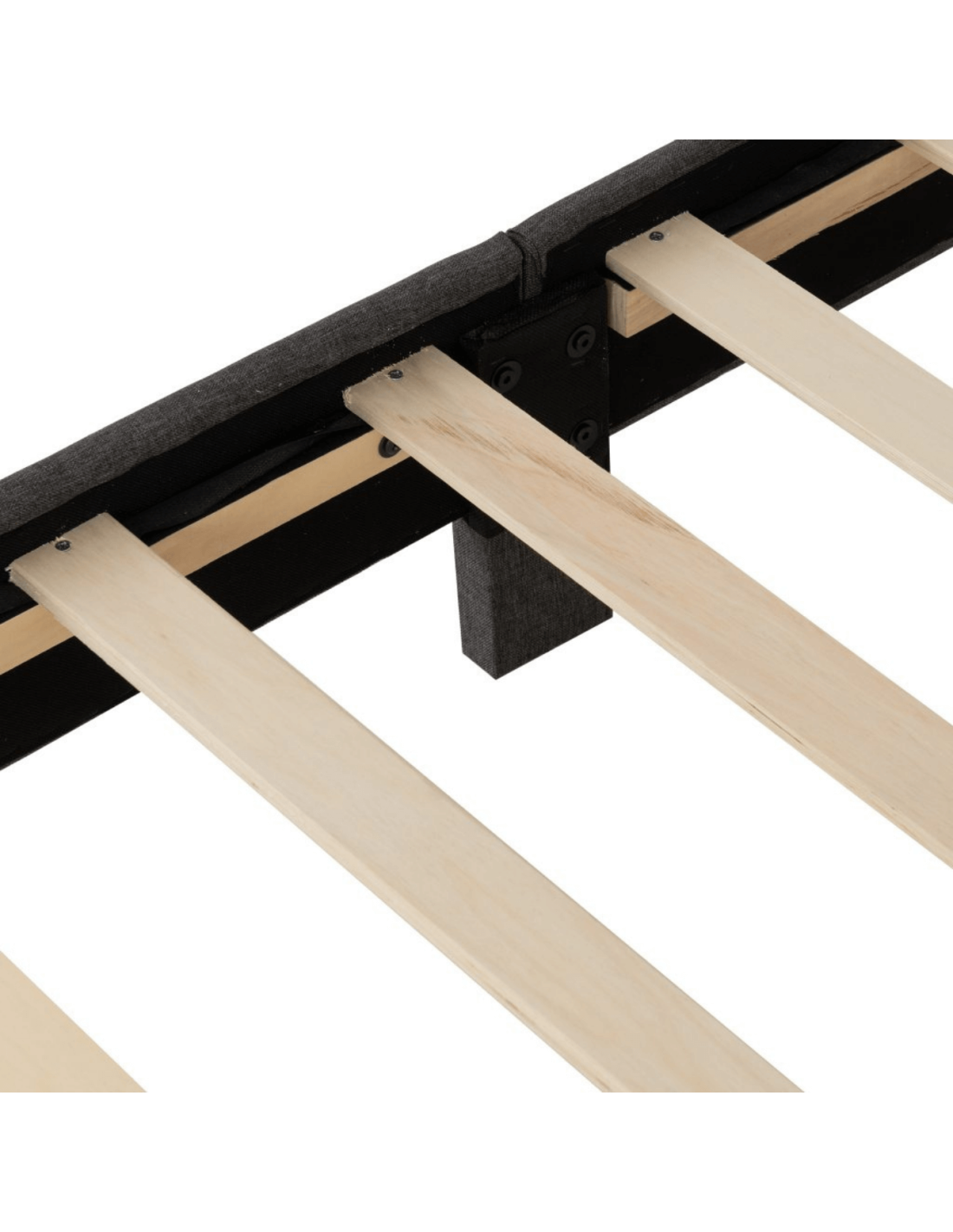 Reference: 200-203-135The Arran Bedframe brings a refined and contemporary style to your bedroom with its clean, squared upholstery and classic button detailing. Fully upholstered in soft grey fabric, the headboard and bed base offer a cohesive, tailored look. The bed base is wrapped in matching fabric all the way around, enhancing its polished design. Supported by sturdy wooden legs, this bedframe balances aesthetics with durability, making it a stylish and practical addition to any bedroom.