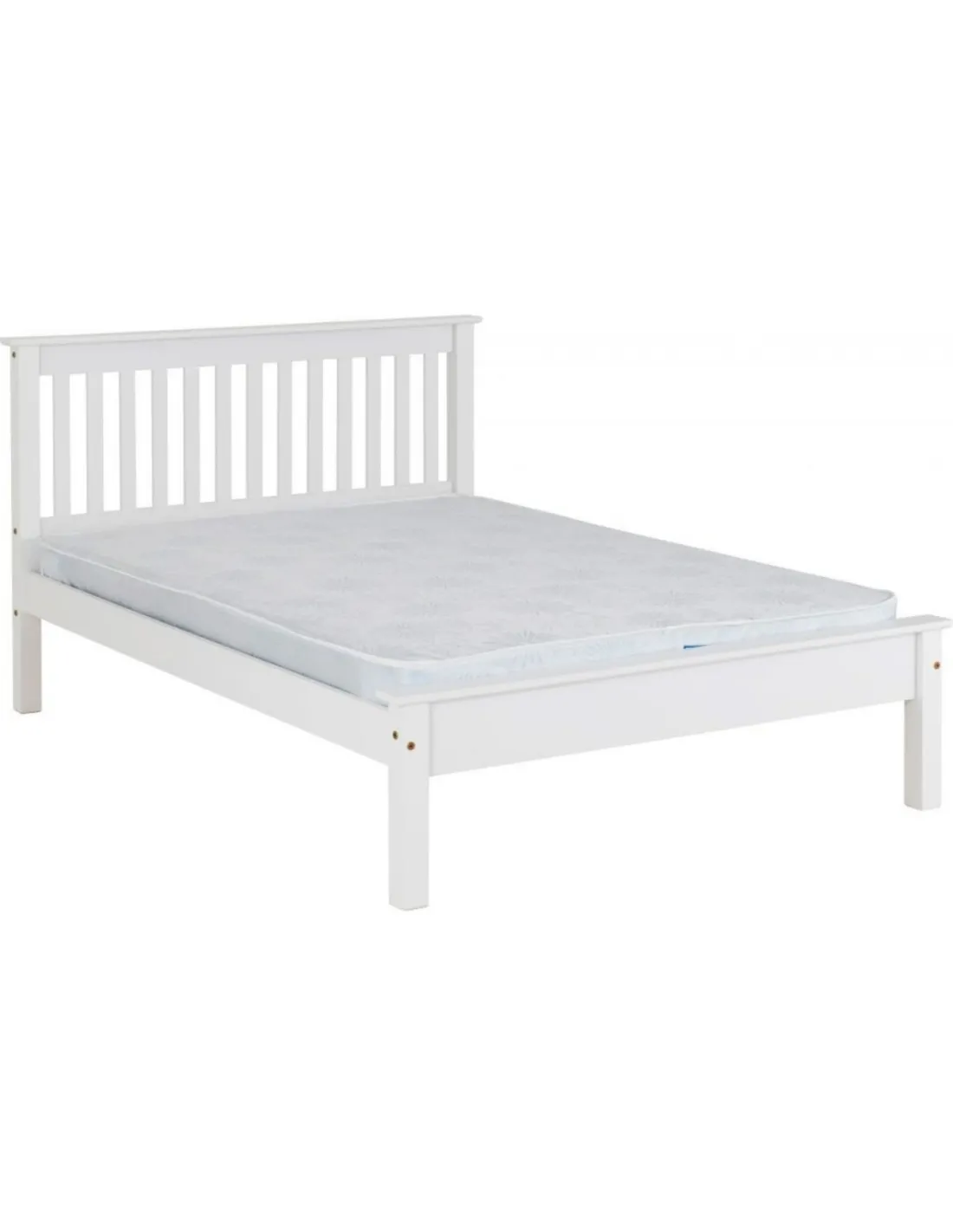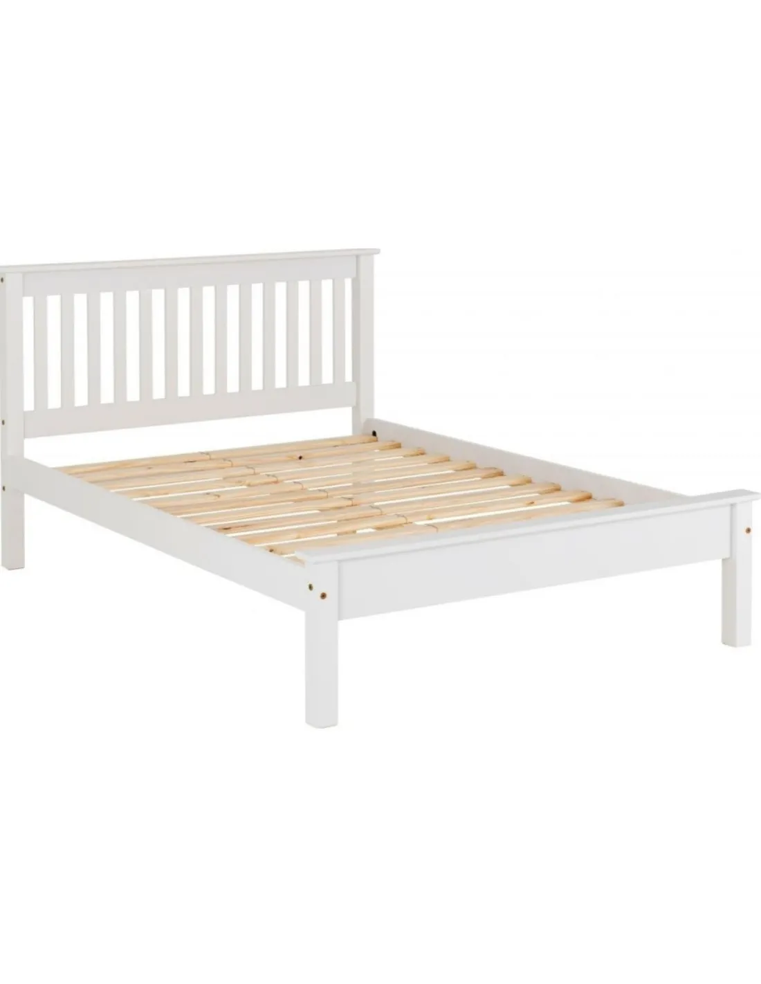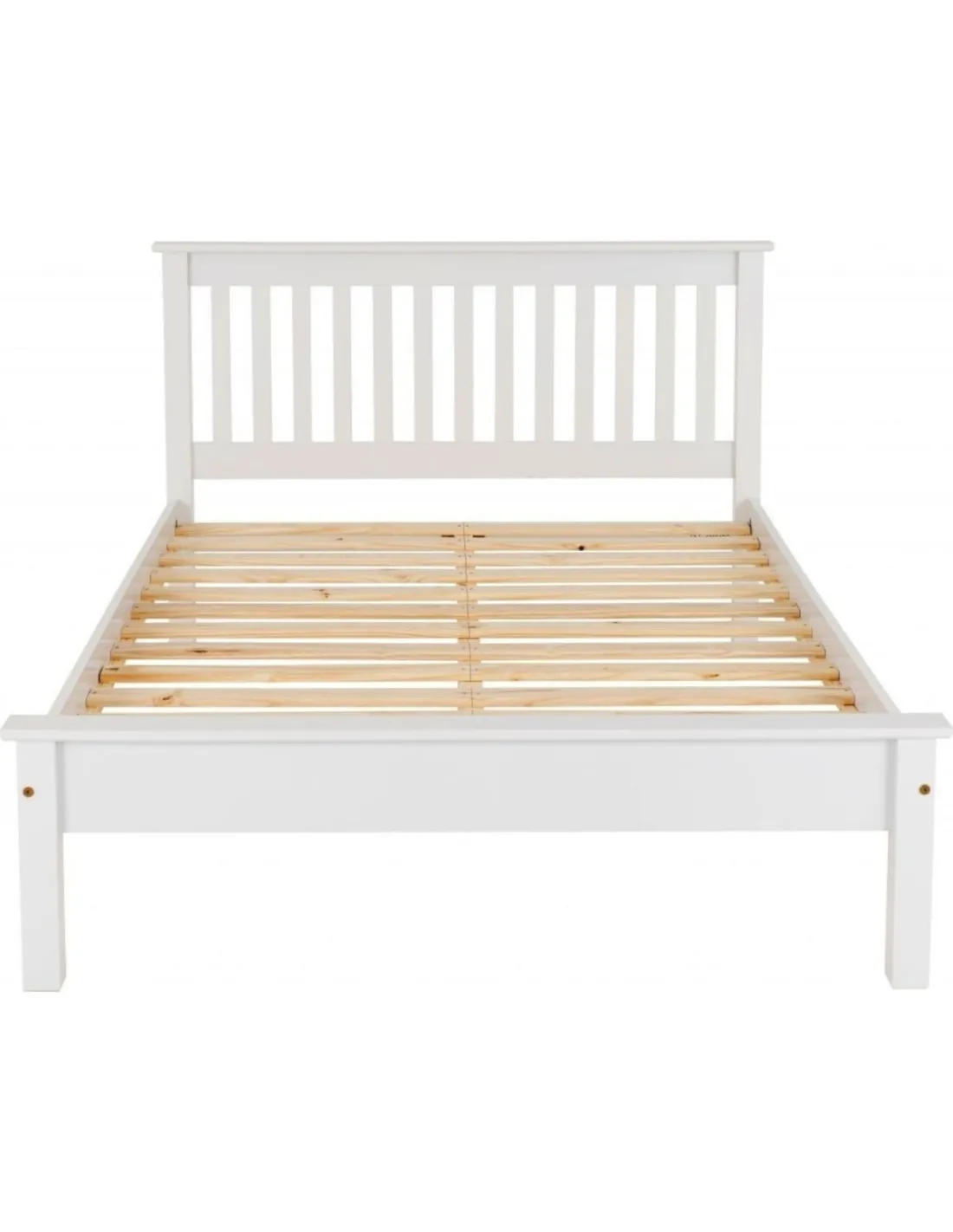 Reference: 200-204-008Built to last from solid pine timbers, the Monaco Low Foot End Bedframe is an affordable and stylish addition to any bedroom. Finished in a clean white tone, it features a slatted headboard and oversized oak plinths on both ends for a touch of elegance and timeless appeal. Strong pine slats provide a robust base for your mattress while allowing airflow for a cool and comfortable night’s sleep. Perfectly blending durability and design, the Monaco bedframe offers exceptional value without compromising on quality or style.
