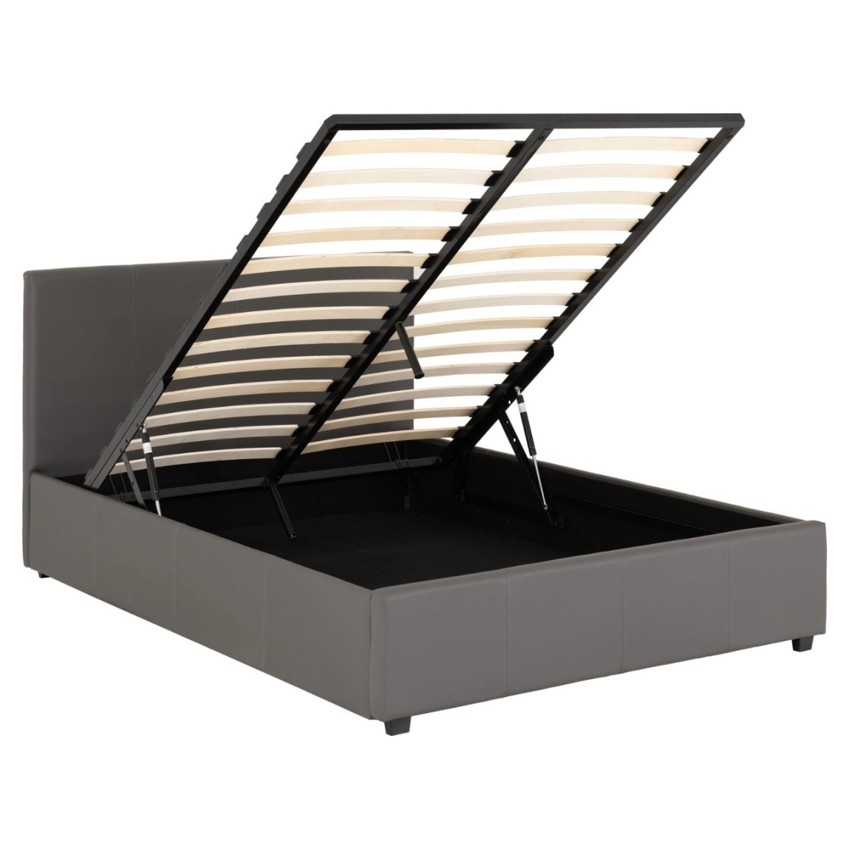 Reference: 200-204-036The Prado 5ft Storage Bedframe offers a sleek, modern look with practical hidden storage. Upholstered in grey faux leather, it features a high headboard, low footboard, and a clean-lined contemporary design that suits a variety of bedroom styles. Built with a strong sprung slatted base, it delivers cushioned support and helps improve airflow around your mattress. The ottoman mechanism is easy to use—just lift the discreet handle at the footboard to reveal generous internal storage, perfect for bedding, clothes, or other essentials.