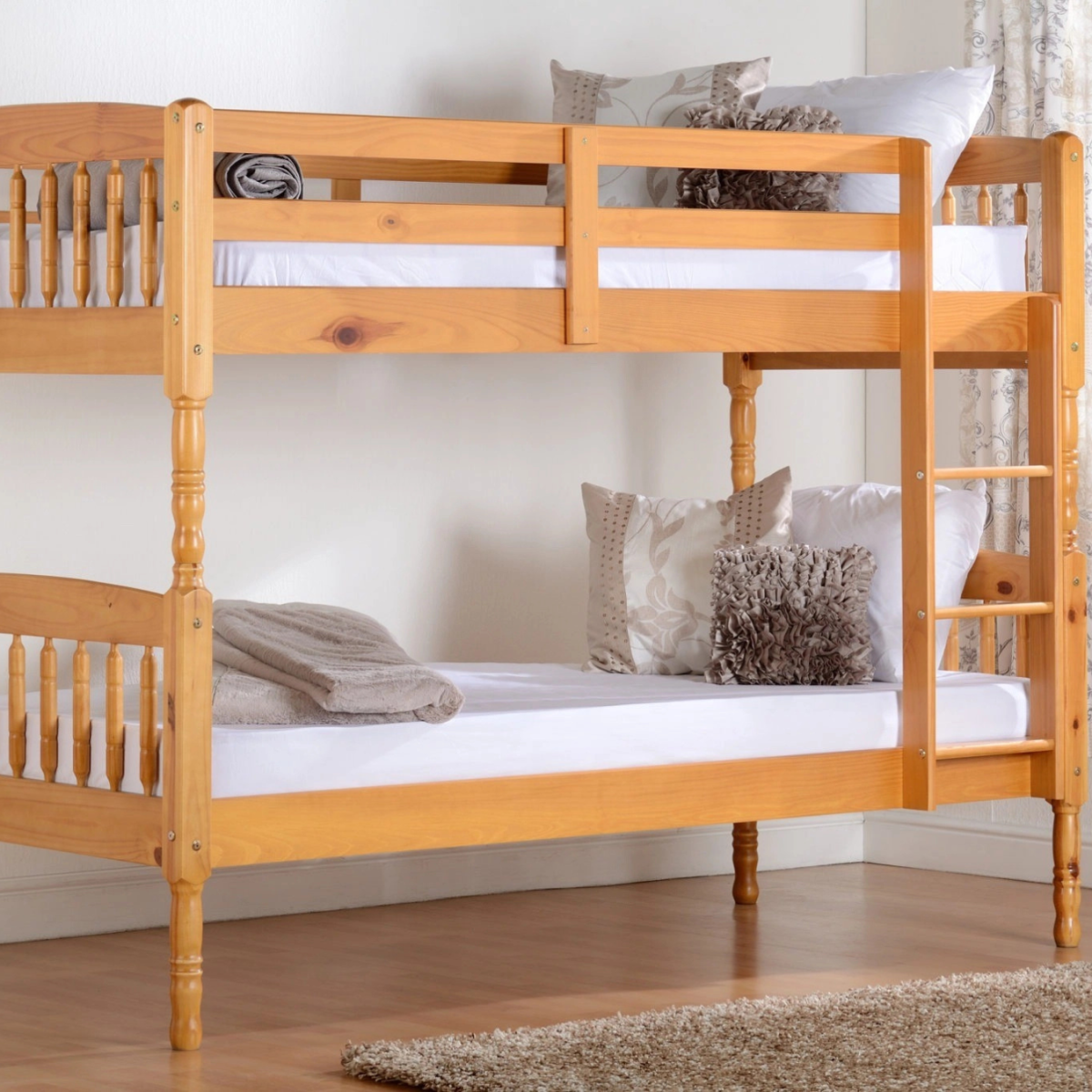 Reference: 200-205-001The Albany 3FT Bunk Bedframe is a sturdy and stylish sleeping solution, crafted from solid pine wood with a light antique finish. Its simple yet timeless design makes it a great addition to any children's bedroom. Built for durability, this bunk bed offers a strong frame for added stability and long-lasting use. A built-in safety fence provides extra security, ensuring peace of mind for parents.