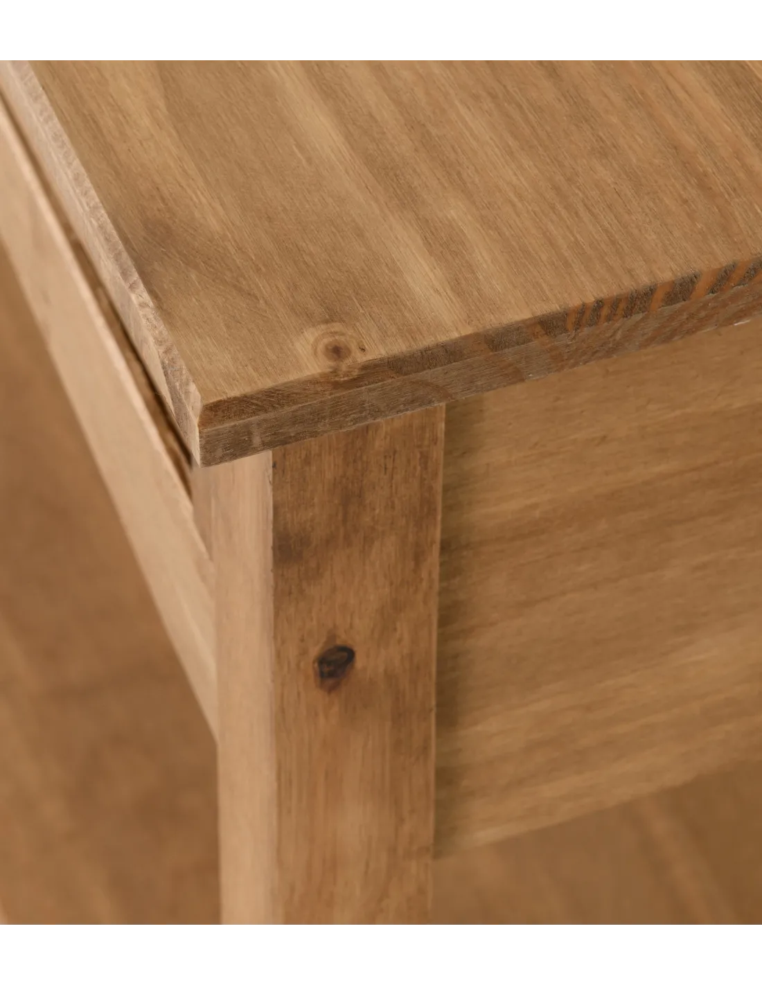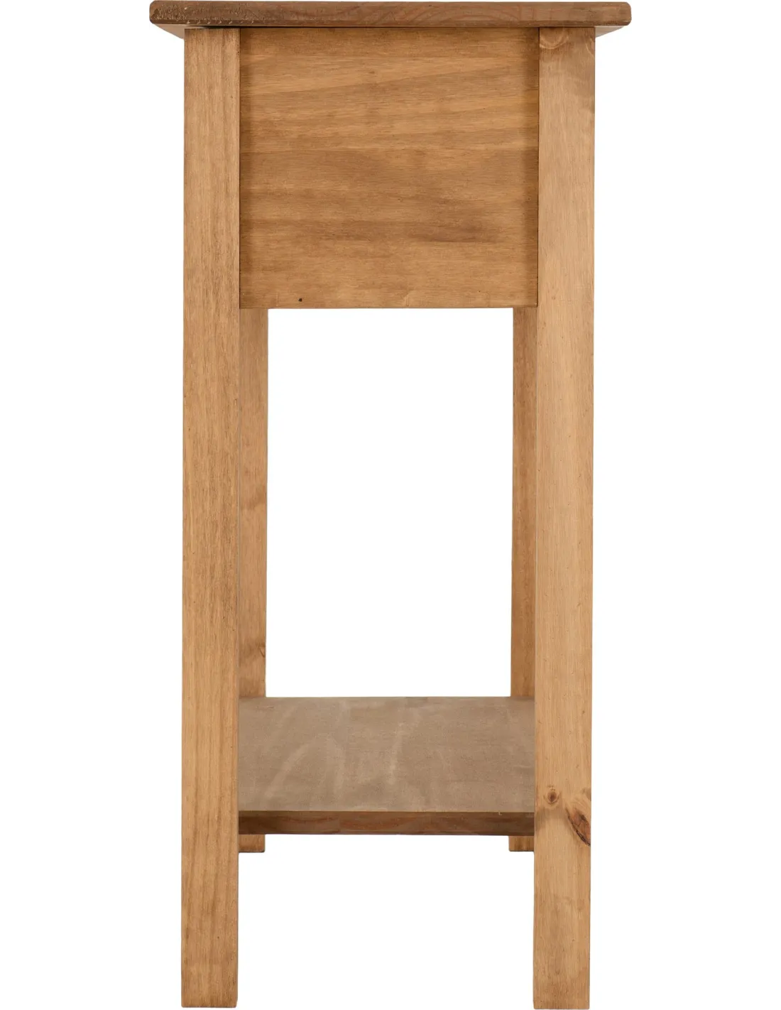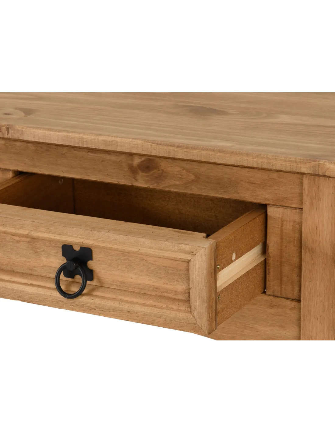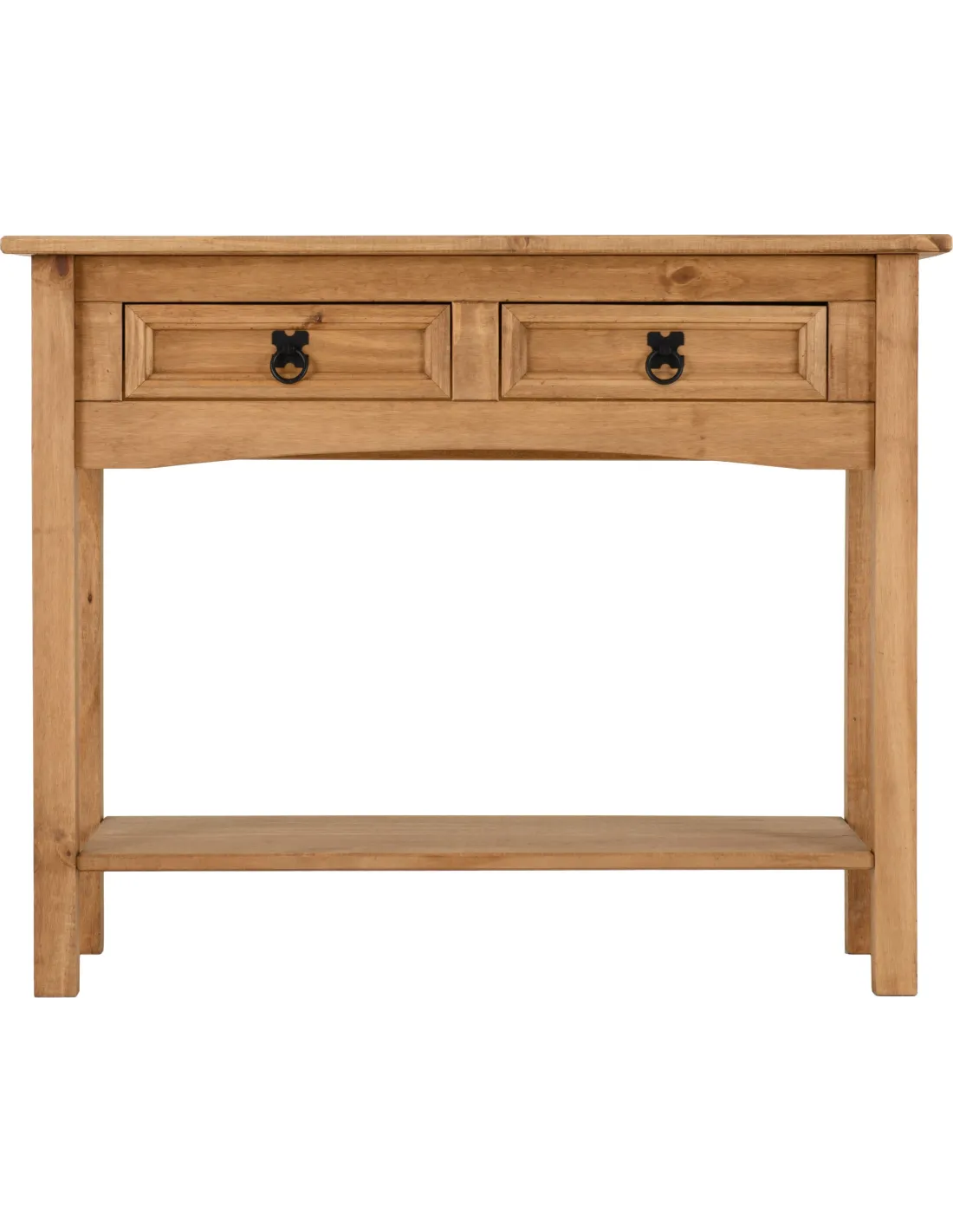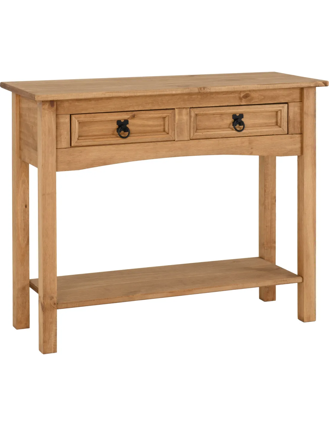 Reference: 300-304-003The Corona console table boasts a distressed waxed pine finish. 2 drawers provide a handy hideaway for mail, keys and more. The spacious top is a great place to sit anything from family pictures to a lamp. The distinctive black metal handle and studs are features that go hand in hand with the range which gives it the authentic Corona look.