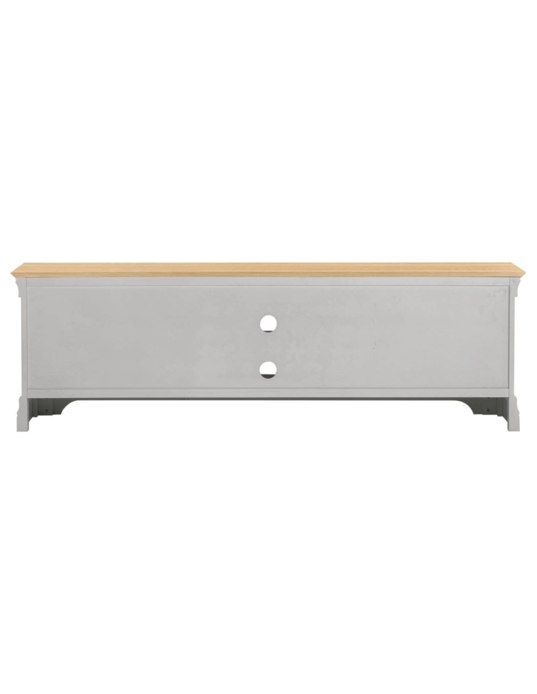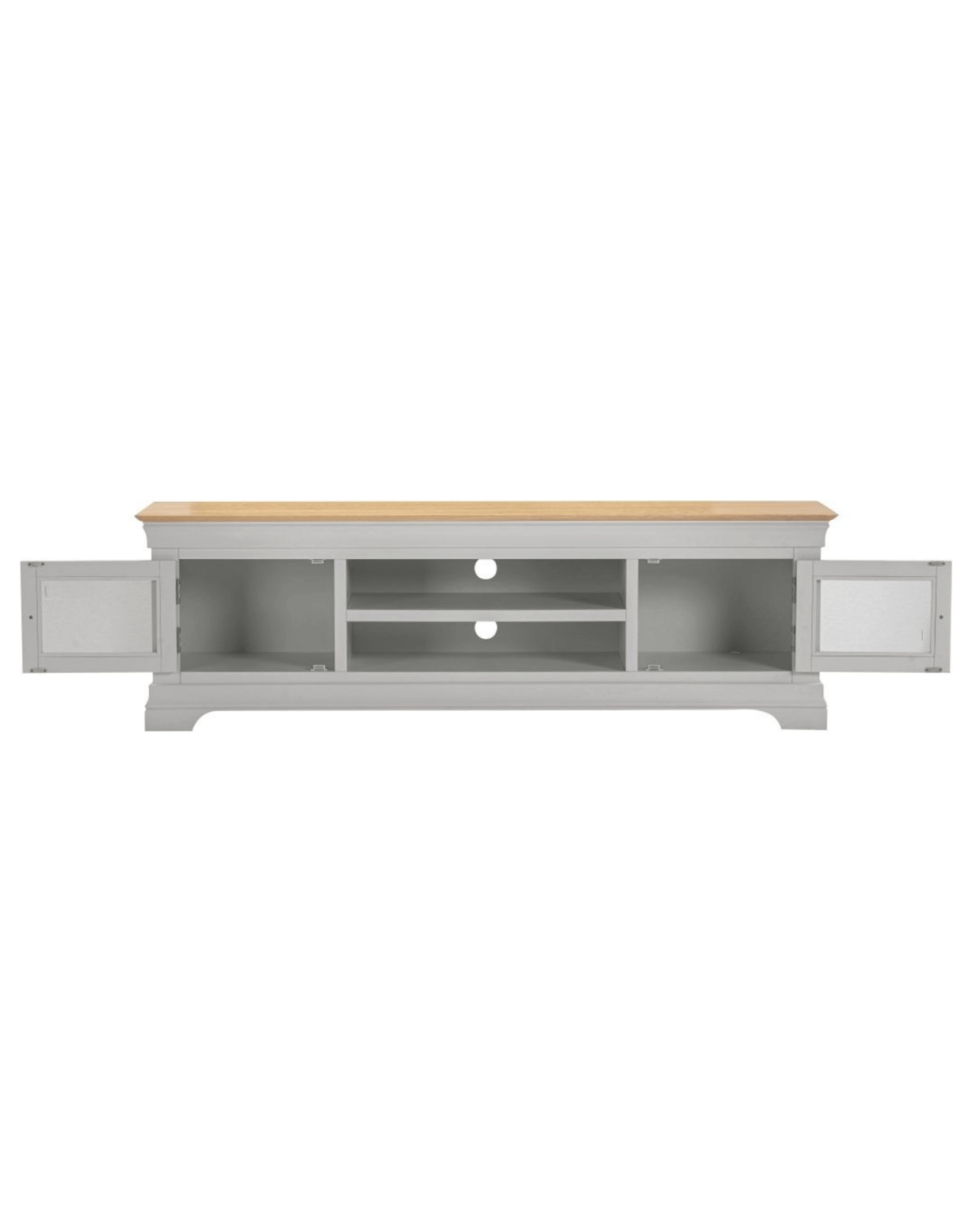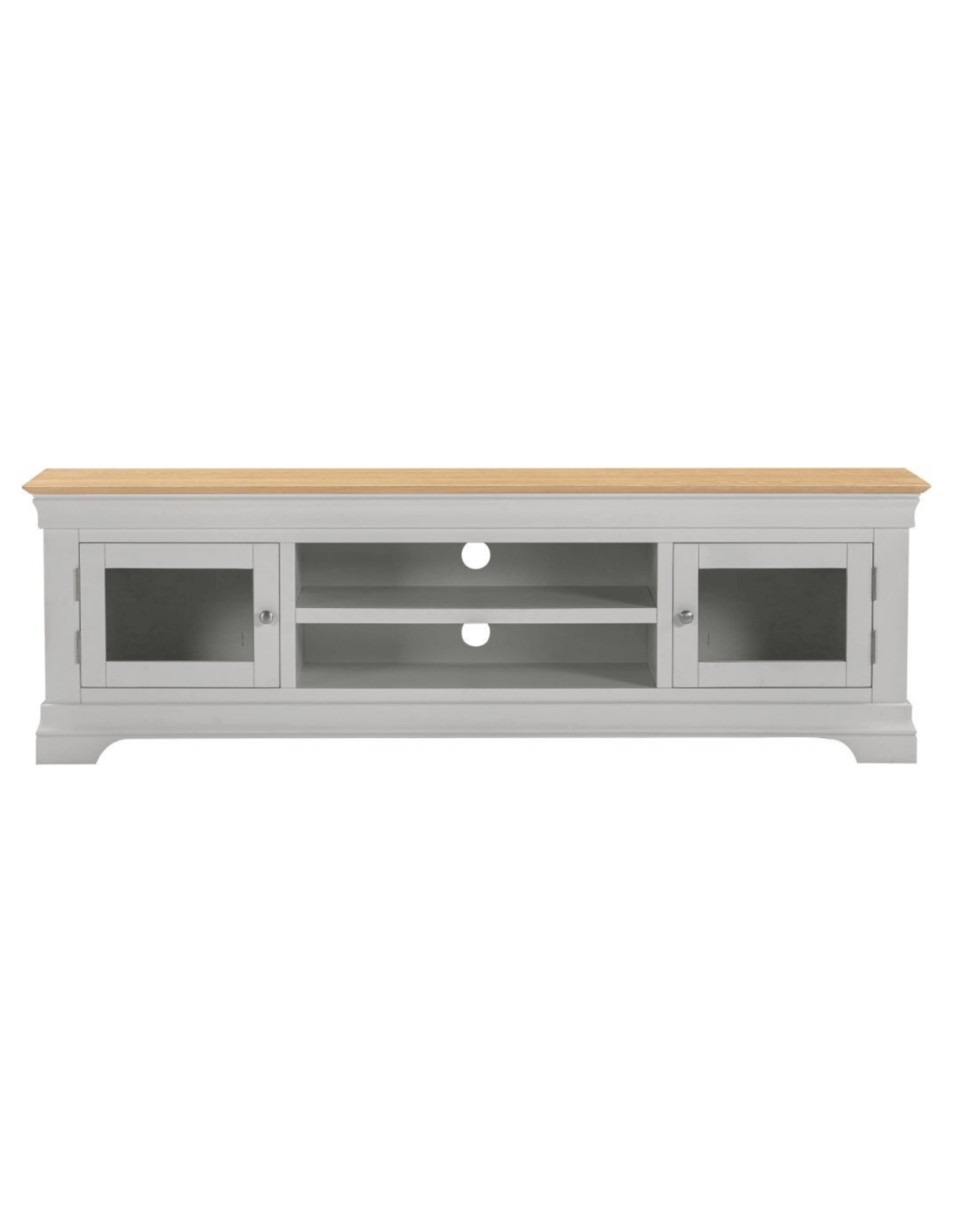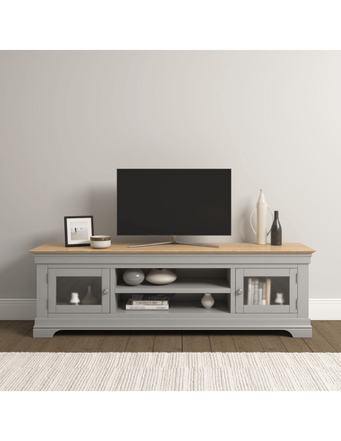 Reference: 300-305-061The Bordeaux TV Stand in Pebble Grey and Oak combines classic design with practical functionality, making it a stylish addition to any living room. Its clean lines and contrasting tones offer a timeless look, while the spacious shelving and concealed cupboard storage provide ample room for media devices, accessories, and more. The sturdy top surface is perfect for supporting large televisions, and the unit’s thoughtful layout helps keep cables and clutter out of sight.