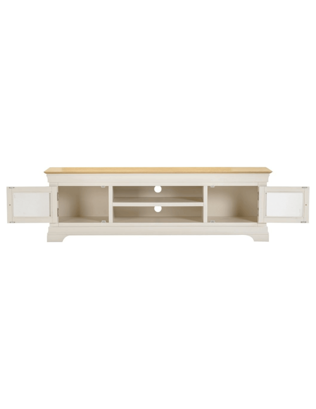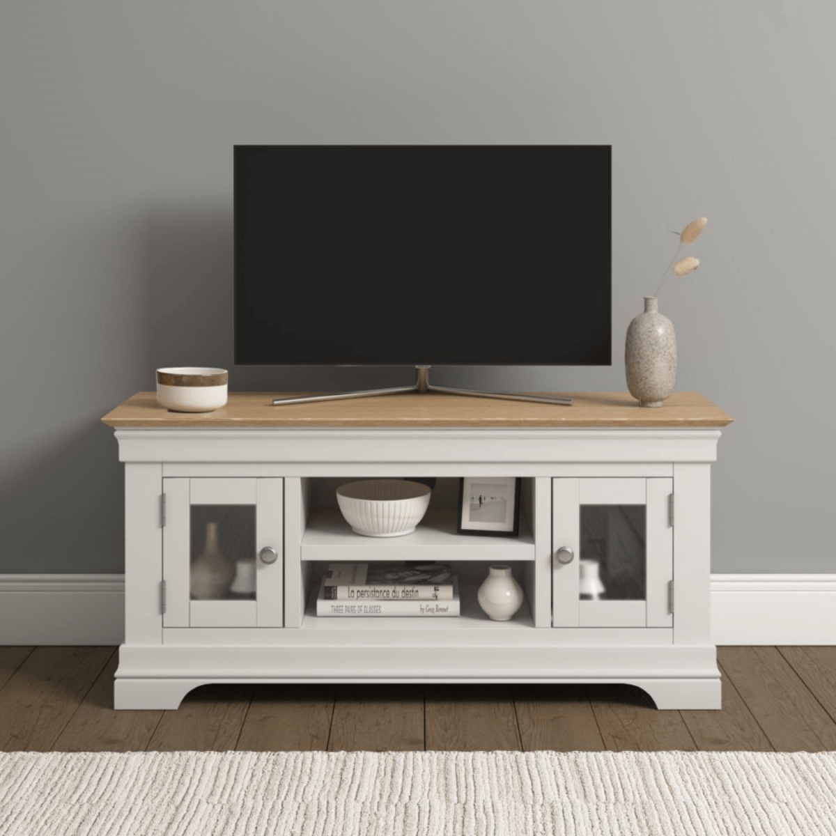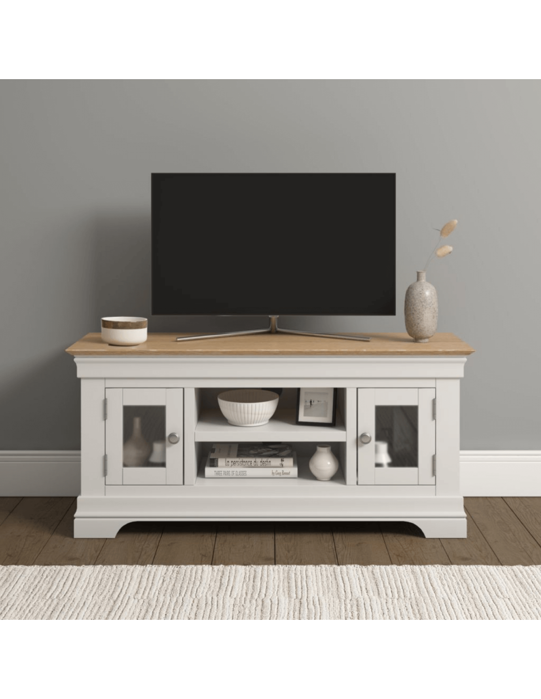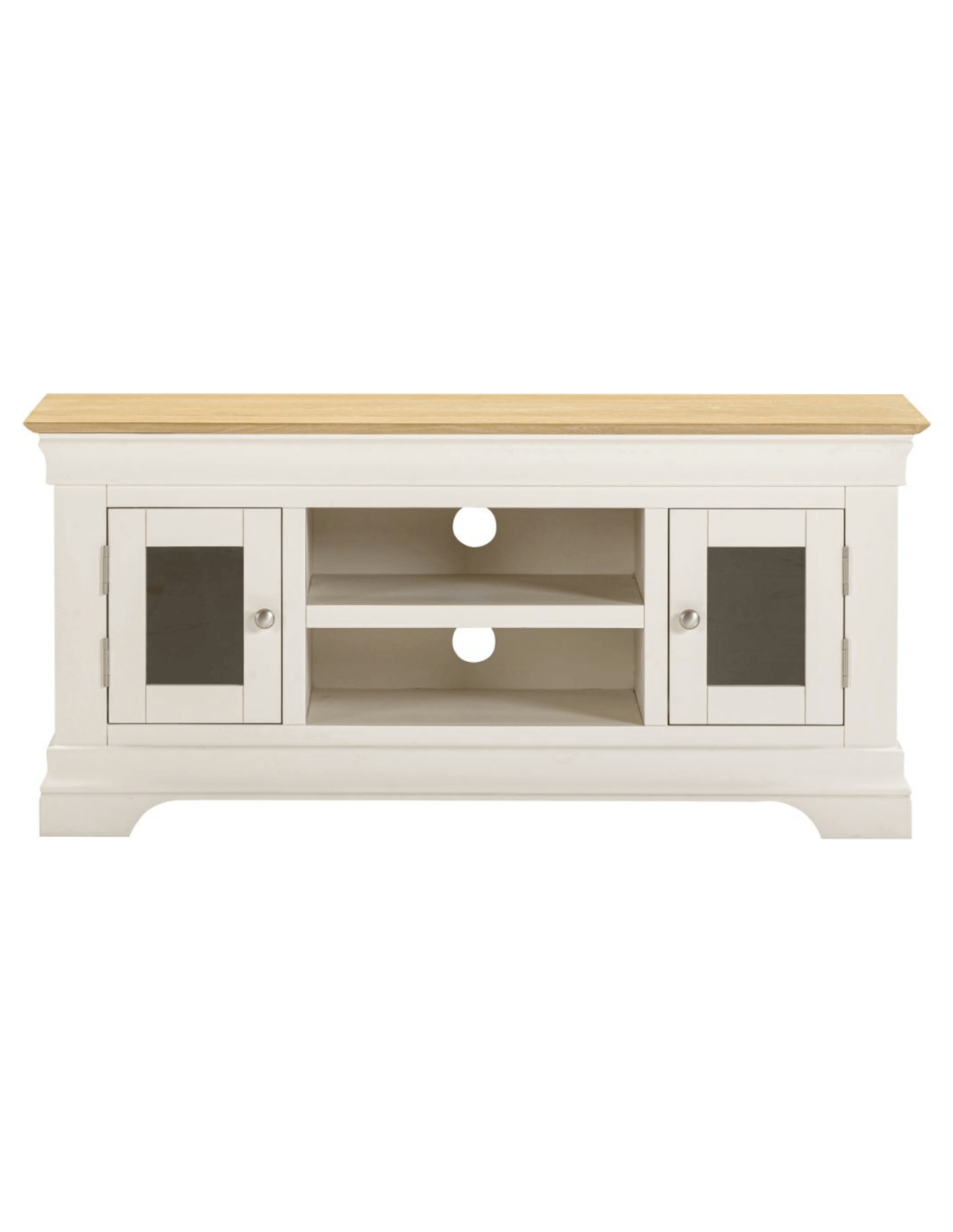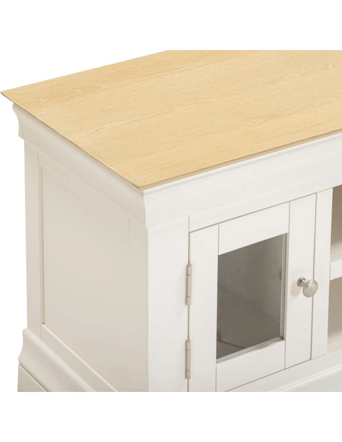 Reference: 300-305-064The Bordeaux Small TV Stand in ivory and oak is a compact yet elegant solution for smaller living spaces. Featuring a painted matt finish, glass inlaid panels, and stylish metal handles, this unit blends classic design with modern detailing. The cupboard storage offers space to keep your media accessories neatly tucked away, while the sturdy top surface accommodates smaller to medium-sized TVs.