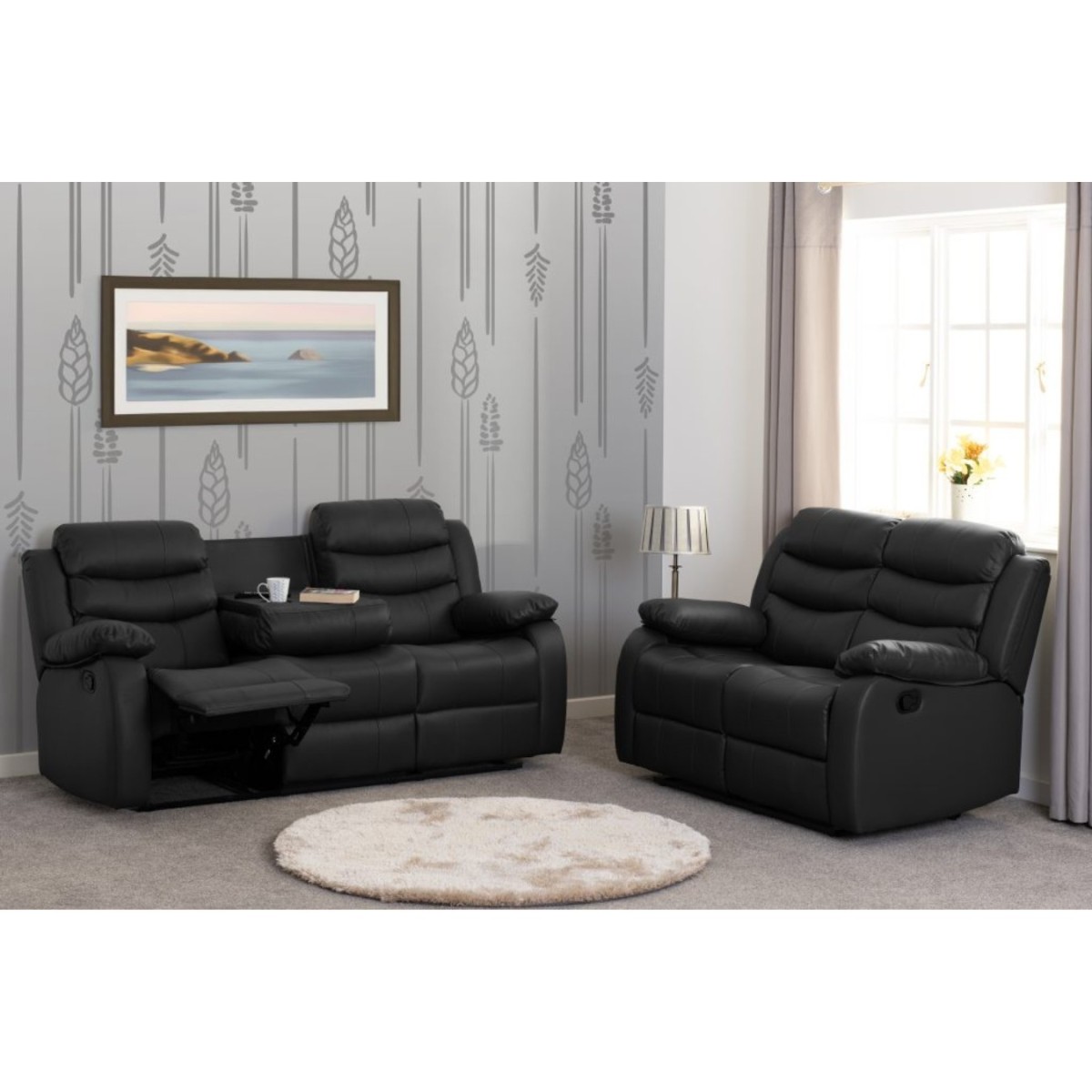Sink into pure relaxation with the Roma 3+2 Seater Recliner Sofa Suite, a perfect blend of comfort, style, and functionality. Upholstered in sleek black faux leather (PU), this eye-catching suite brings a modern edge to your living room while delivering exceptional comfort with its plush, padded design. Both the 3-seater and 2-seater sofas feature manual reclining mechanisms, giving you full control to kick back and unwind at your preferred angle. Whether you're enjoying a solo evening or hosting a movie night, the built-in cupholders in the 3-seater offer added convenience — no need to reach for the coffee table! With generously cushioned backrests and supportive armrests, the Roma suite is designed for total comfort without compromising on style. It’s the ideal choice for anyone looking to upgrade their lounge with luxury seating that performs.