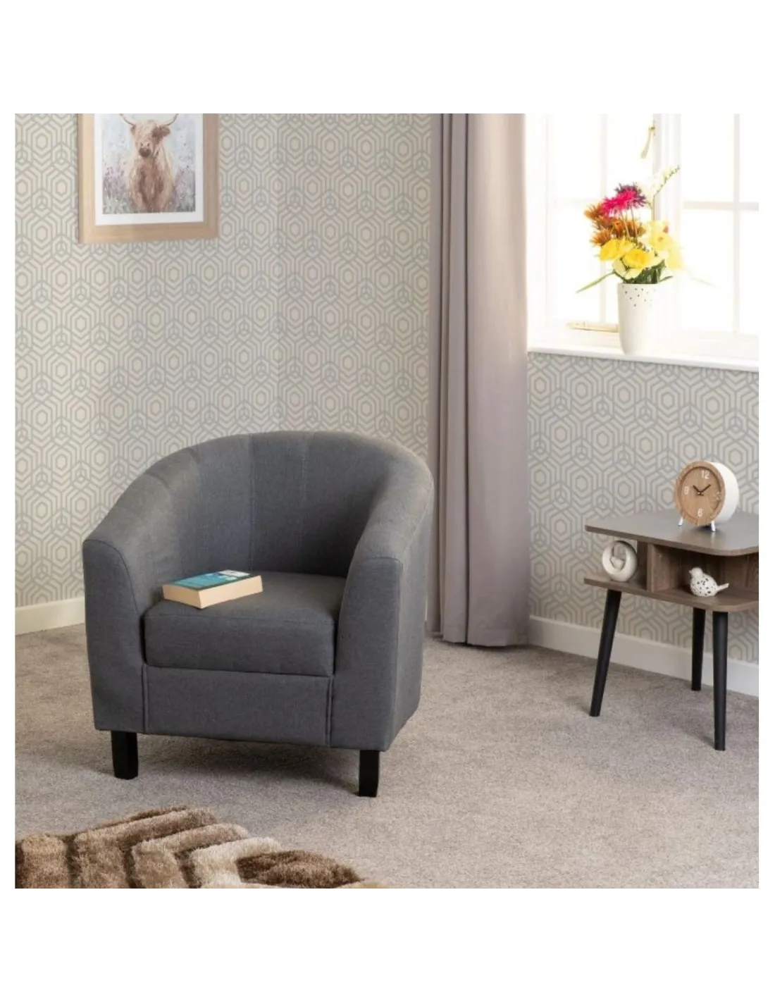 The Tempo Tub Chair combines classic design with cozy comfort, making it a stylish and versatile addition to any home. Upholstered in high-quality grey fabric, this elegant accent chair blends seamlessly into both traditional and contemporary interiors. Whether used to enhance your existing décor or stand alone as a feature piece, its timeless appeal is undeniable. A foam-padded seat and smooth upholstery offer exceptional comfort, while wooden feet provide a refined finishing touch.