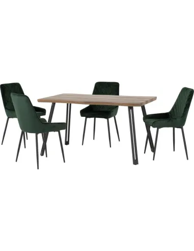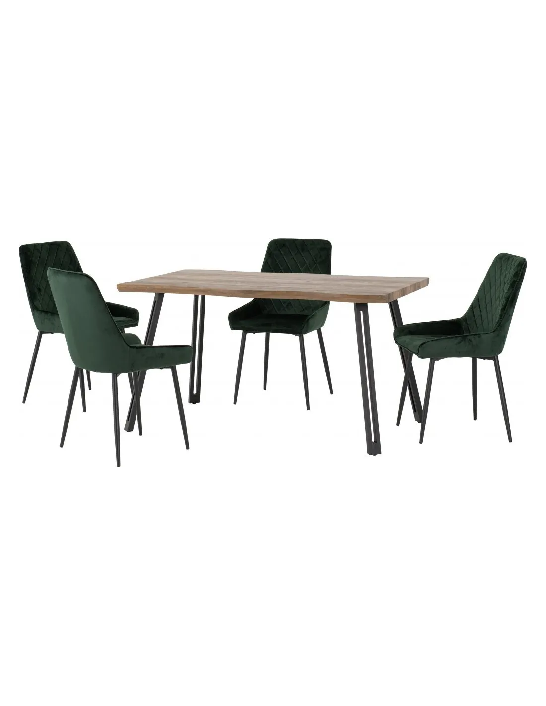 Quebec Wave Edge & Avery Dining Set (x4 Chairs) - Medium Oak Effect/Emerald Green Velvet