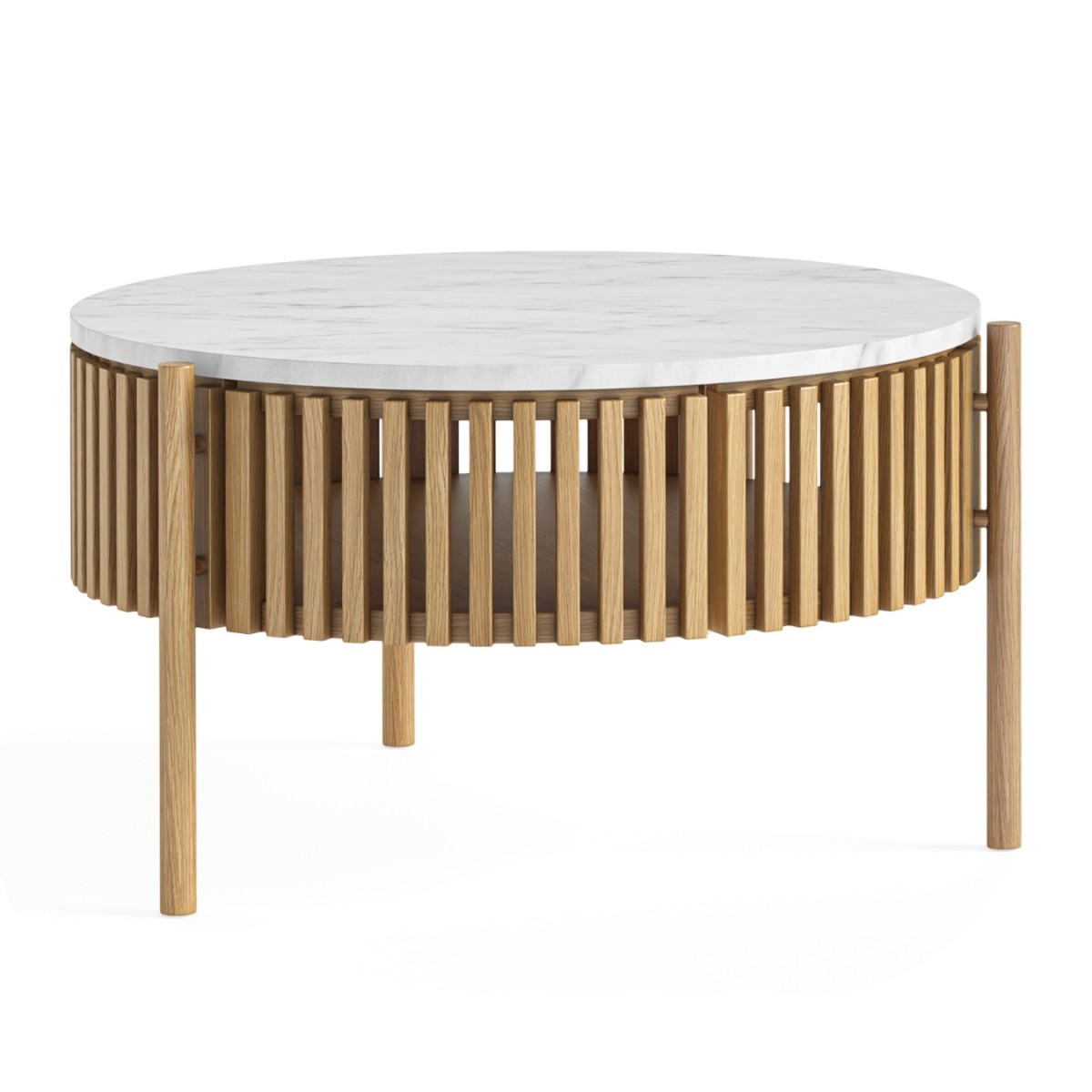 Reference: G8997The Boardwalk Natural Story Coffee Table – Marble Top with Door is part of the Boardwalk range, a masterclass in contemporary design that fuses natural materials with clean, modern lines. Its slatted front door design is beautifully balanced by gently curved edges, creating an airy, textured look that adds character to your living space. A solid marble top adds a luxurious contrast to the warm natural oak finish, enhancing its refined, elegant feel. The built-in storage compartment with a slatted door offers both style and function, making this coffee table an ideal centrepiece for modern living rooms. Gold handles finish the look with a touch of understated sophistication.