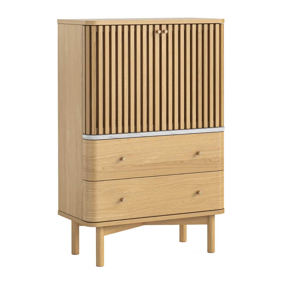 Reference: G9008The Boardwalk Natural Shoe Cabinet – Marble Top is a stylish and functional addition to any hallway or entryway. Part of the Boardwalk range, it showcases the collection’s signature contemporary design, combining natural materials, clean lines, and elevated detailing. This cabinet features 2 slatted doors that open to reveal ample shoe storage, along with 2 upper drawers for smaller essentials like keys, gloves, or accessories. The solid marble top adds a luxurious contrast to the warm oak finish, while gently curved edges and elegant gold handles complete the sleek, refined look.