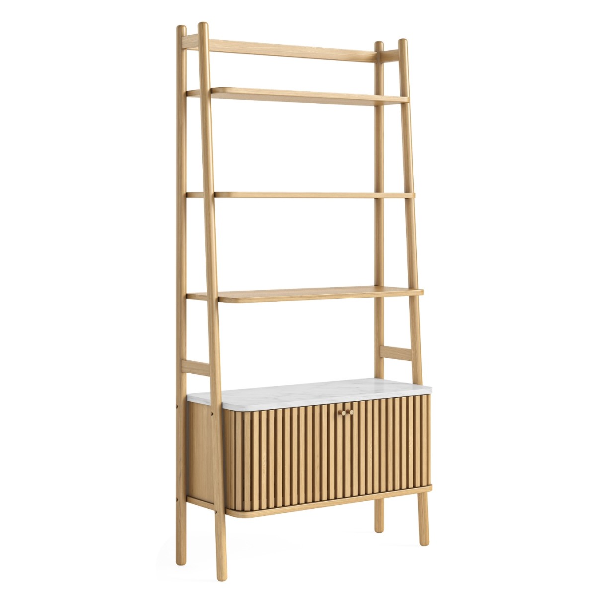 Reference: G9009The Boardwalk Natural Bookcase – Marble Top combines elegant design with practical storage, making it a versatile addition to any living space. Part of the Boardwalk range, it features a beautiful blend of natural materials and contemporary styling, characterized by clean lines and sophisticated details. The bookcase offers open shelving above for display or books, with two slatted cupboard doors below for concealed storage. The solid marble top adds a luxurious touch, while the gently curved edges and minimalist gold handles provide softness and refinement to the streamlined frame.