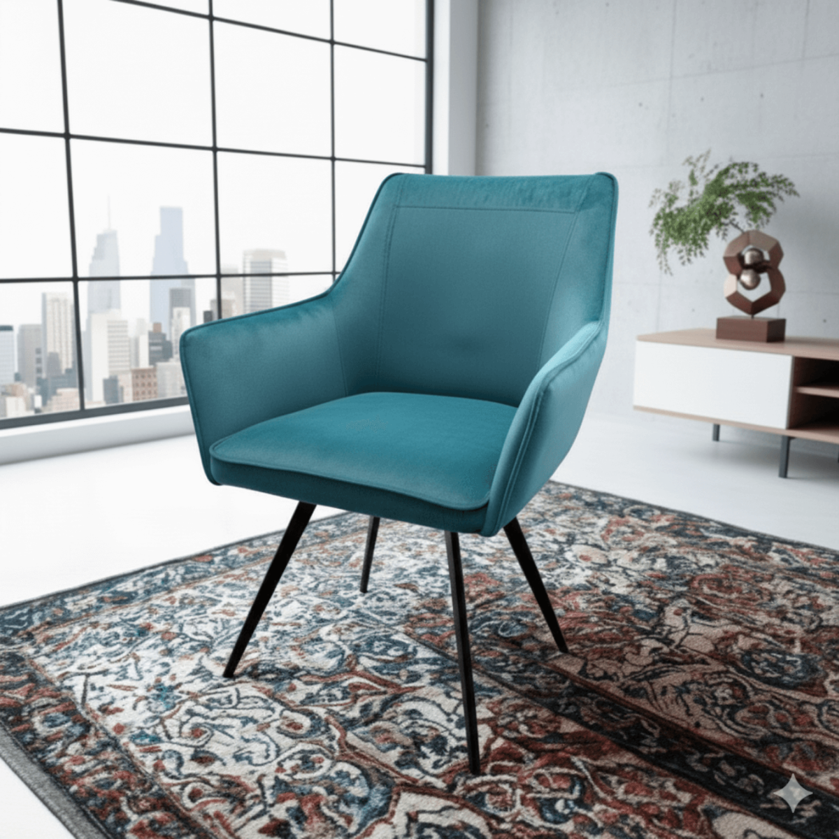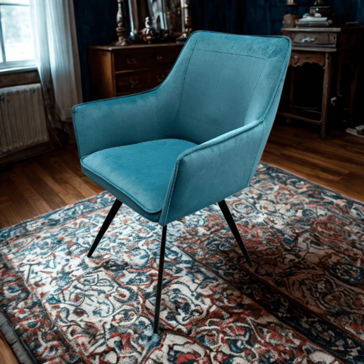 The Rivoli Dining Chair in velvet green adds elegance and sophistication to any dining setting. Upholstered in a rich green velvet, it brings both comfort and a luxurious finish. Its slender silhouette is complemented by sleek black legs, providing a modern contrast and lasting stability. Stylish yet practical, the Rivoli Dining Chair is a versatile choice for both contemporary and traditional interiors.