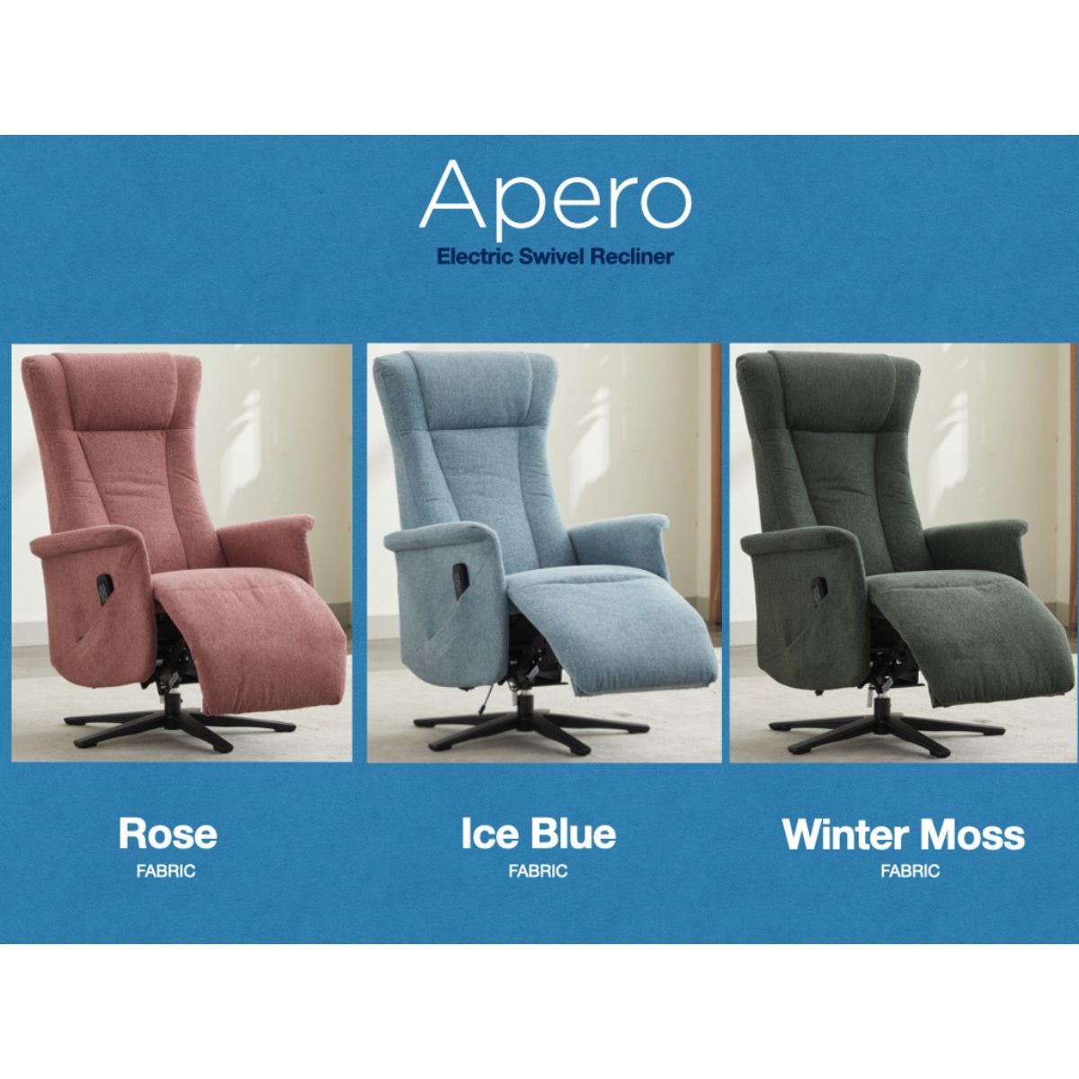 Reference: 16624The Apero TV Chairs offer the perfect blend of comfort, functionality, and modern elegance, available in both Electric Swivel Action and Manual Push-Back with an optional stool. Upholstered in Rose, Ice Blue, and Winter Moss, they add a fresh, contemporary touch to any living space, allowing you to sit back and unwind with ease.