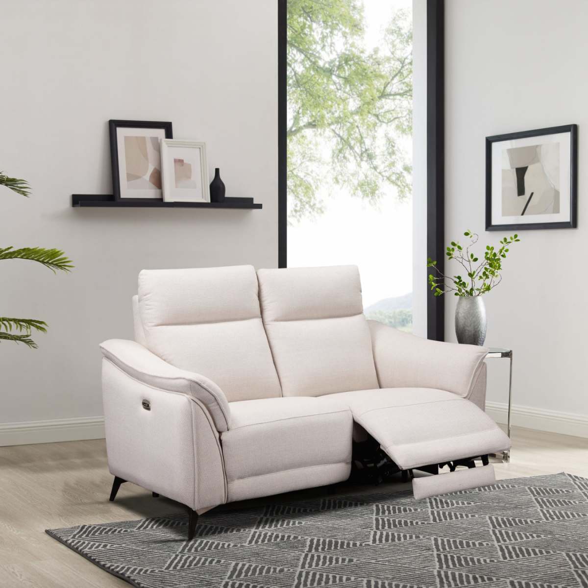 Reference: Austin 2 SeaterIntroducing the Austin Sofa range, a versatile fabric suite in soft white that combines comfort, style, and practicality. The 2-seater sofa is designed to bring relaxation and modern convenience to your living space. Both sides of every seat feature electric button recliners, allowing you to stretch out and unwind with ease. Built-in USB charging ports add a practical touch, keeping your devices powered while you relax.