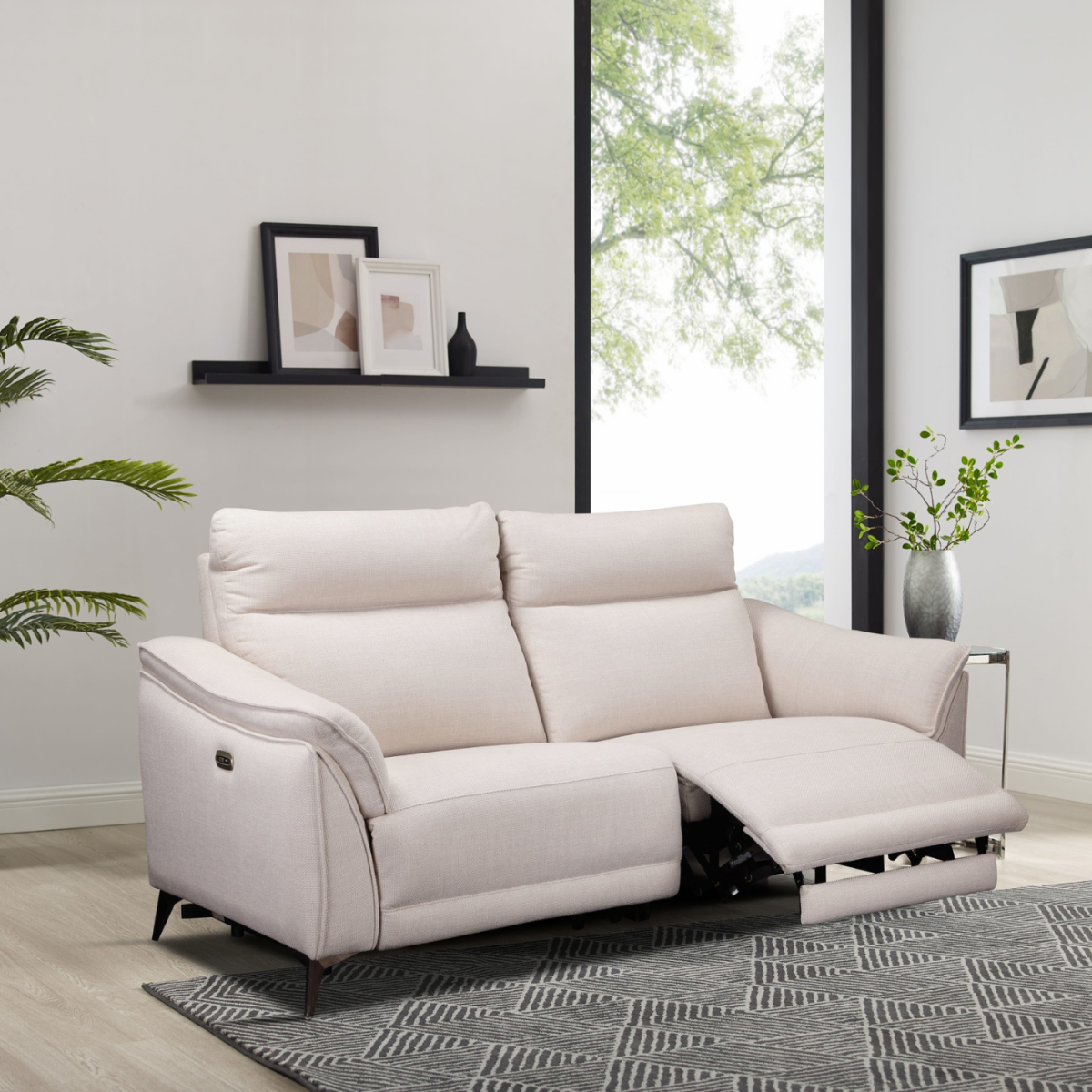 Reference: Austin 3 SeaterIntroducing the Austin Sofa range, a versatile fabric suite in soft white that combines comfort, style, and practicality. The 3-seater sofa is designed to bring relaxation and modern convenience to your living space. Both sides of every seat feature electric button recliners, allowing you to stretch out and unwind with ease. Built-in USB charging ports add a practical touch, keeping your devices powered while you relax.