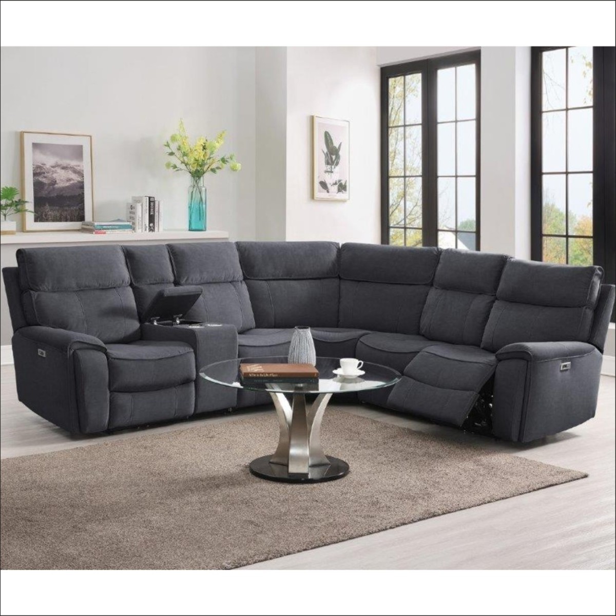 Reference: SHELDONCORNERGREYThe Avenue Corner Sofa is the ultimate in comfort and functionality. Upholstered in beige or grey, this spacious power recliner features a static centre console with built-in cup holders and storage. Designed with plush seating, matching piping, and a solid frame, it’s perfect for relaxing with family or entertaining guests. This modular design allows for both left-hand facing (LHF) or right-hand facing (RHF) orientation, making it easy to adapt to your living space.