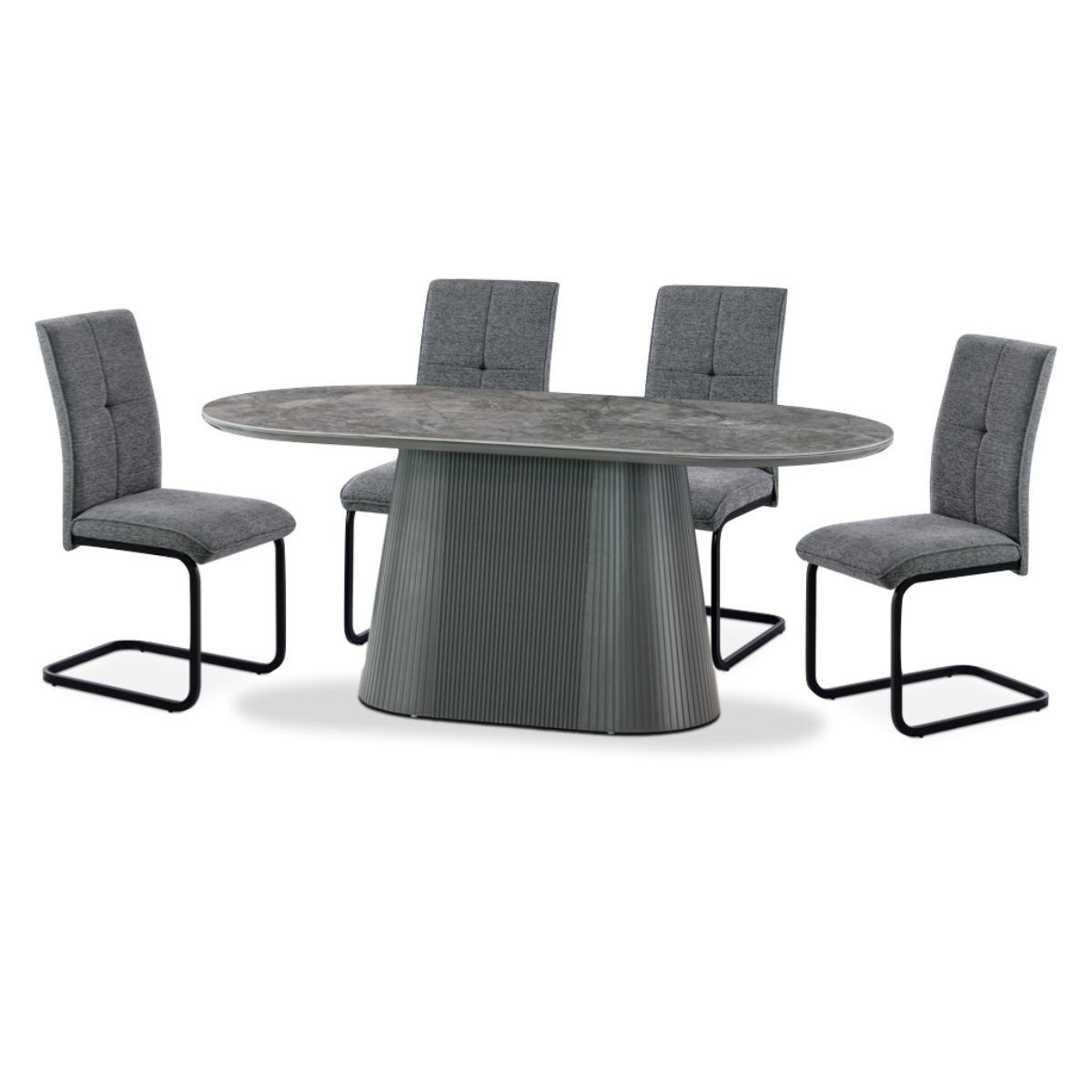 Reference: 16630The Barletta Sintered Stone Collection offers a perfect balance of contemporary design and durability. Featuring a 180cm fixed sintered stone dining table with a striking pedestal base and a dark grey finish, this range brings a bold, elegant touch to any dining space. The collection also includes a console table, coffee table, and end table, ensuring a cohesive, modern aesthetic throughout your home.
