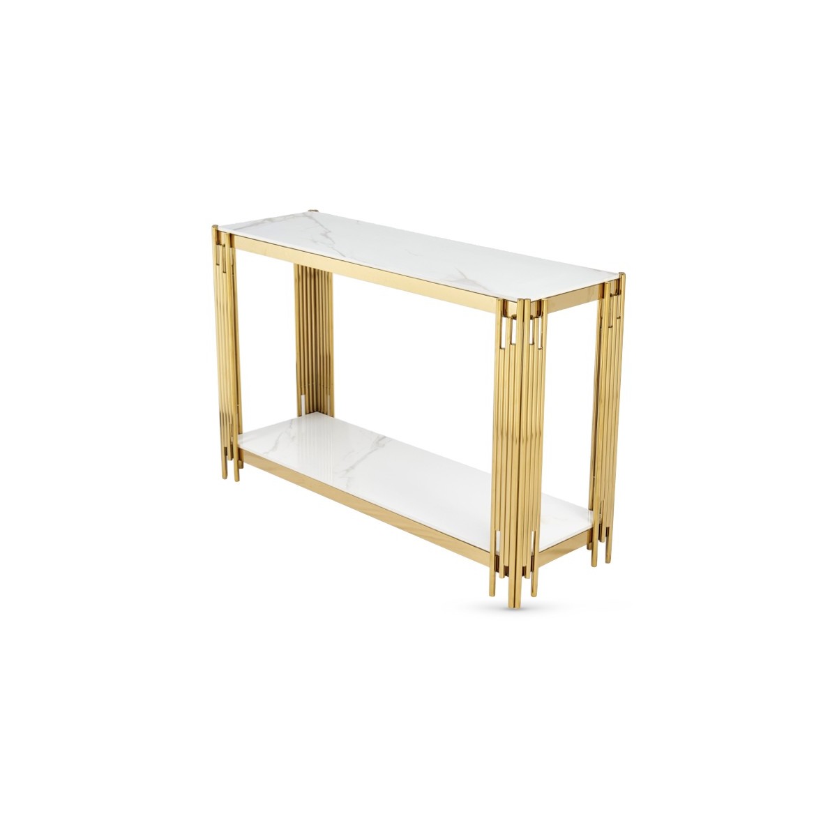 Reference: 14894Unite functionality and elegance with our Belini Collection, available in three on-trend finishes - sintered stone and gold, sintered stone and stainless steel or glass and stainless steel. Each piece combines durability with exquisite design. The sturdy frames ensure longevity, while the sintered stone and tempered glass tops exude a natural, organic appeal. Bring a harmonious blend of contemporary aesthetics and practicality into your home with these stunning pieces. The Belini range will become the centerpiece of your interior.