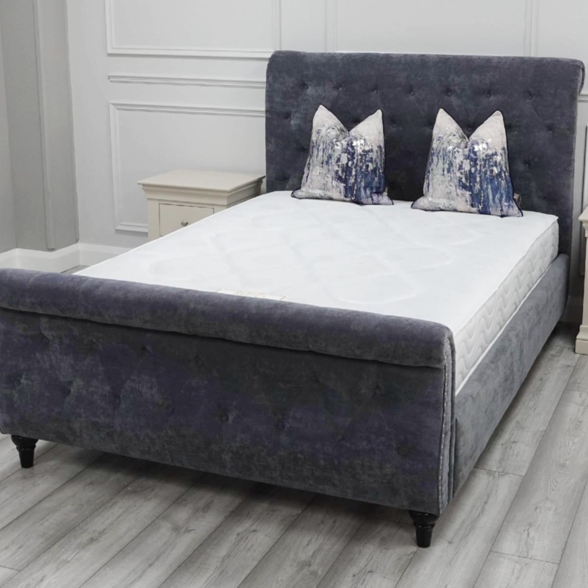 Reference: Swangrey50The Birlea Castello Bed is a luxurious and timeless centerpiece for any bedroom, combining classic design elements with modern comfort. Upholstered in plush pewter grey velvet, it features a beautifully buttoned scroll-style headboard and foot end that create an elegant, tufted look. Studded detailing along the edges adds a refined touch of sophistication, while the smooth velvet upholstery wraps around the frame for a sleek and seamless finish. The bed is supported by gracefully turned wooden legs, enhancing its traditional charm while ensuring durability.