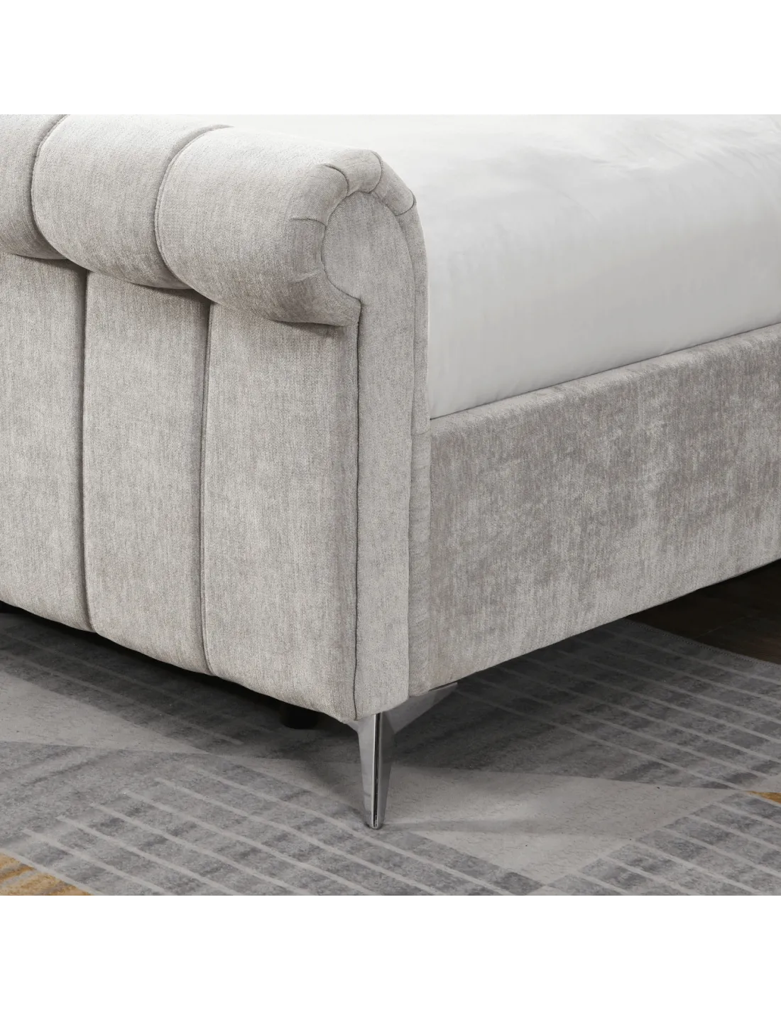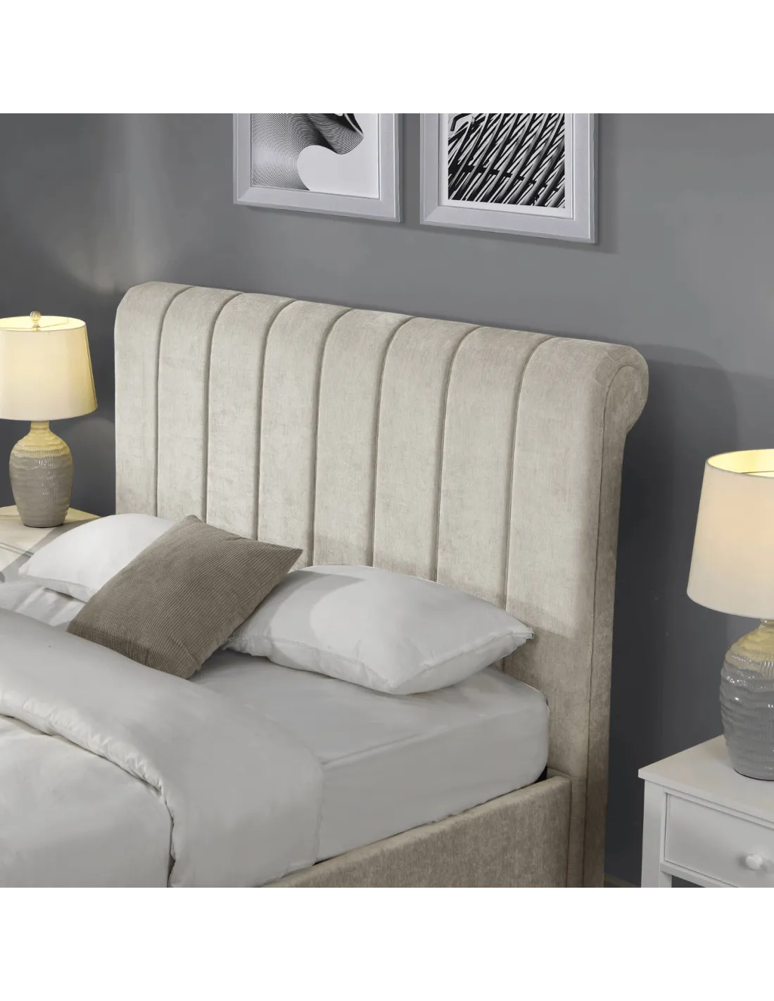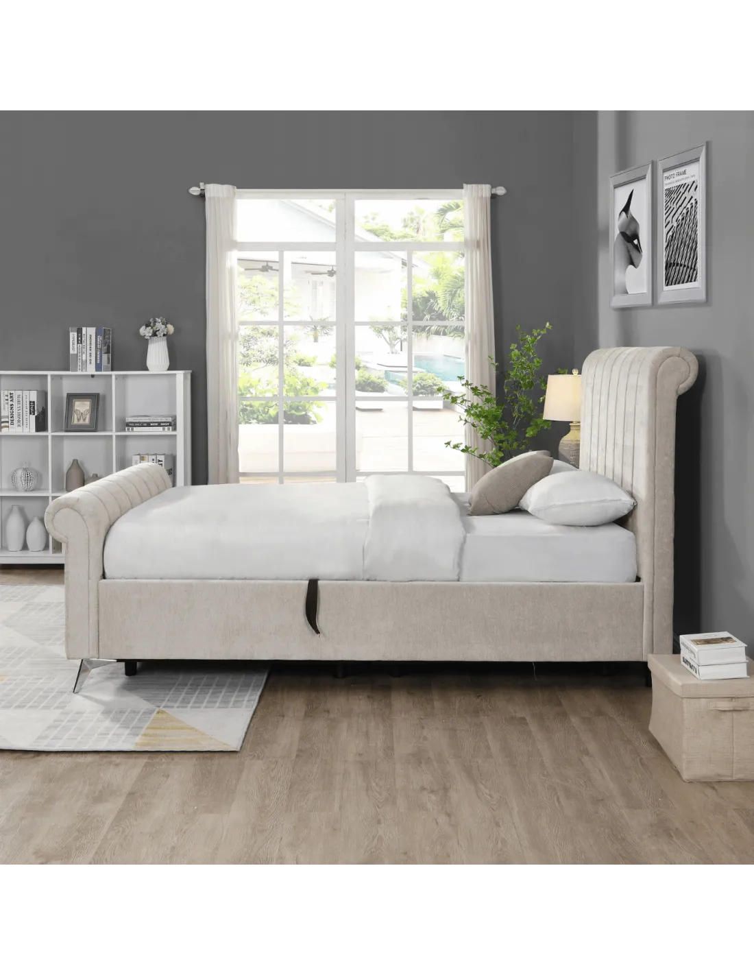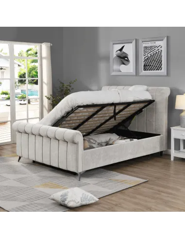 Reference: Carlow 4,6 Beige Side Gas Lift BedThe Carlow side lift gas bedframe is an elegantly upholstered piece that perfectly balances luxurious style with practical storage. Featuring a beautifully padded scroll headboard and footboard with indented detailing, it adds both comfort and visual depth to your bedroom. Upholstered in beige velvet fabric, the Carlow bedframe brings a warm, sophisticated touch to any setting. Its side lift gas mechanism reveals a spacious storage area beneath the mattress—ideal for keeping your room clutter-free. Finished with modern chrome feet, this bed is a true fusion of elegance and functionality.