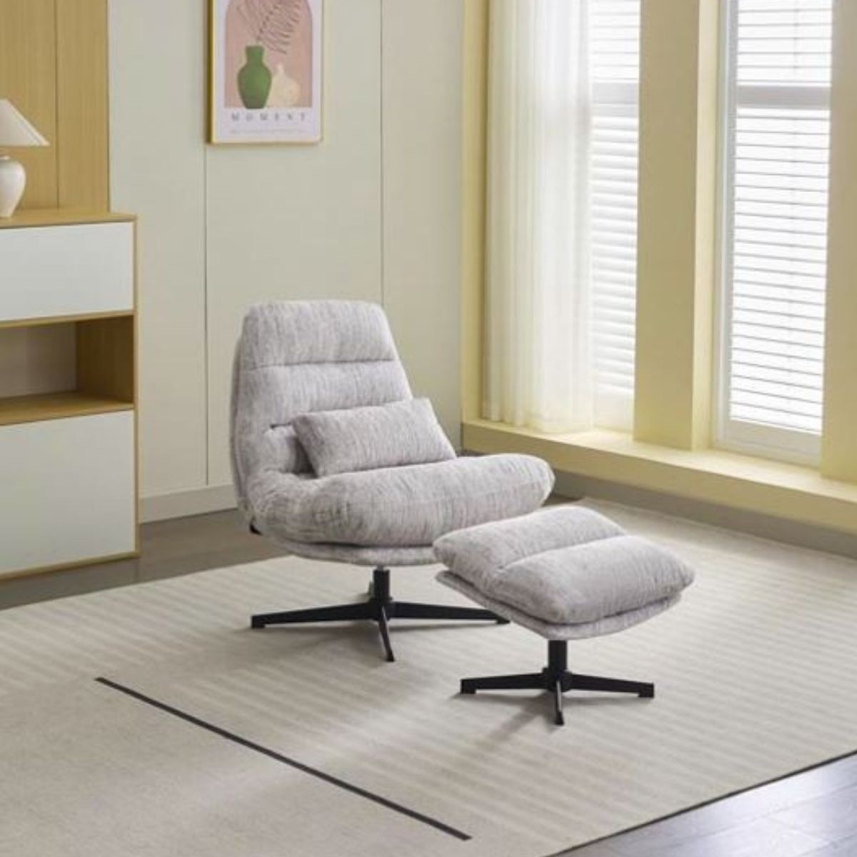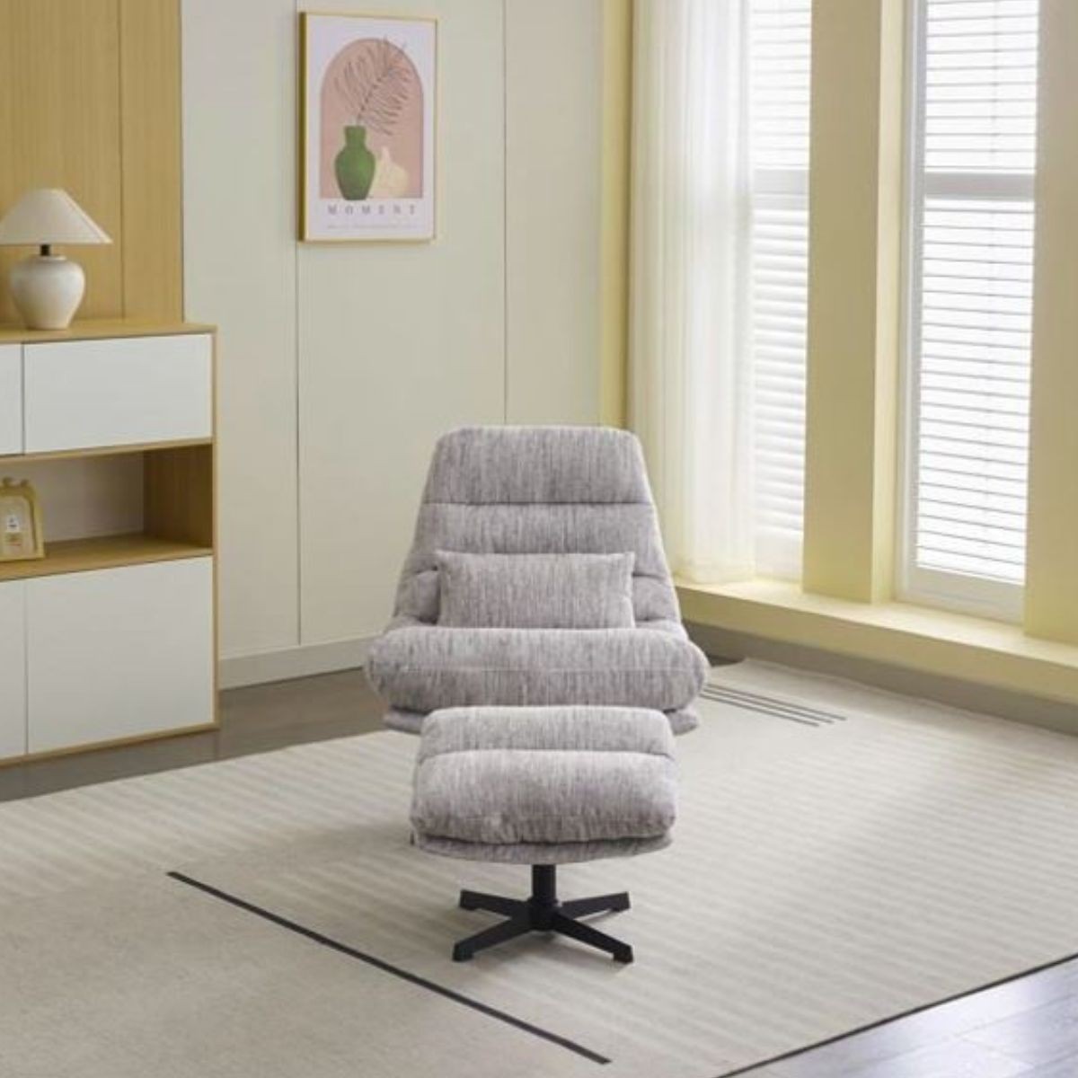 Reference: Turner1ashThe Columbia Leisure Chair with Footstool is an inviting, armless swivel accent piece that blends modern style with exceptional comfort. Designed for relaxation and versatility, this chair features 360-degree rotation and a sturdy metal base, allowing you to unwind from any angle. Upholstered in soft, tactile fabric, it offers a luxurious feel while maintaining a contemporary look, making it a perfect addition to any living space.