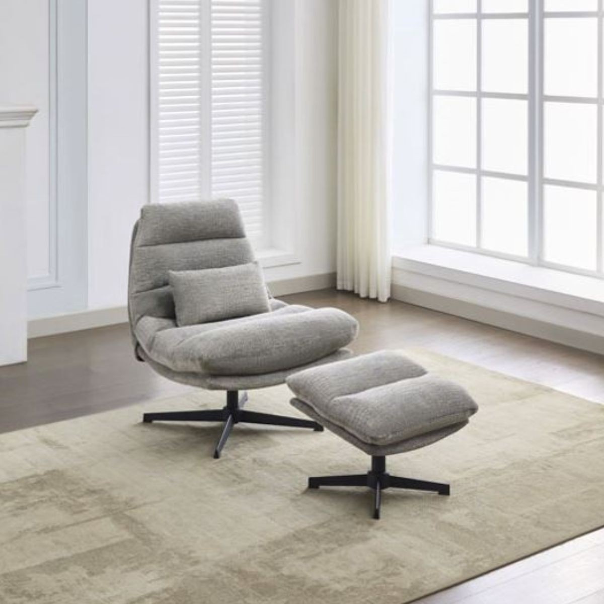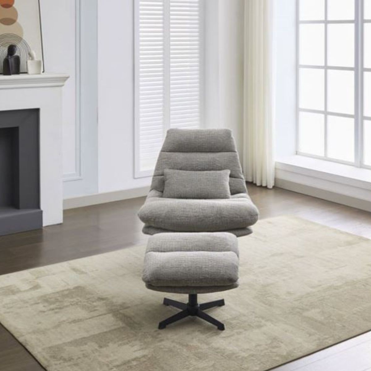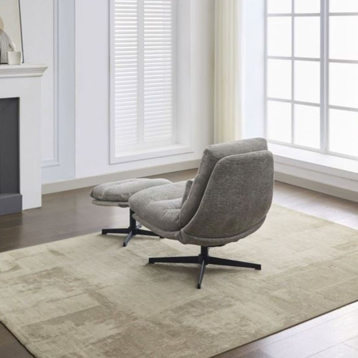 Reference: Turner1greyThe Columbia Leisure Chair with Footstool is an inviting, armless swivel accent piece that blends modern style with exceptional comfort. Designed for relaxation and versatility, this chair features 360-degree rotation and a sturdy metal base, allowing you to unwind from any angle. Upholstered in soft, tactile fabric, it offers a luxurious feel while maintaining a contemporary look, making it a perfect addition to any living space.