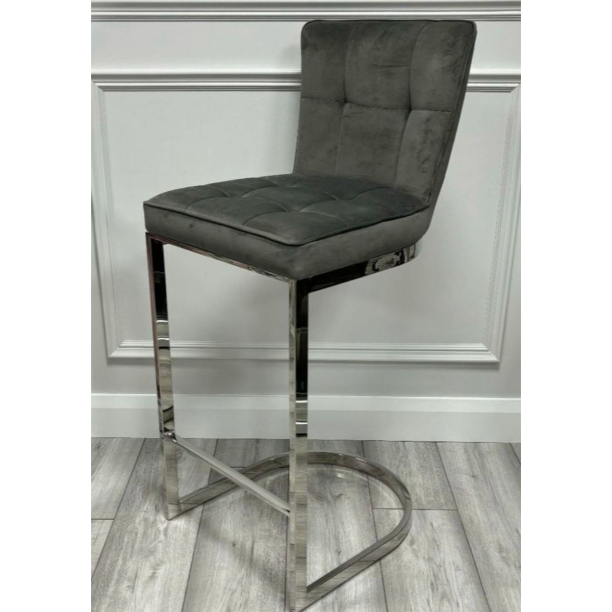 Reference: BellastoolgreyThe Corrigan Dining Range is upholstered in soft grey fabric, combining both comfort and style. The seat and backrest are stitched and buttoned in a square pattern, adding texture and visual interest. Supported by sleek silver steel legs, with rounded back legs, the range delivers a modern, contemporary appeal. Perfect for adding a touch of elegance to any bar or kitchen setting.