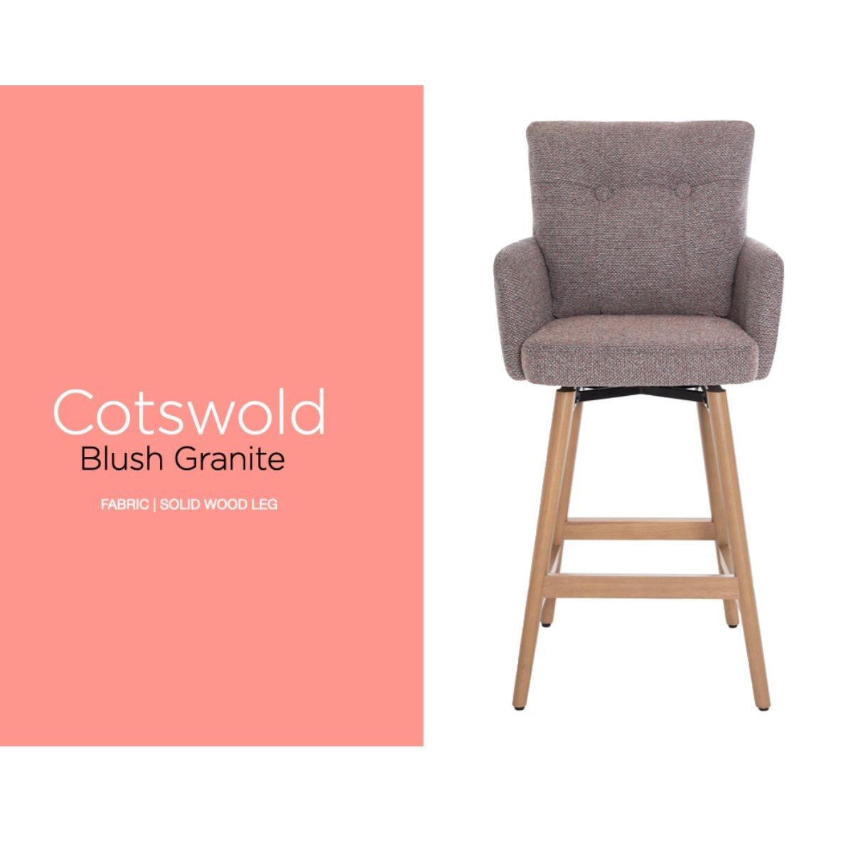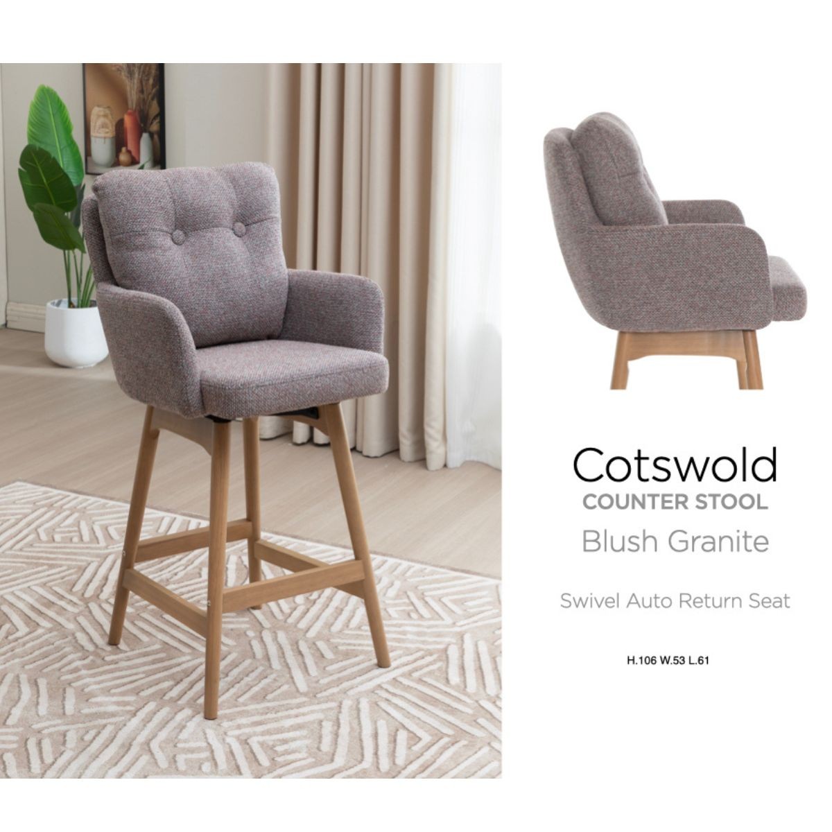 Reference: 16717The Cotswold range blends contemporary elegance with timeless craftsmanship. Crafted from solid wood in a beautiful oak finish, these stools and chairs feature an auto-swivel return seat for added functionality. Upholstered in a choice of four curated fabric colours—blush pink, blush granite, storm teal, and silver grey—the Cotswold collection brings both comfort and sophistication to your dining or bar space.