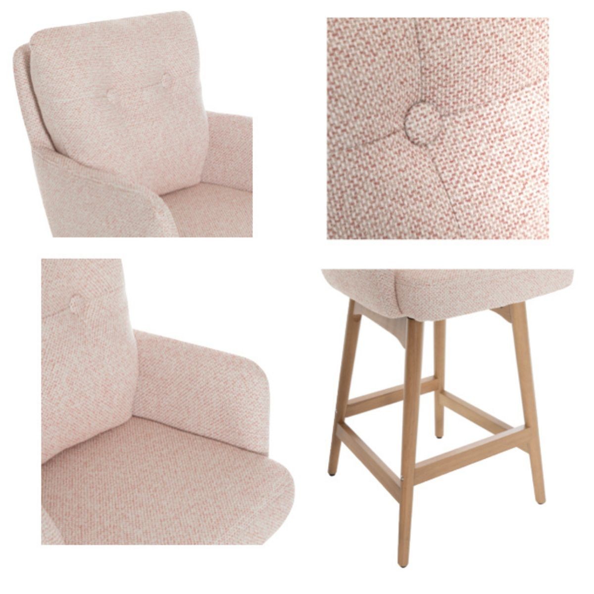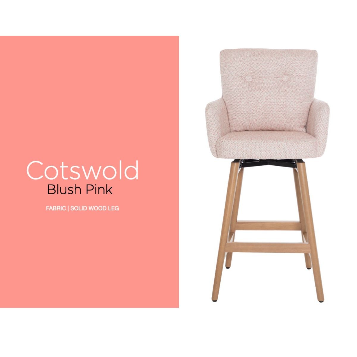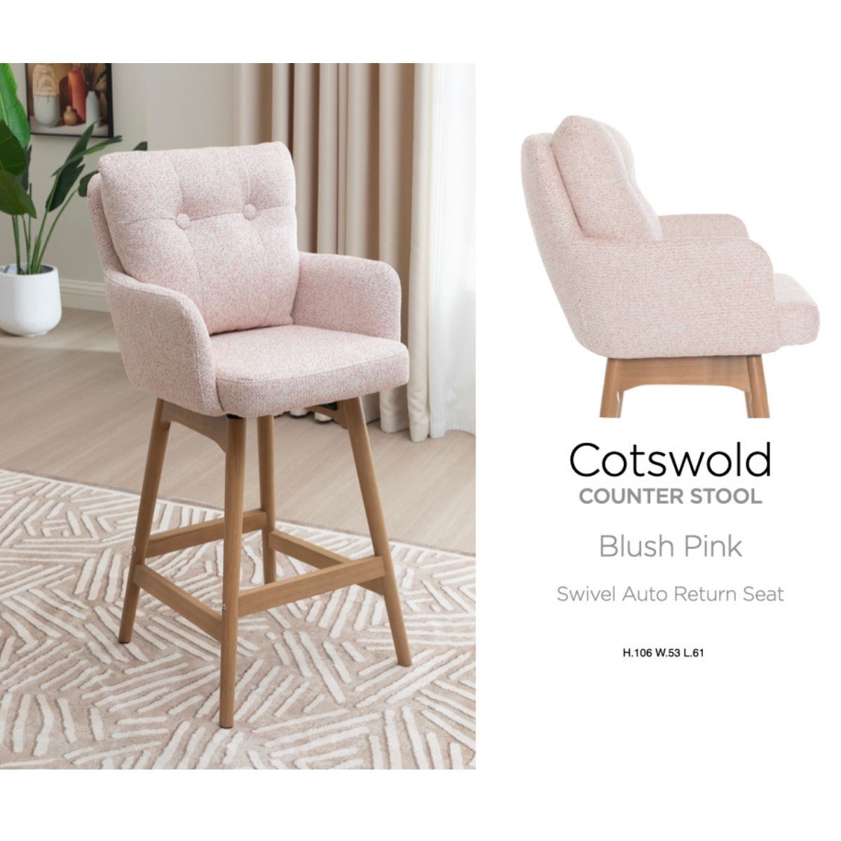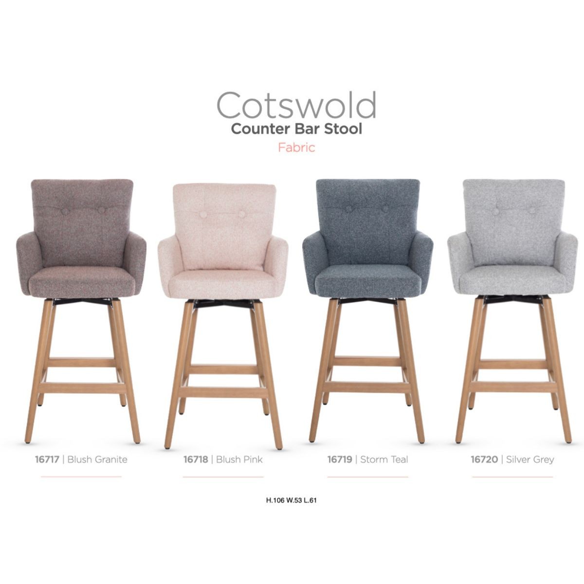 Reference: 16718The Cotswold range blends contemporary elegance with timeless craftsmanship. Crafted from solid wood in a beautiful oak finish, these stools and chairs feature an auto-swivel return seat for added functionality. Upholstered in a choice of four curated fabric colours—blush pink, blush granite, storm teal, and silver grey—the Cotswold collection brings both comfort and sophistication to your dining or bar space.