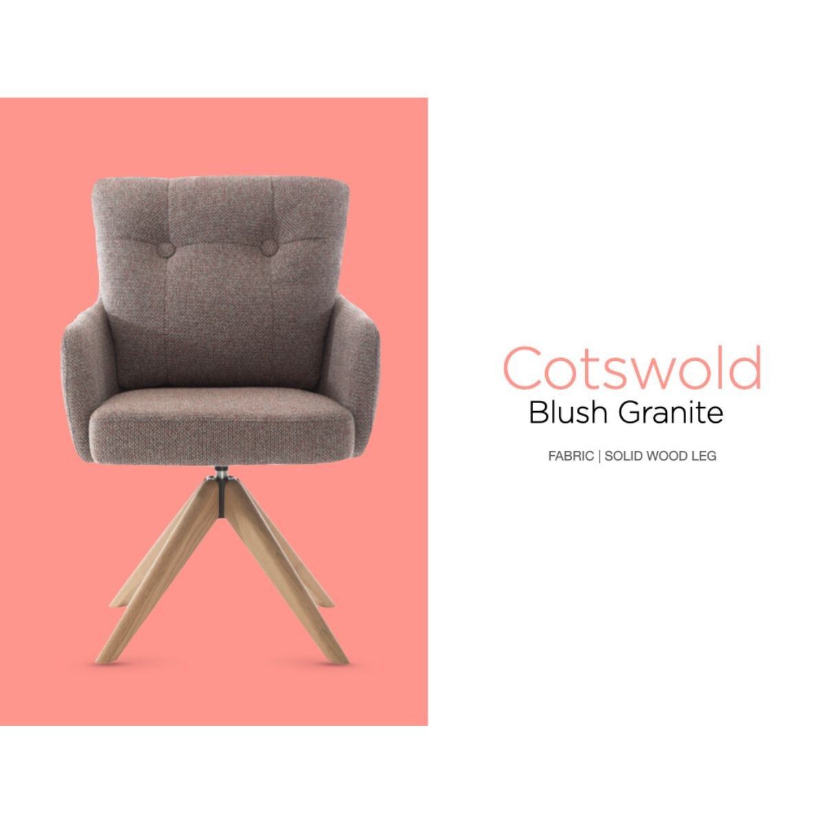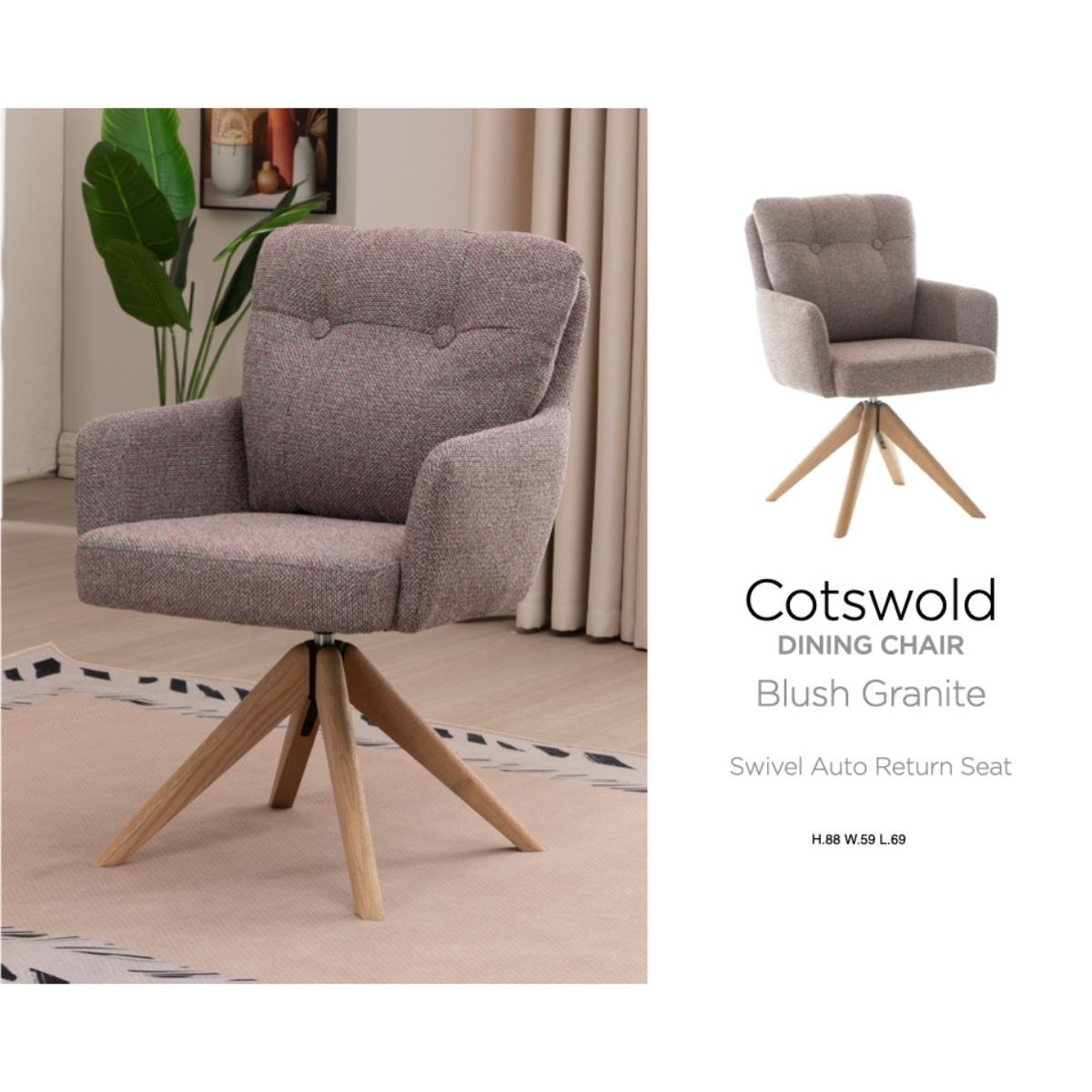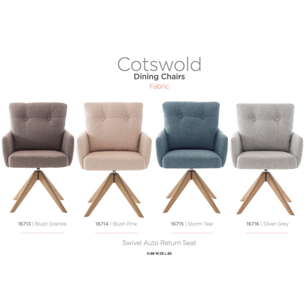 Reference: 16713The Cotswold range blends contemporary elegance with timeless craftsmanship. Crafted from solid wood in a beautiful oak finish, these stools and chairs feature an auto-swivel return seat for added functionality. Upholstered in a choice of four curated fabric colours—blush pink, blush granite, storm teal, and silver grey—the Cotswold collection brings both comfort and sophistication to your dining or bar space.