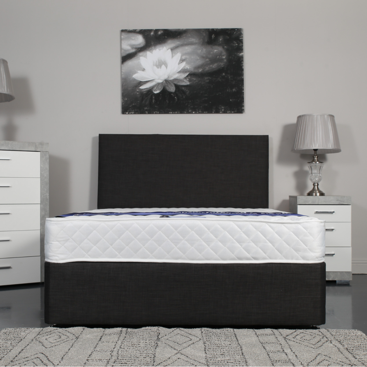 Reference: DWM46D105XThe Dream World Designer Divan Base in charcoal offers a sleek and contemporary look, perfect for any bedroom style. Available with five drawer configurations or no drawers, it provides versatile storage solutions. Pair it with a matching headboard in the same luxurious fabric for a complete and cohesive design.