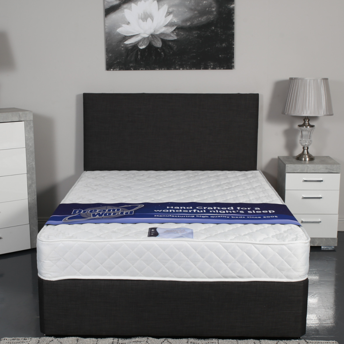 Reference: DWM50D105XThe Dream World Designer Divan Base in charcoal offers a sleek and contemporary look, perfect for any bedroom style. Available with five drawer configurations or no drawers, it provides versatile storage solutions. Pair it with a matching headboard in the same luxurious fabric for a complete and cohesive design.