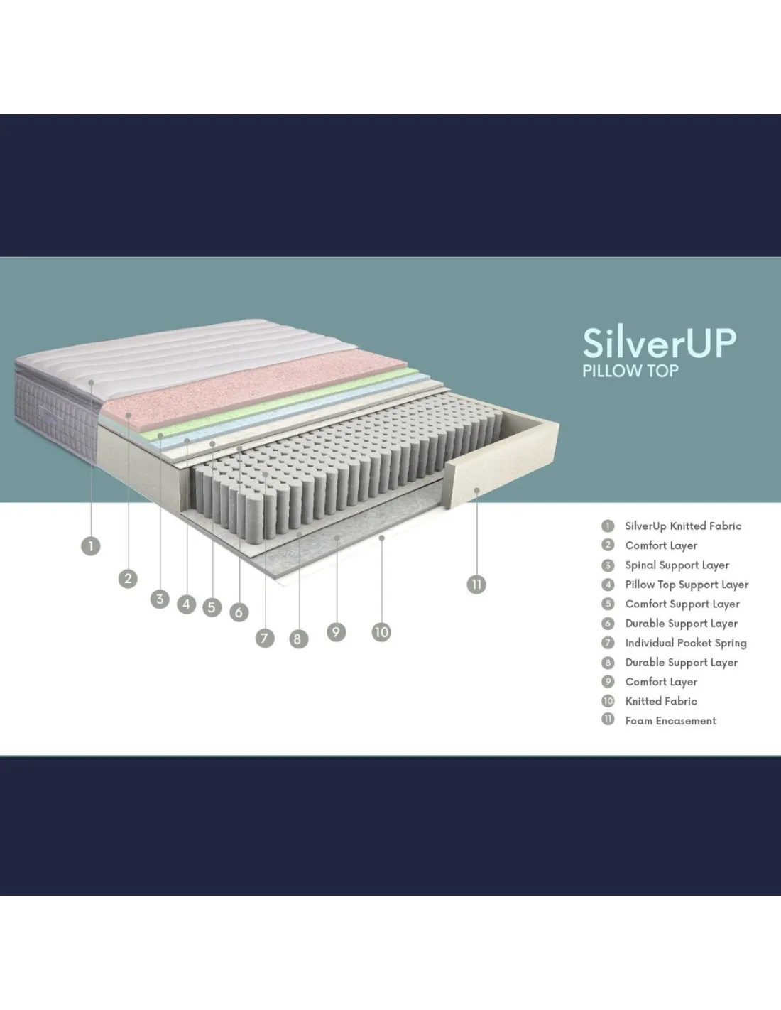 Experience the perfect balance of comfort and support with the Dormolito Silver Up Mattress. Designed for a restful night's sleep, this mattress features ladvanced materials that promote hygiene, durability and pressure relief. Its pocket spring system ensures targeted support, while the high-quality silver fabric enhances freshness and antibacterial protection.