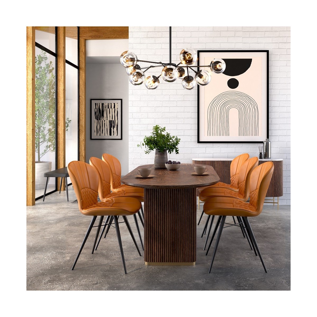 Reference: G6326Our Milo range accentuates its racetrack curves with dynamic ribbing. Multiple finishes provide harmonious contrast, tinting the solid mango to a warm coffee bean finish & leaving the marble top a natural hue. A brass-finished base elevates some of the pieces with round legs to complement the rounded silhouette. A push on the seamlessly integrated doors opens to inner storage to shelves.